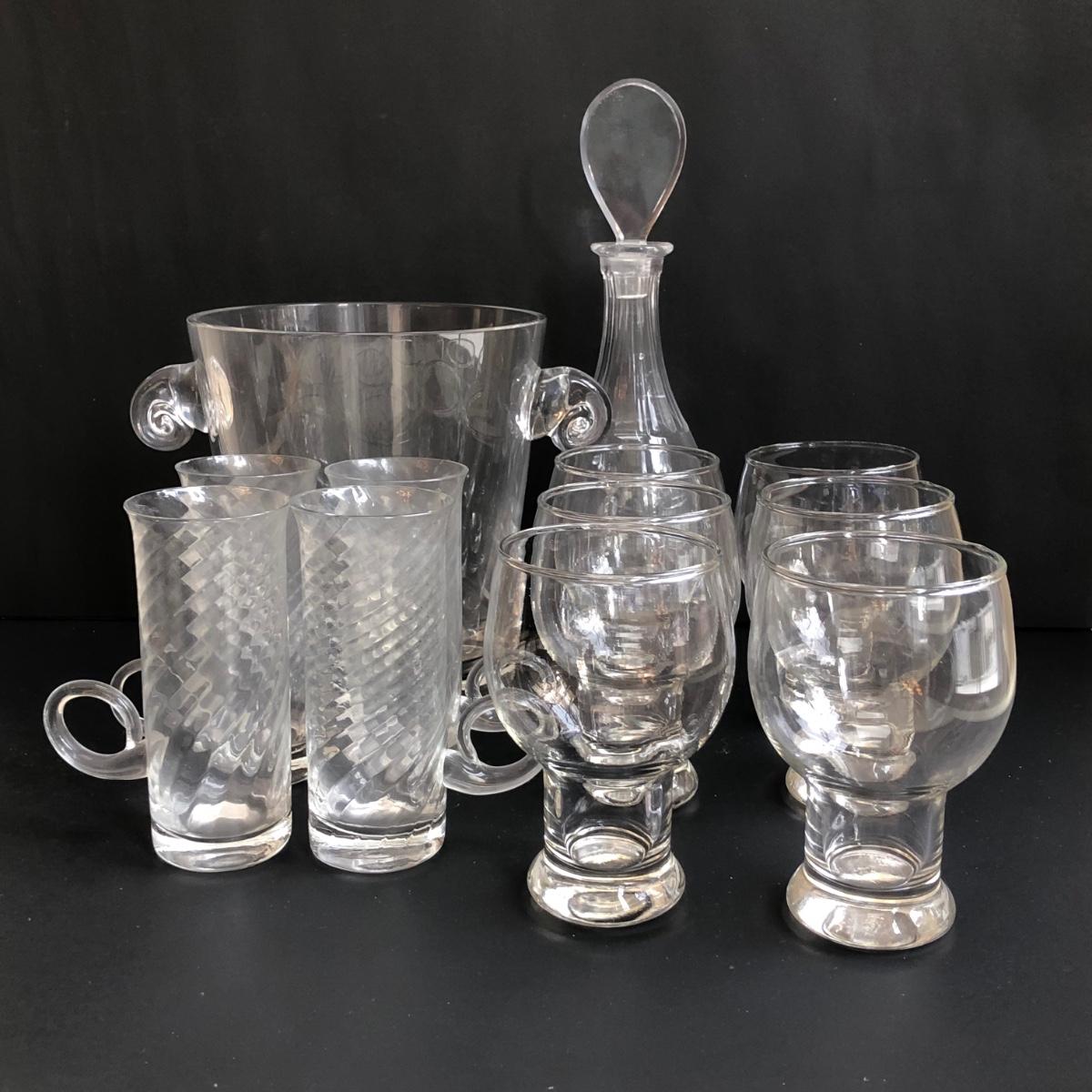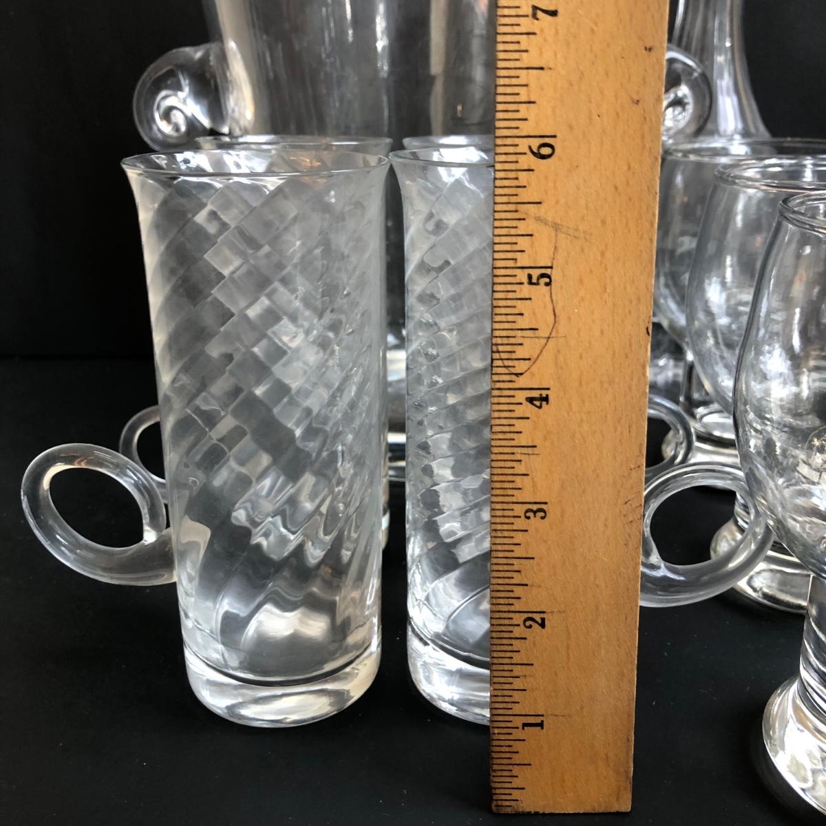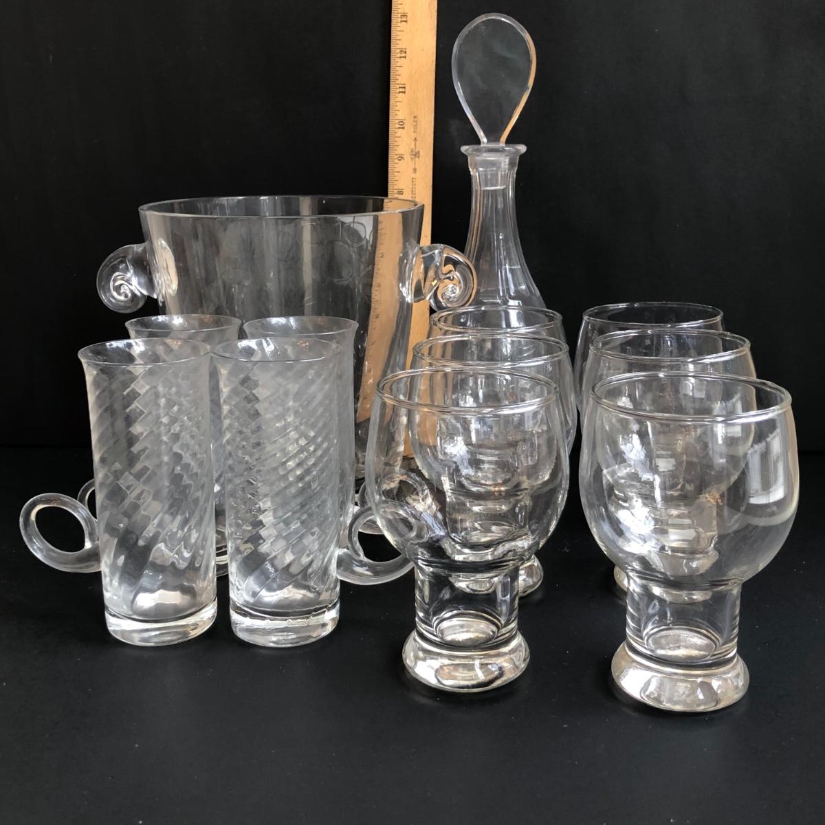 LOT 147K: MCM Hollow Stem Beer/Soda Glasses, Vintage Irish Glass Coffee Mugs, Crystal Decanter & Swirl Handle Ice Bucket
