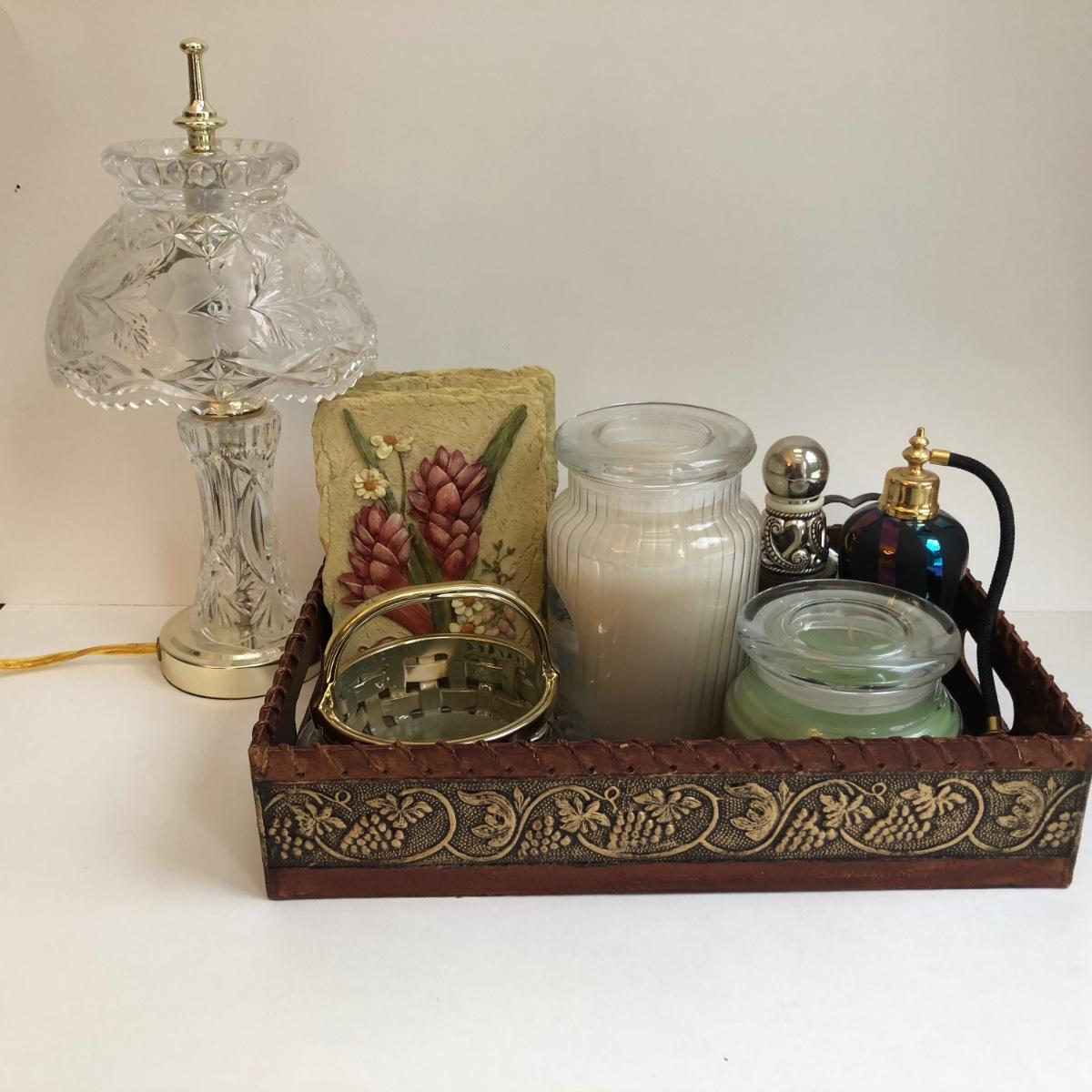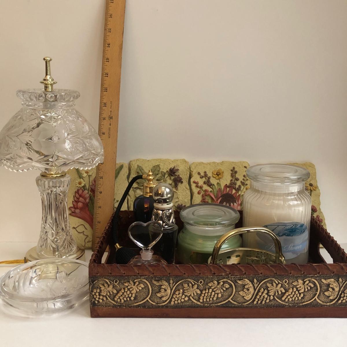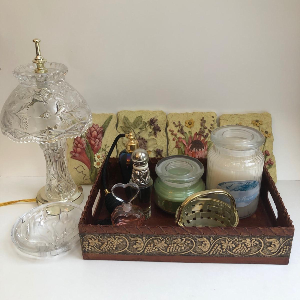 LOT 167X: Vanity Collection - Crystal Lamp, Unused Candles, Brighton Perfume, Floral Wall Art & More
