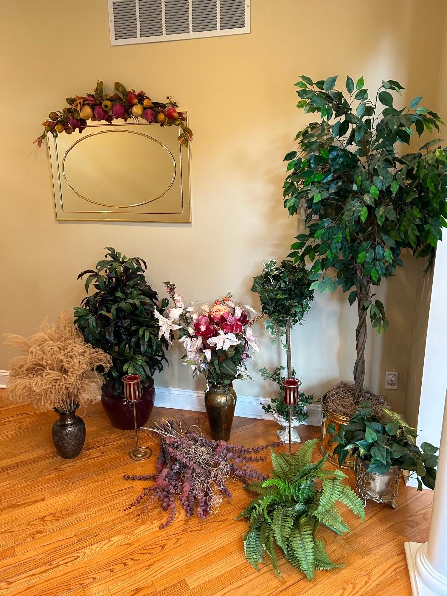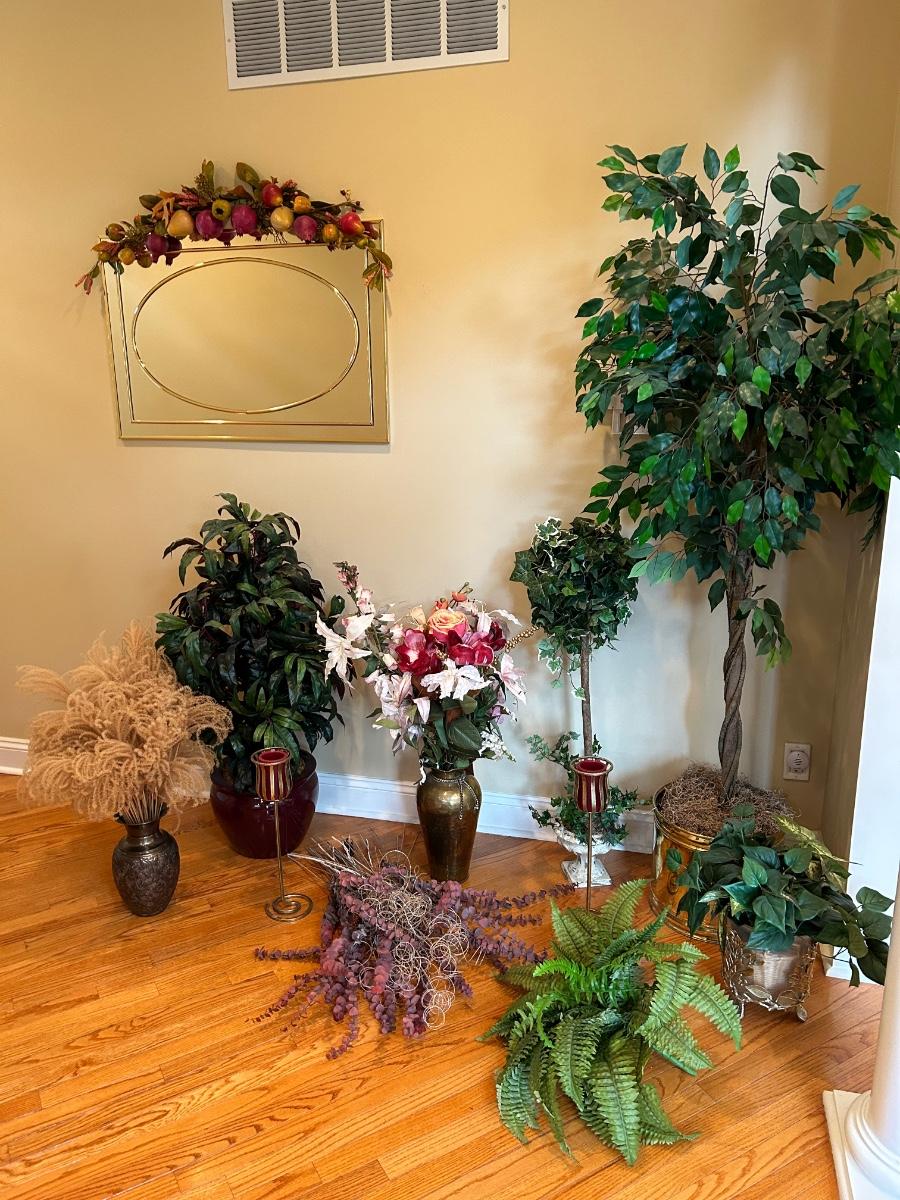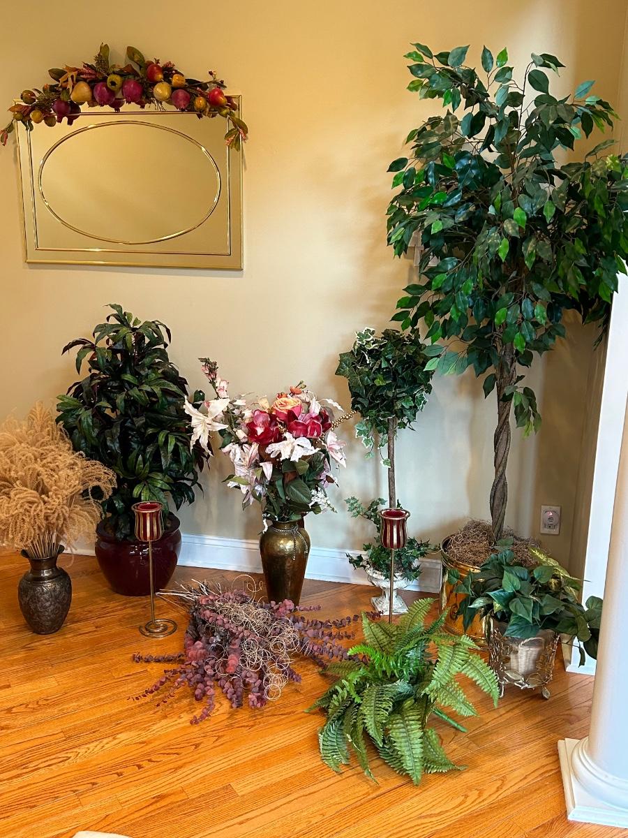 LOT 216FOY: Large Collection Of Faux Trees, Plants And Flowers