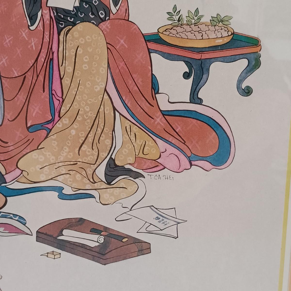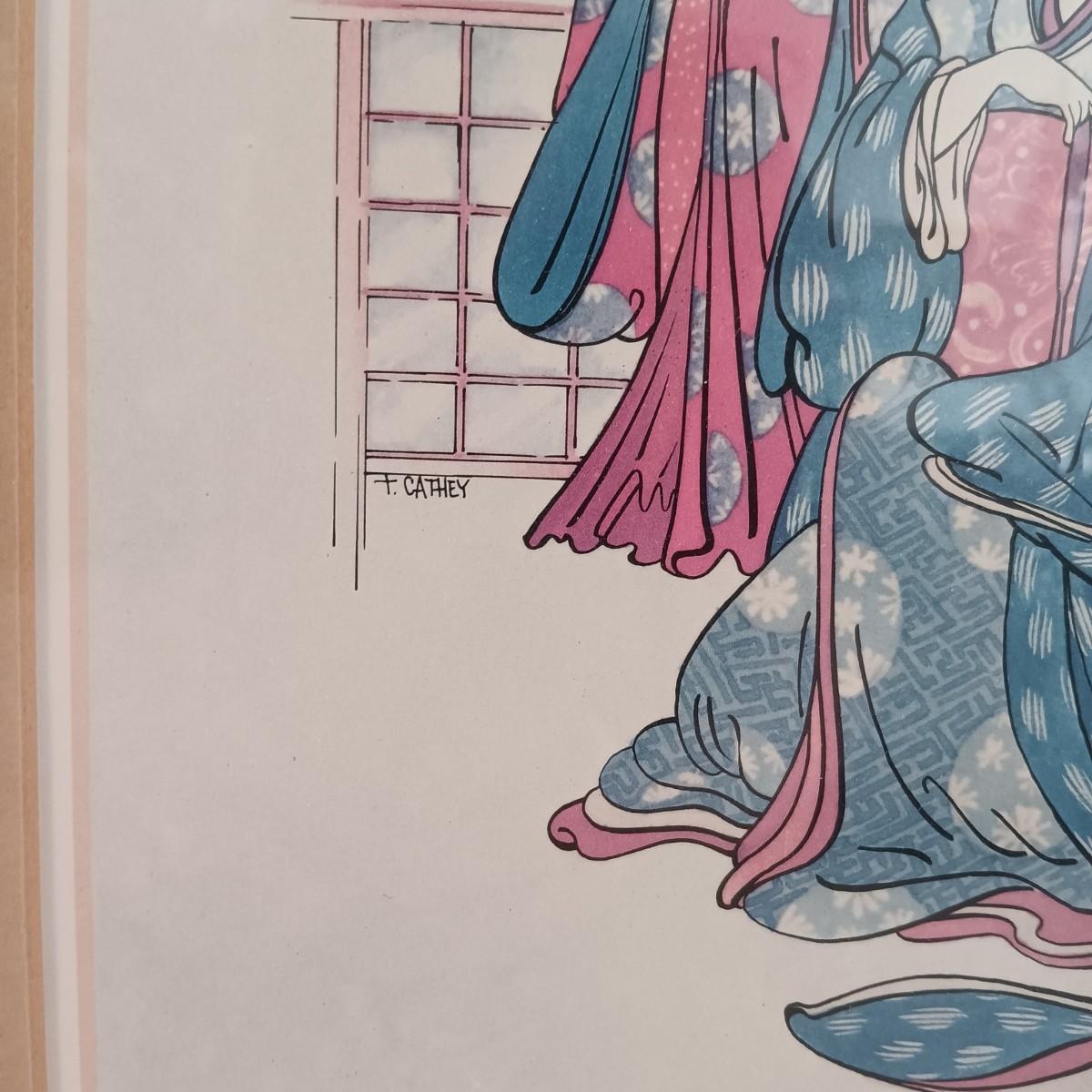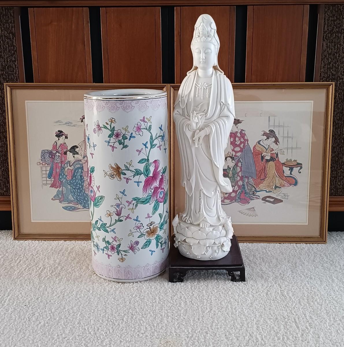 LOT 9L: Thomas Cathey Geisha Prints with Umbrella Stand & Goddess Kuan Yin Statue