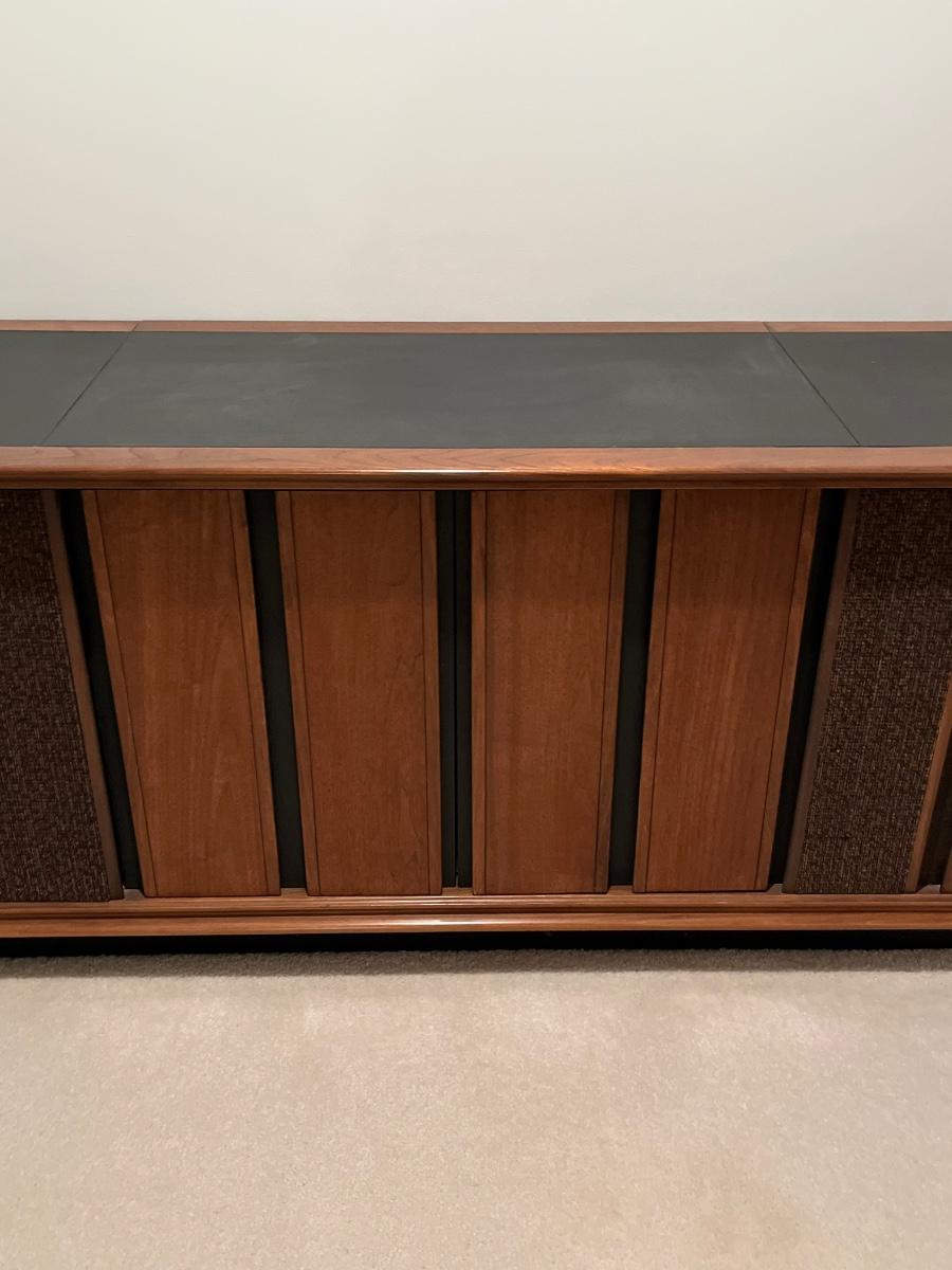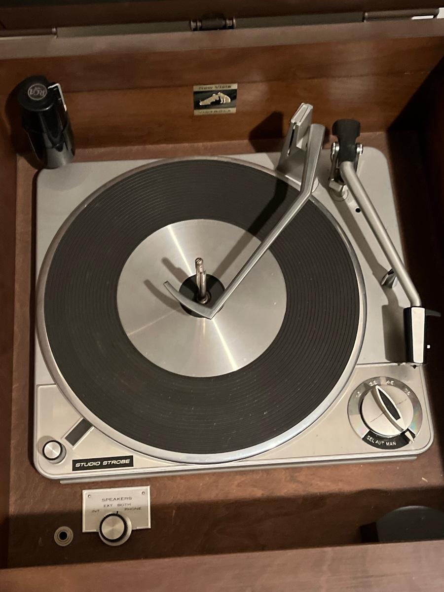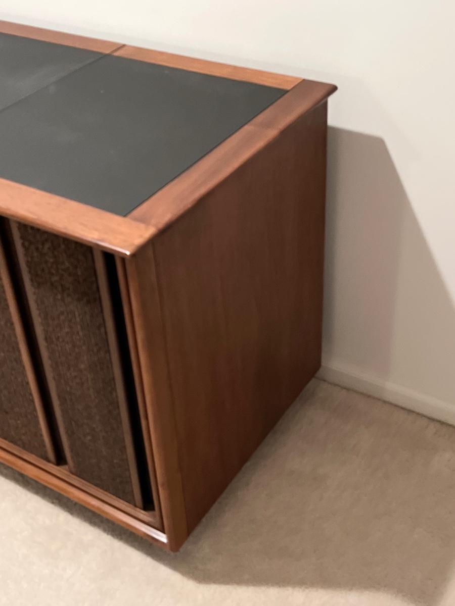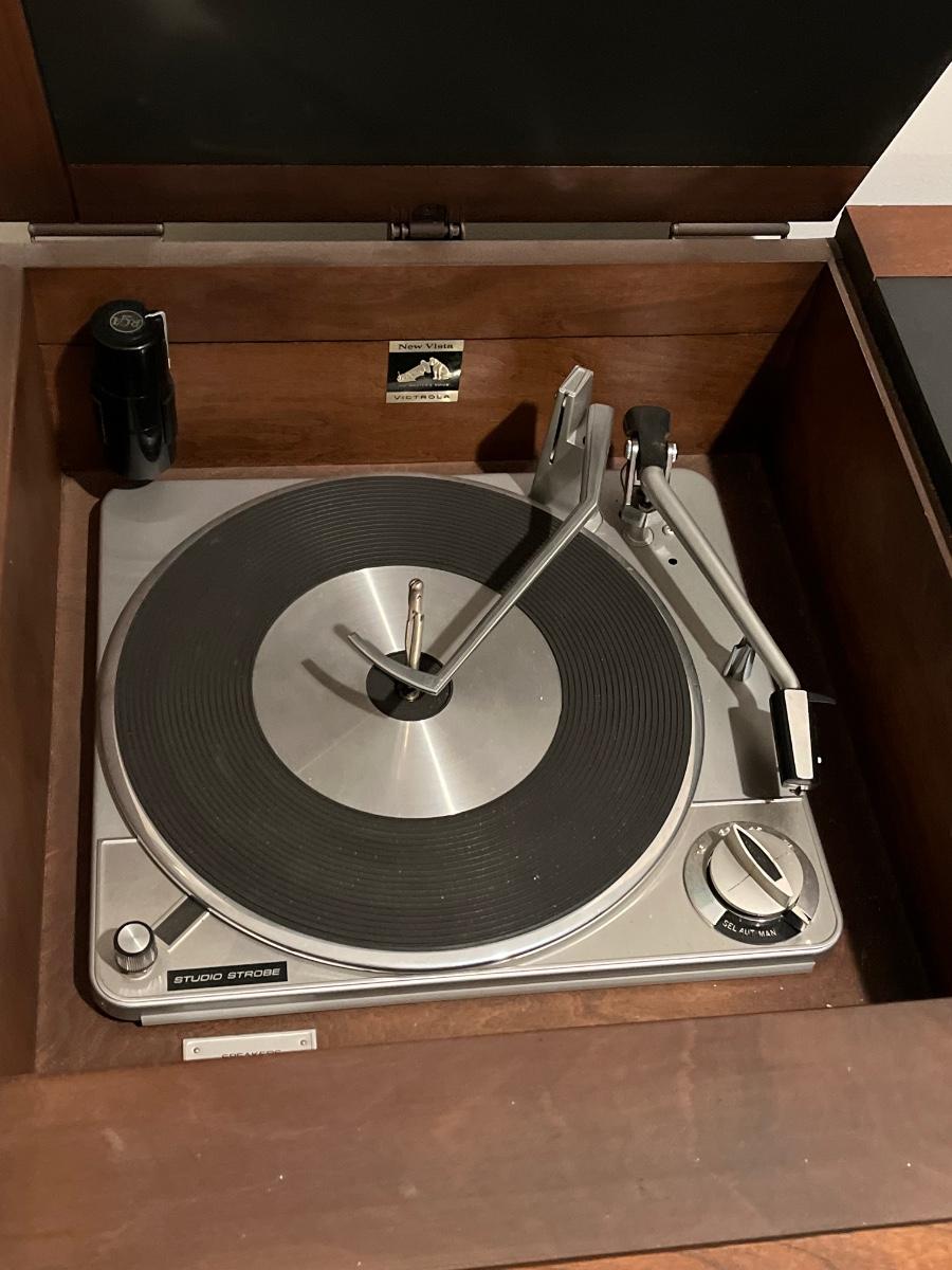 Has record player and speakers on at least one side.