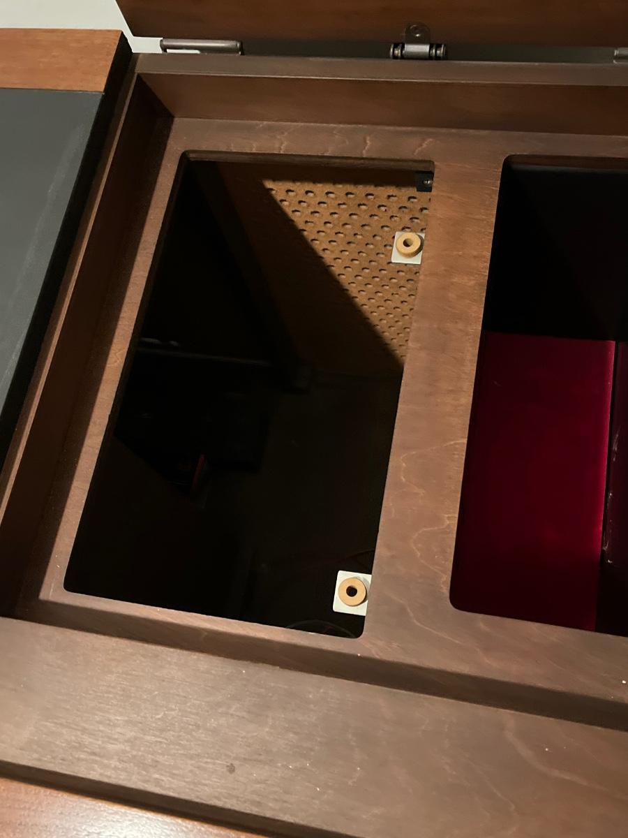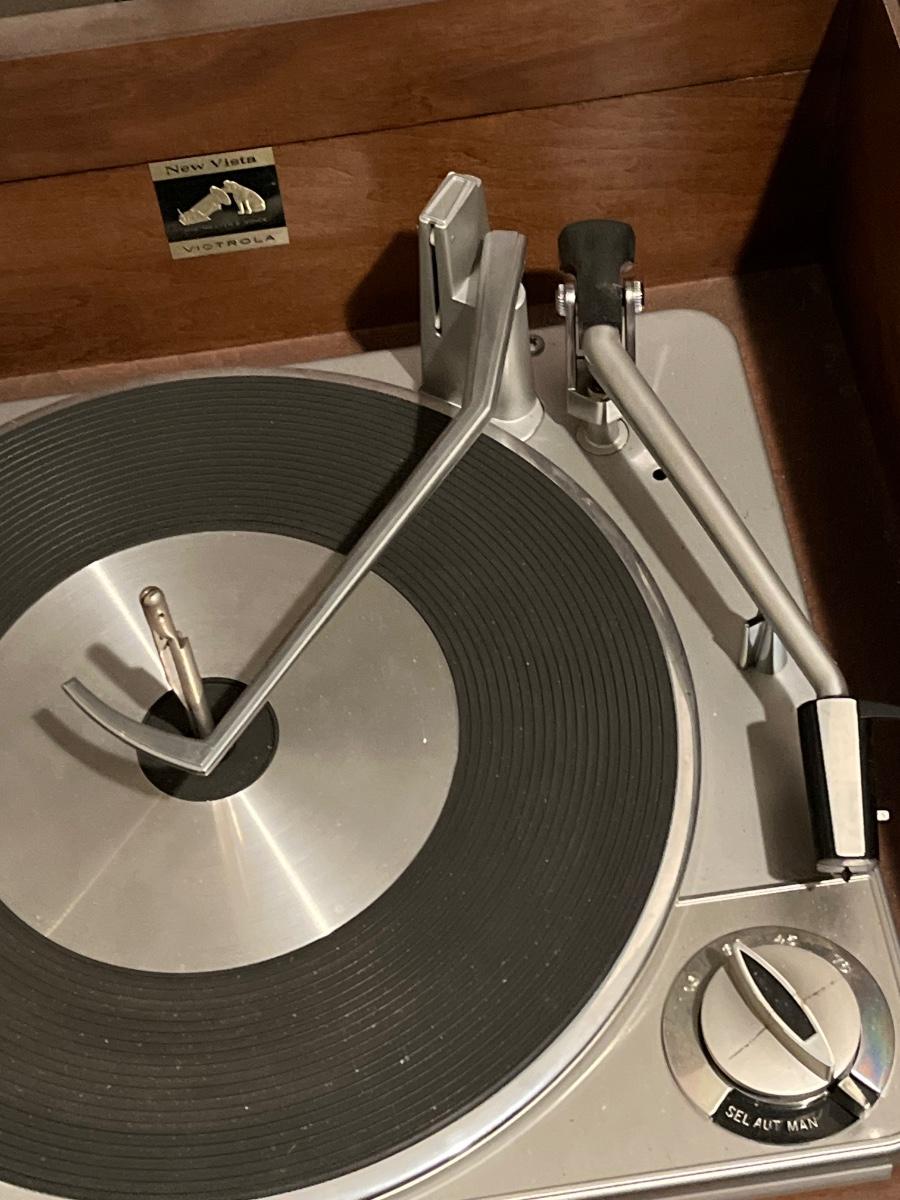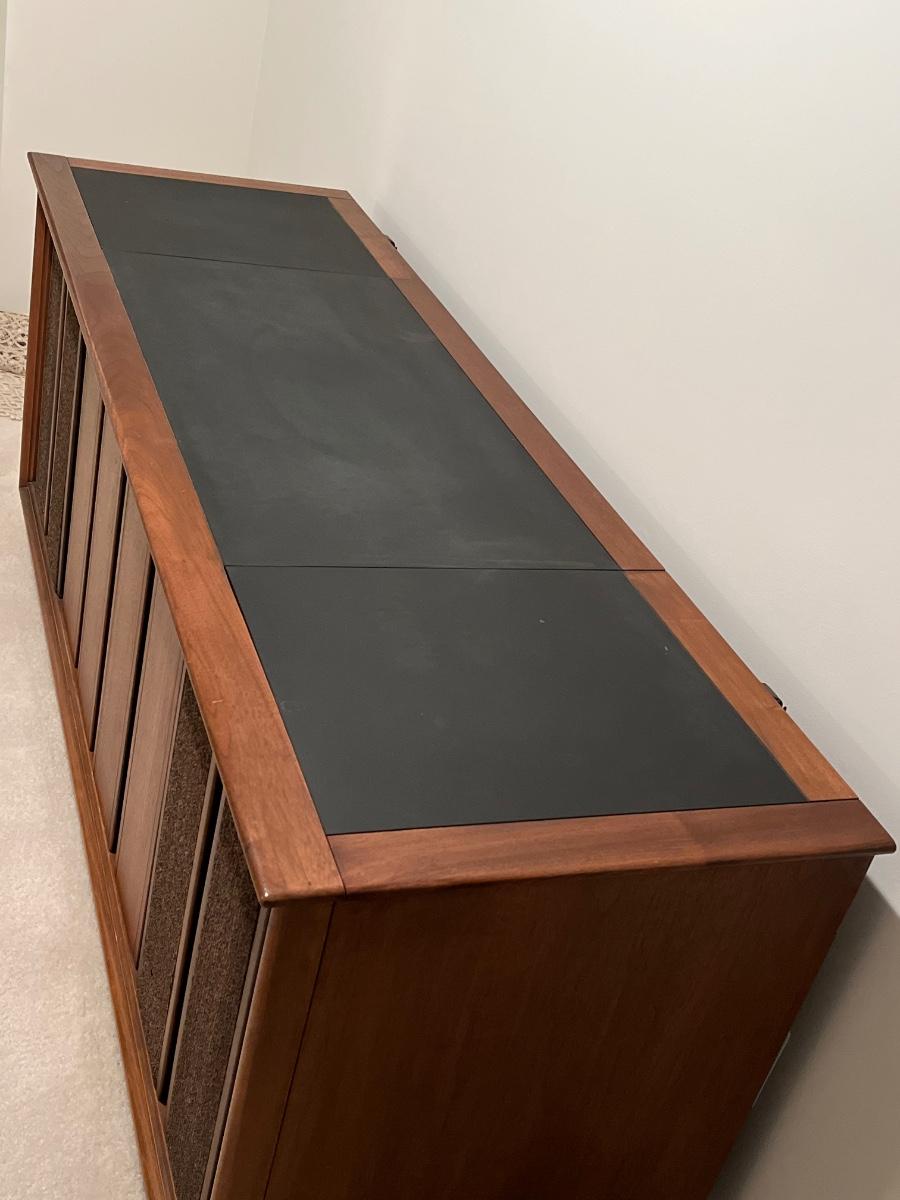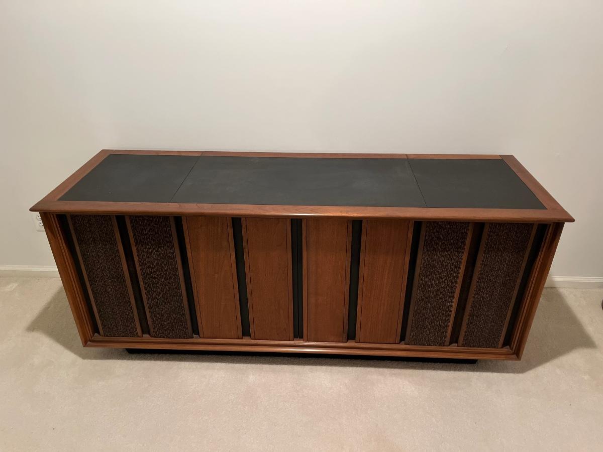 Has record player and speakers on at least one side.