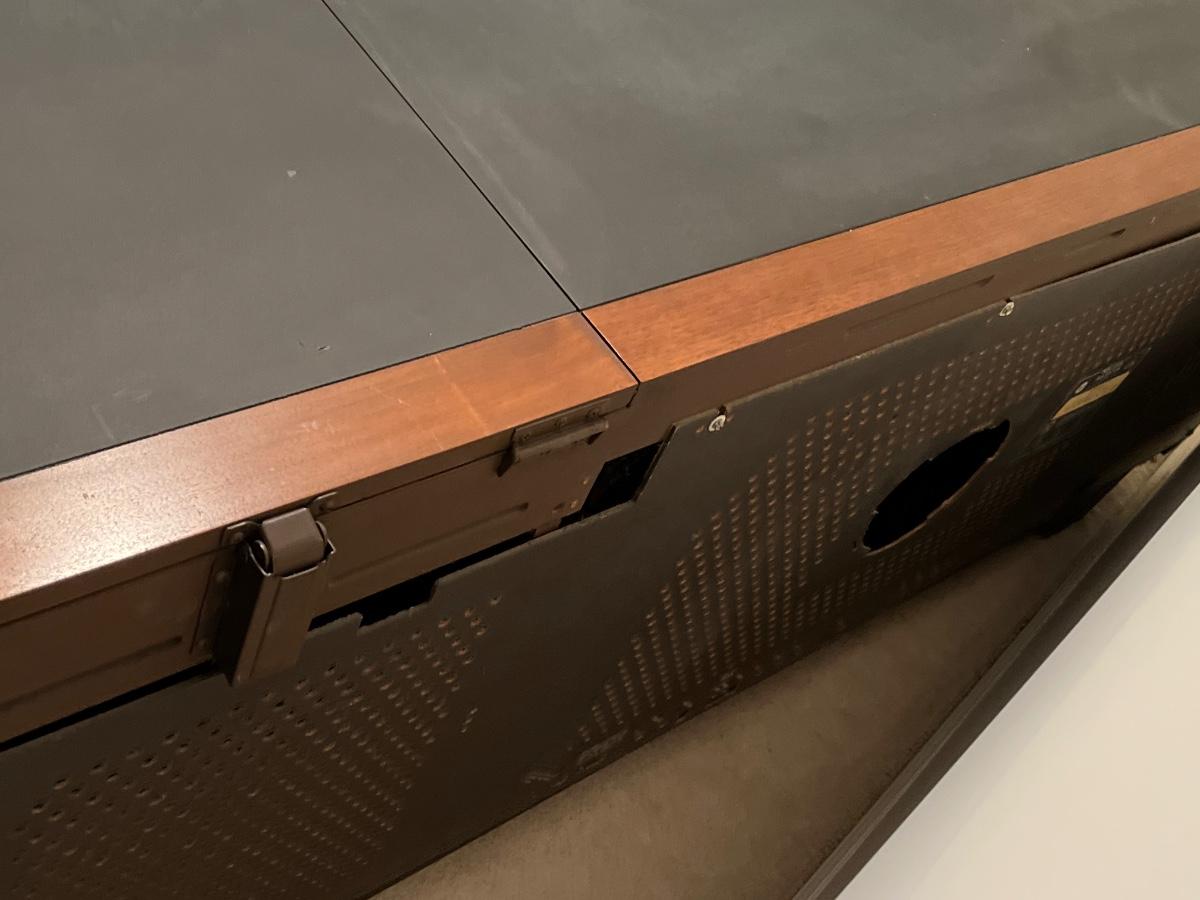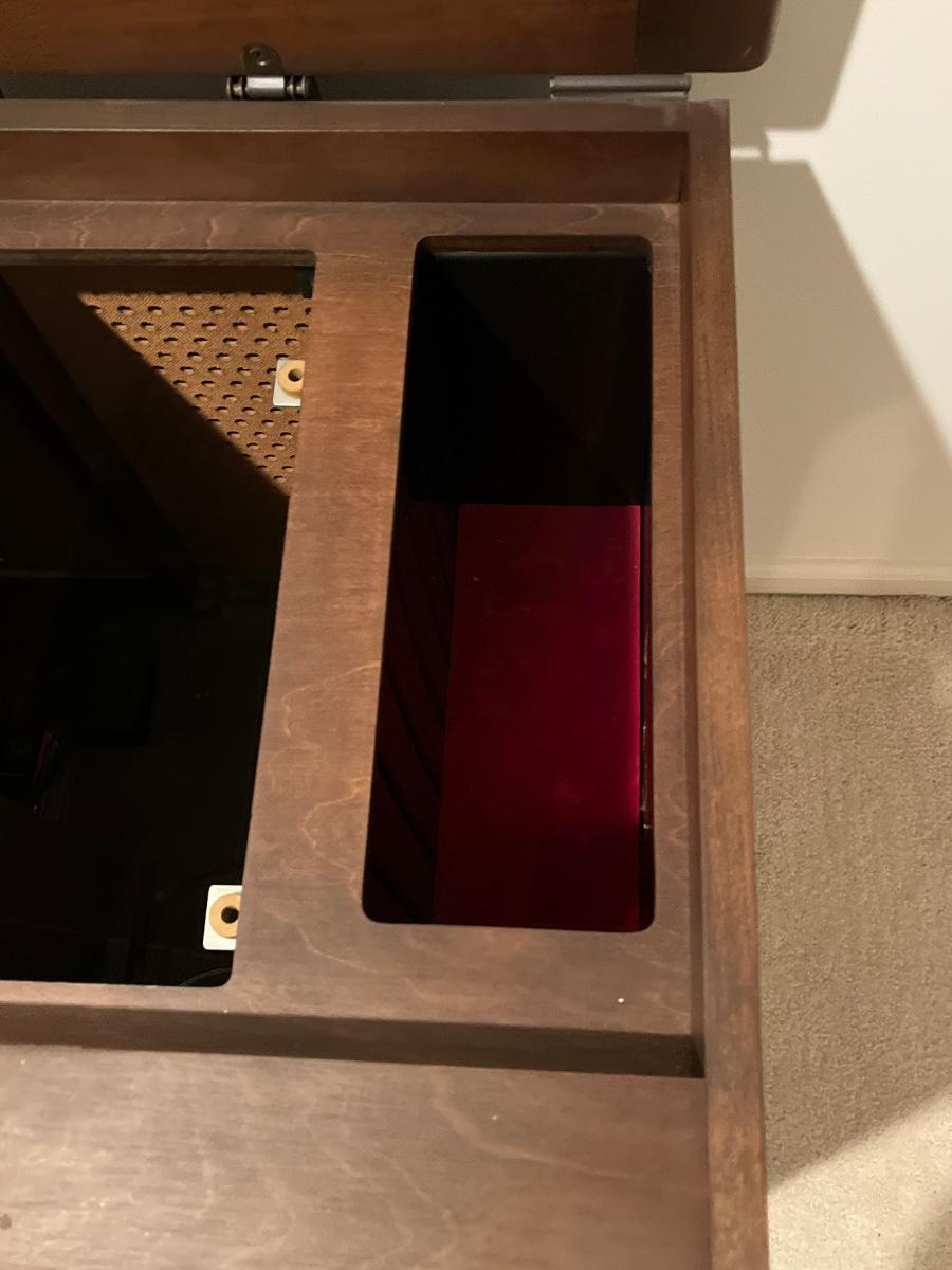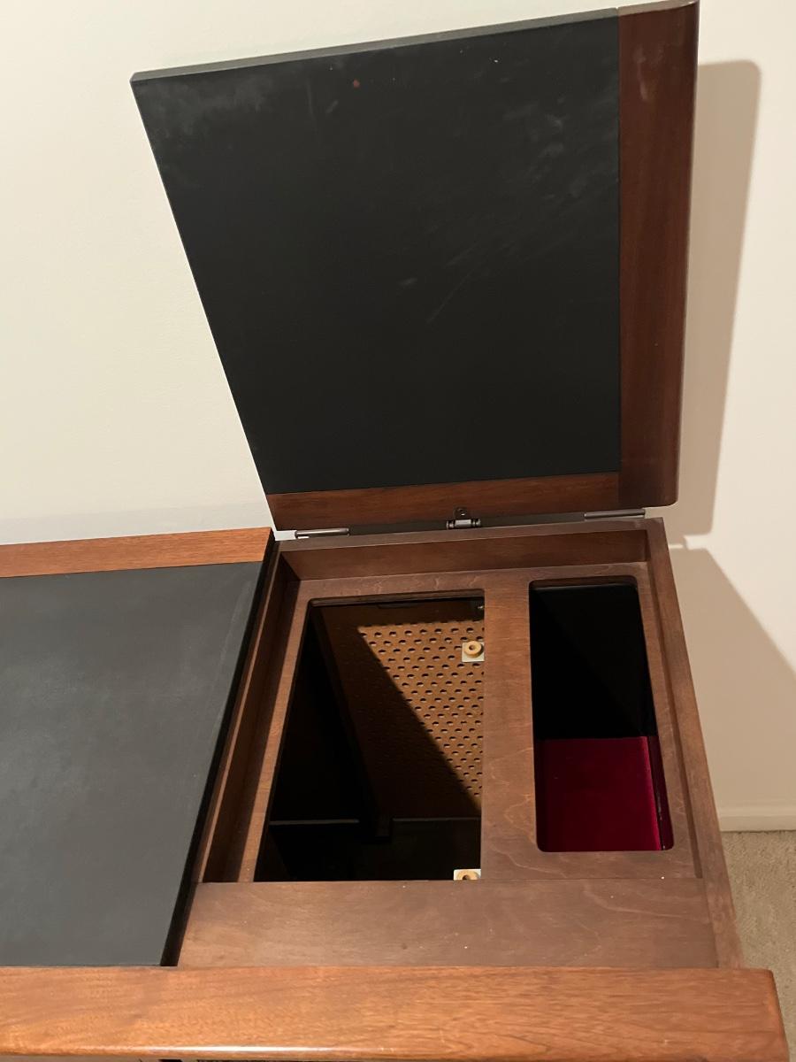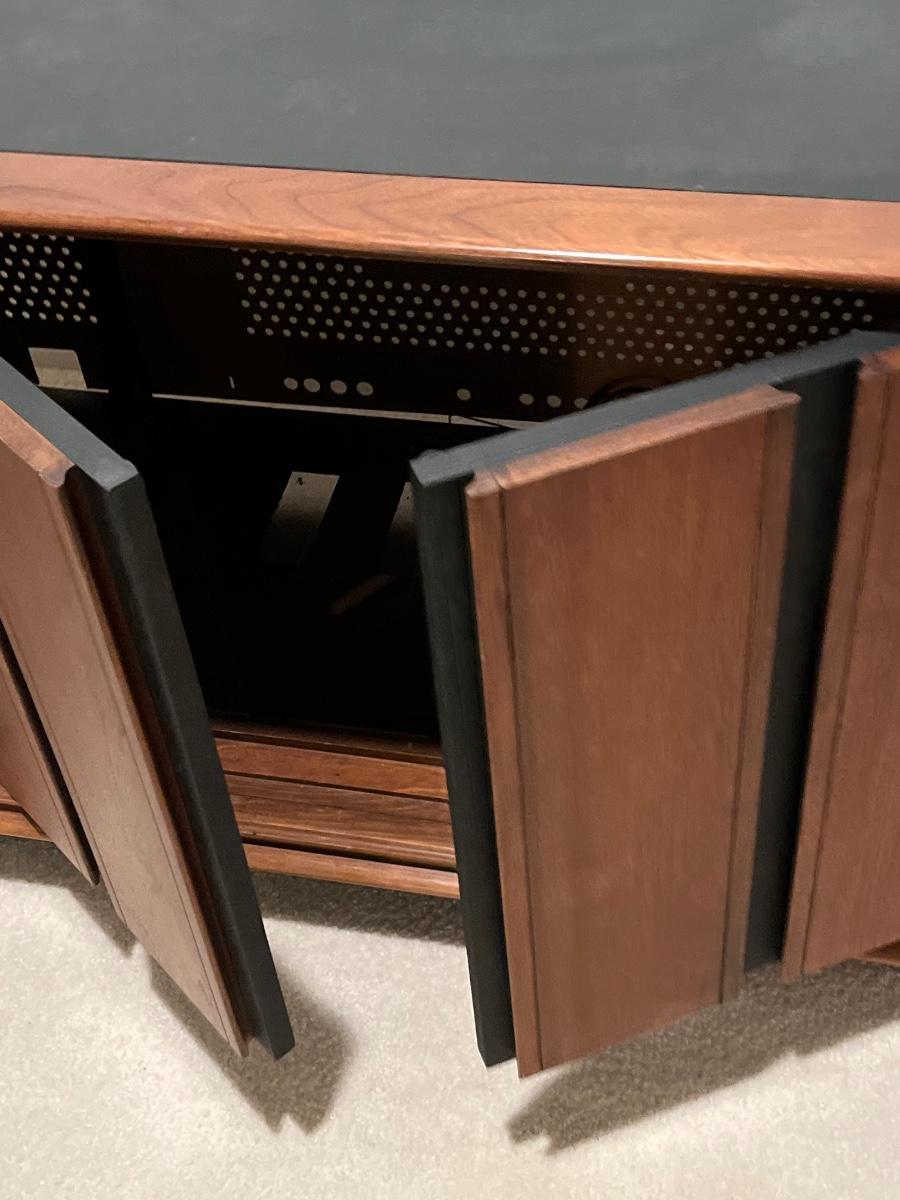 Has record player and speakers on at least one side.