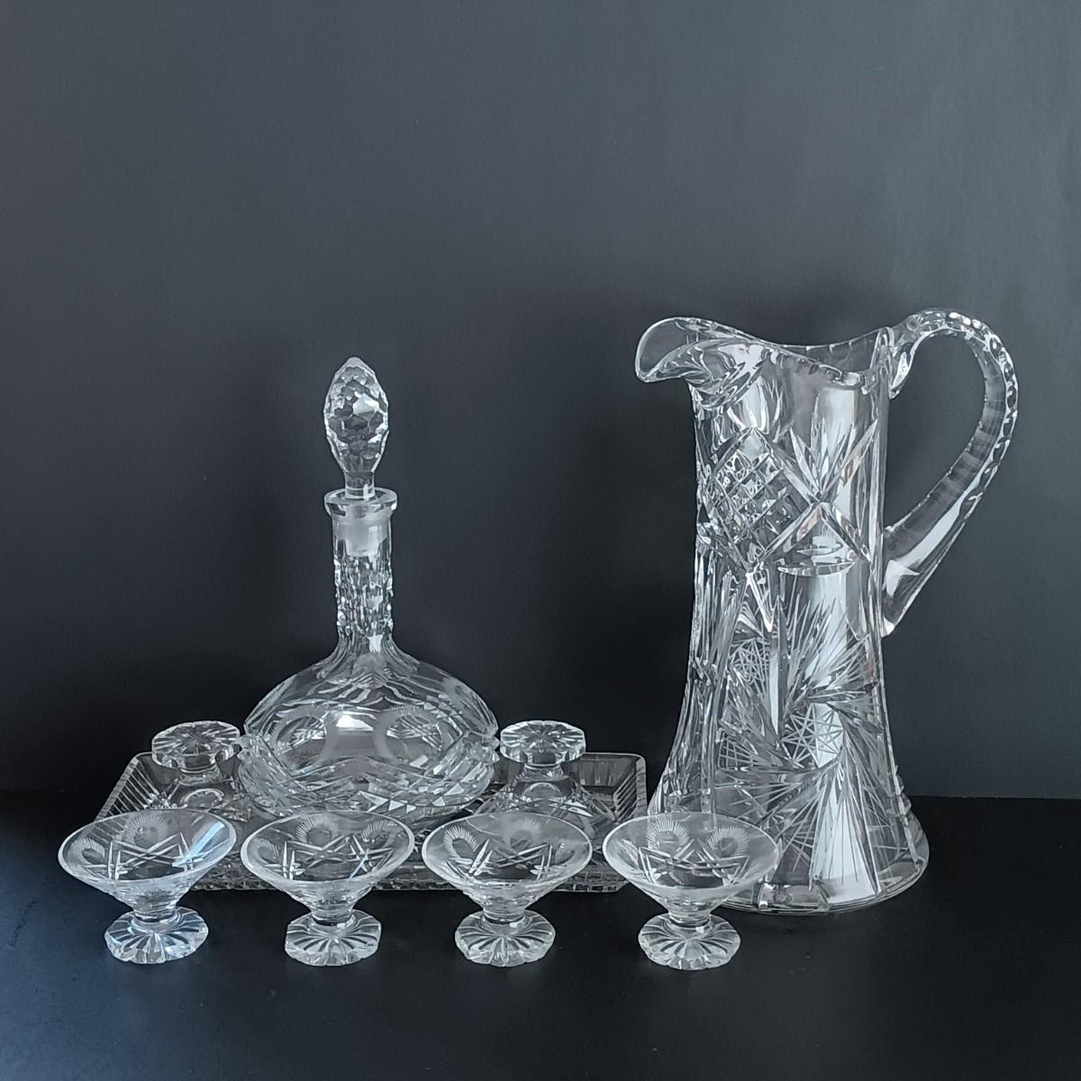 LOT 84K: Crystal Collection- Decanter, Dessert Cups, Pitcher and Tray