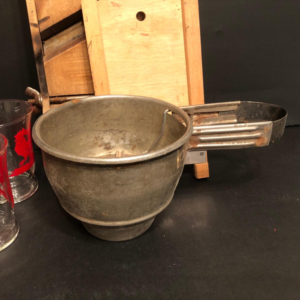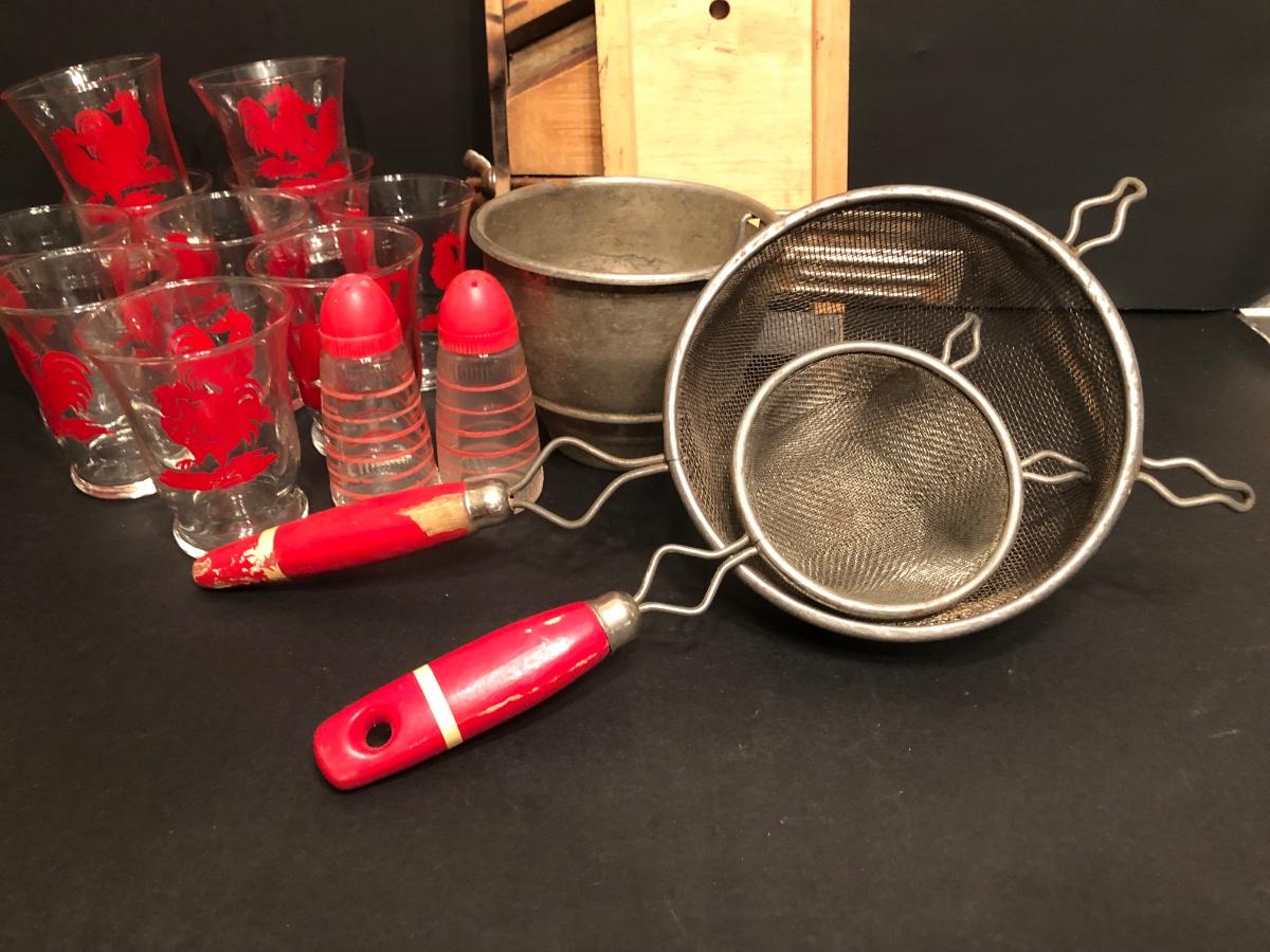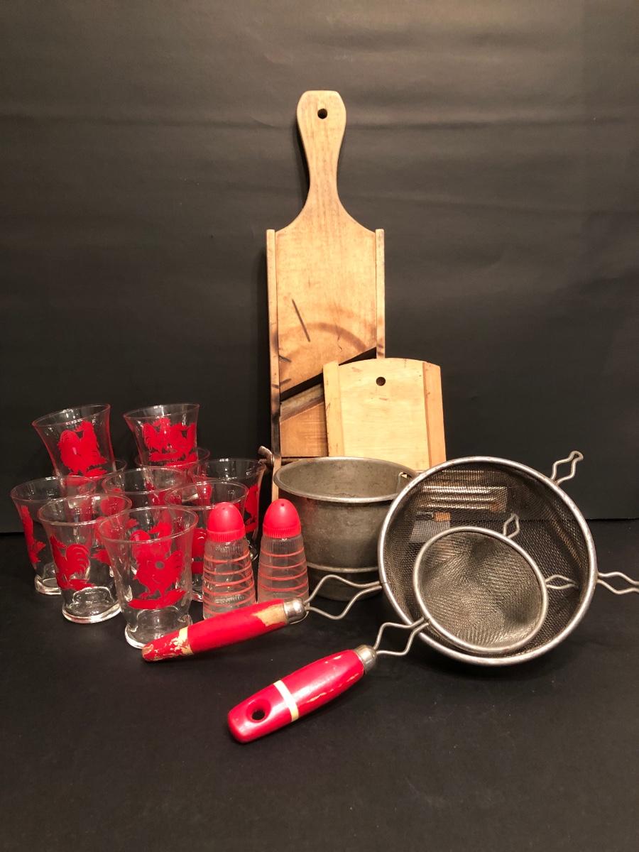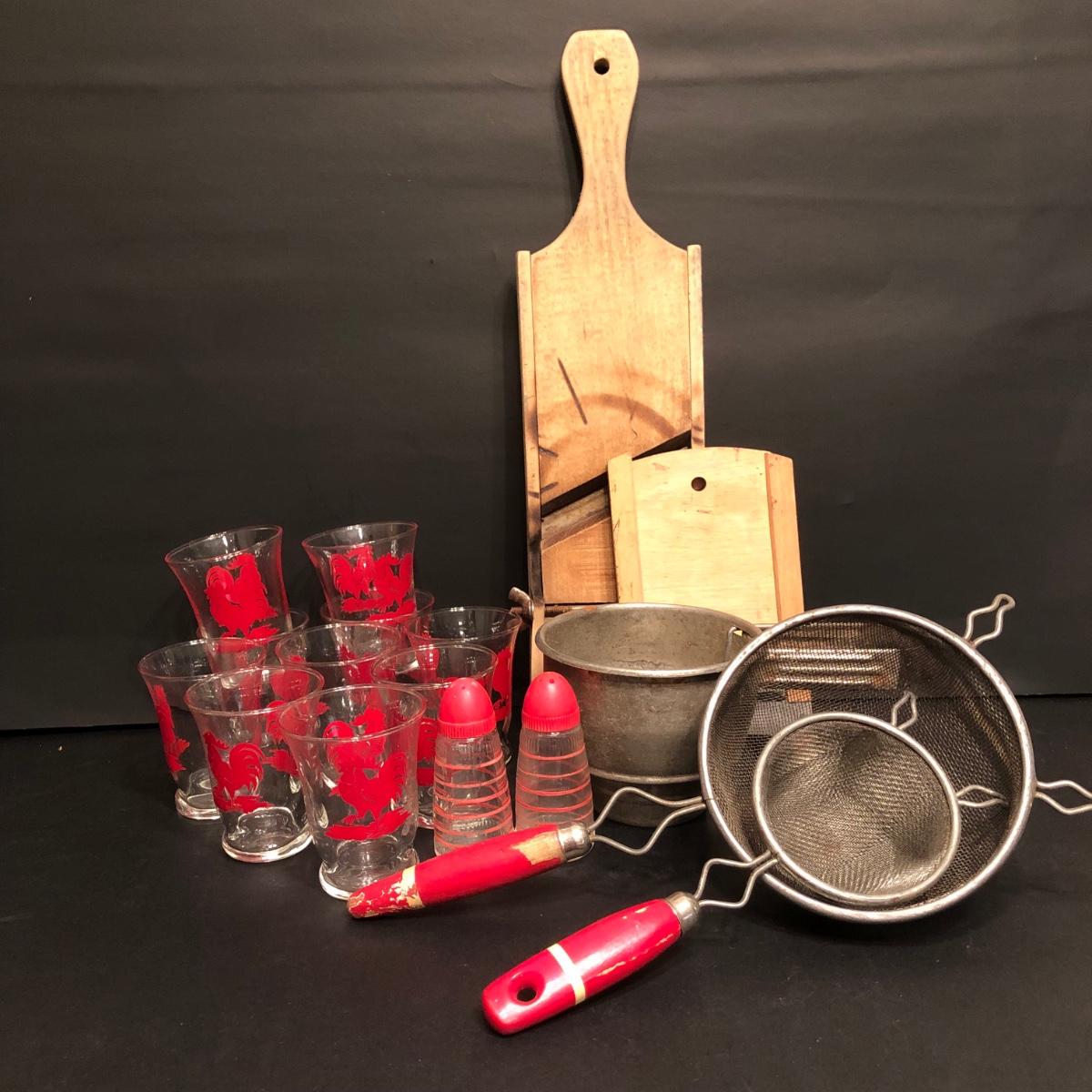 LOT 13M: Red Rooster Juice Glasses, Veggie Slicers & Vintage Sifters