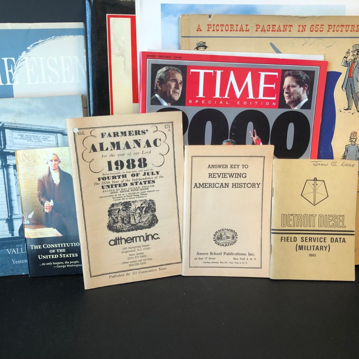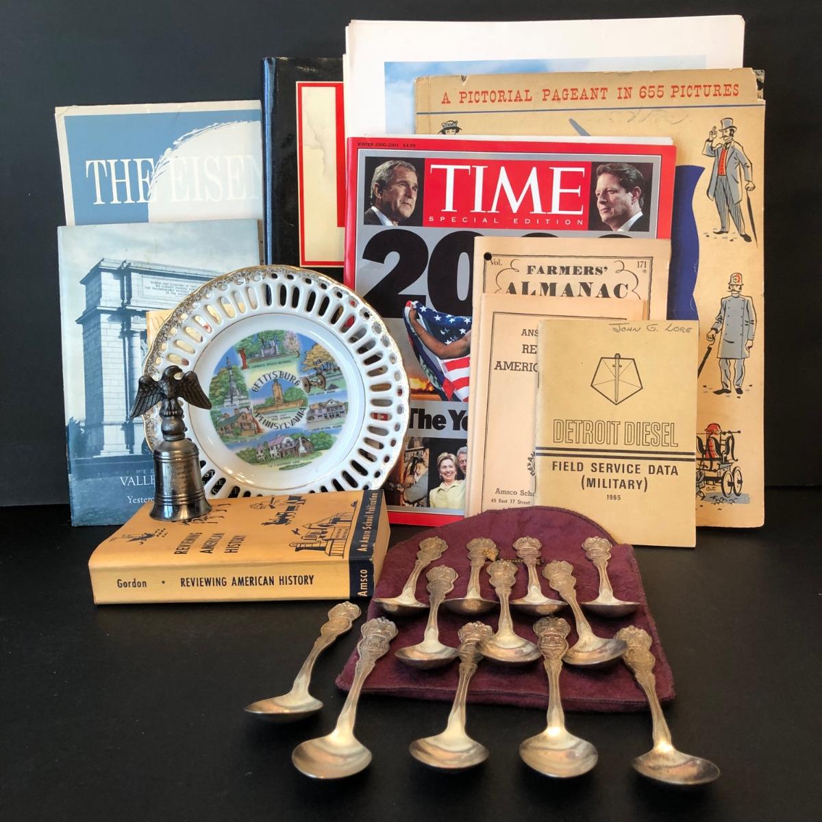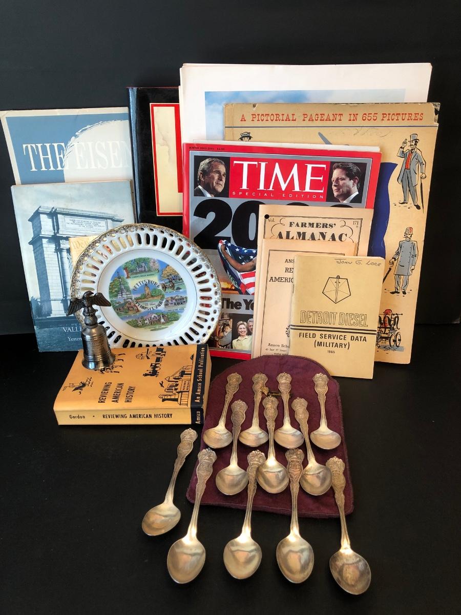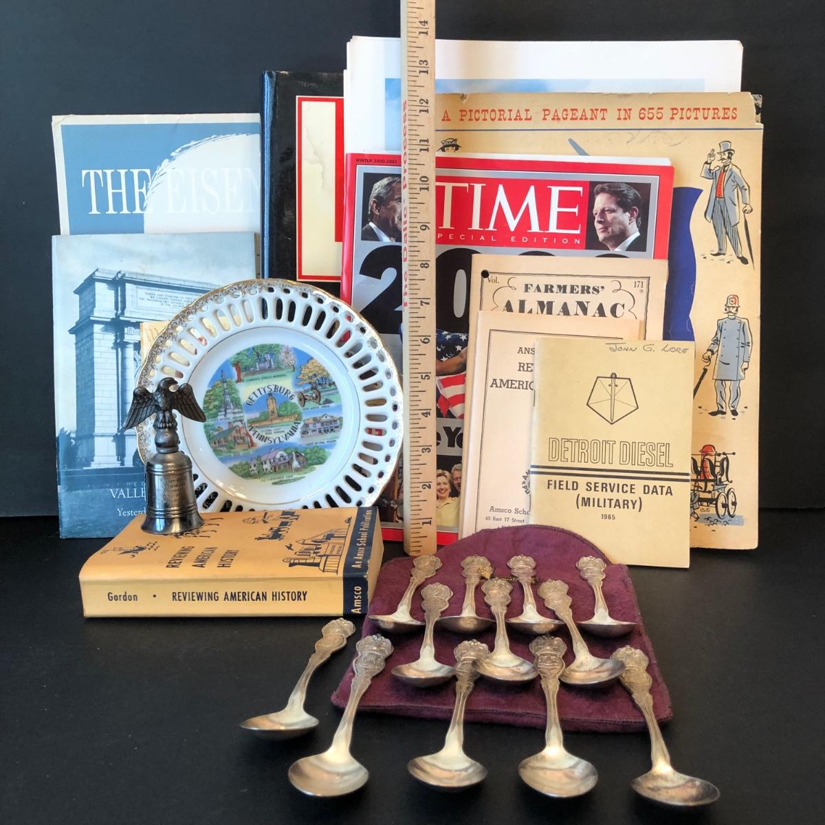 LOT 21M: US History Collection - Books, Time Magazine, Eisenhower Paintings, Colonies Spoons (12), Gettysburg Plate & More