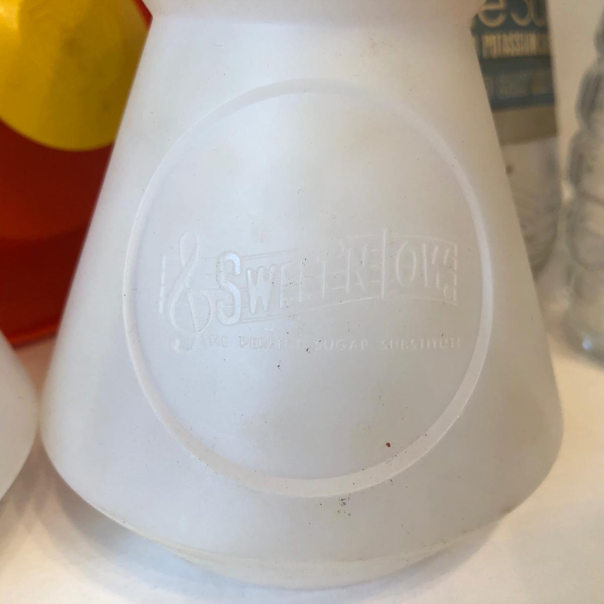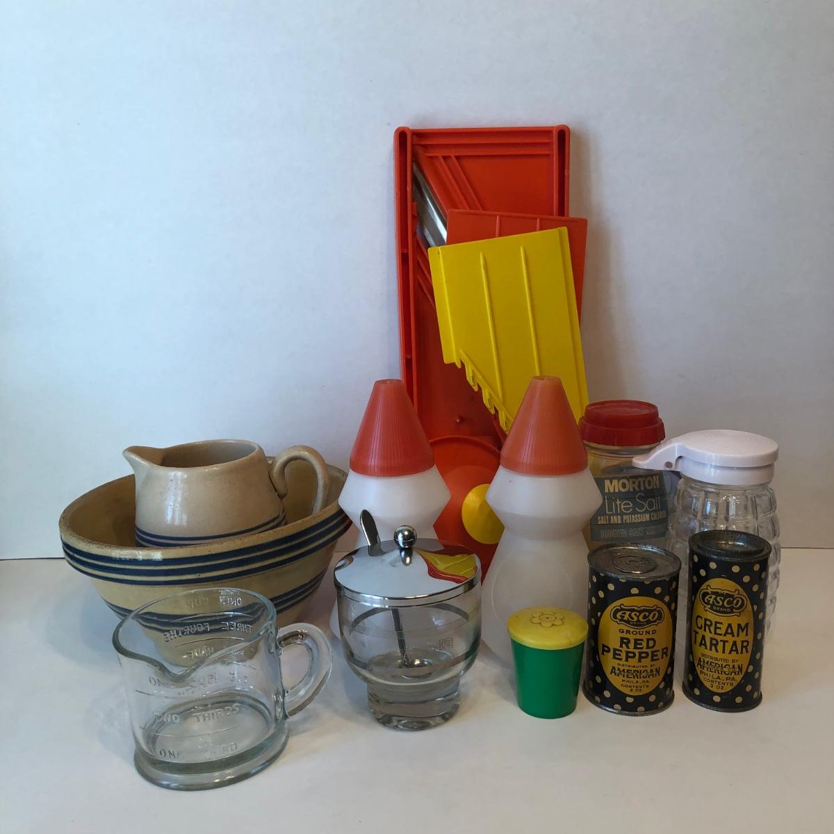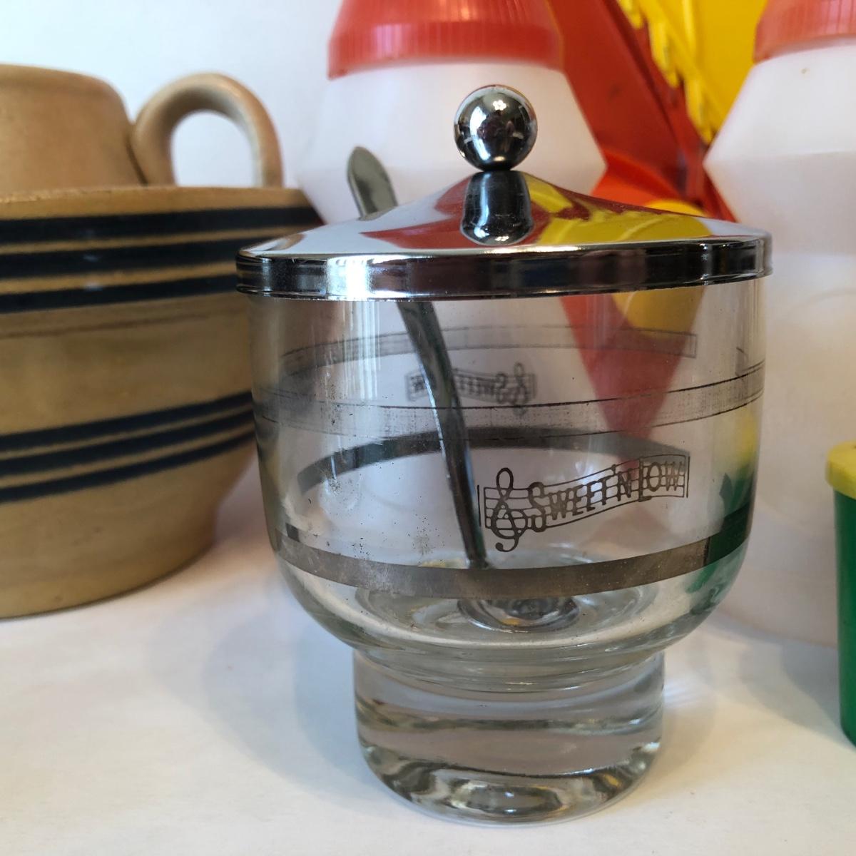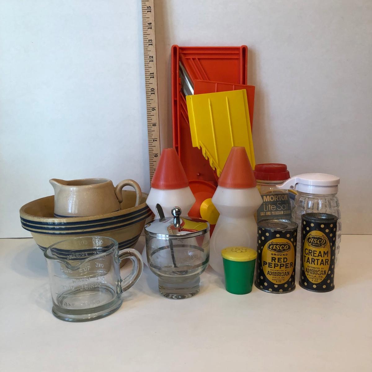 LOT 24M: Vintage Kitchen Collection - Sweet N Low Sugar Bowl & Plastic Dispensers, Asco Spices, Blue Striped YellowWare & More