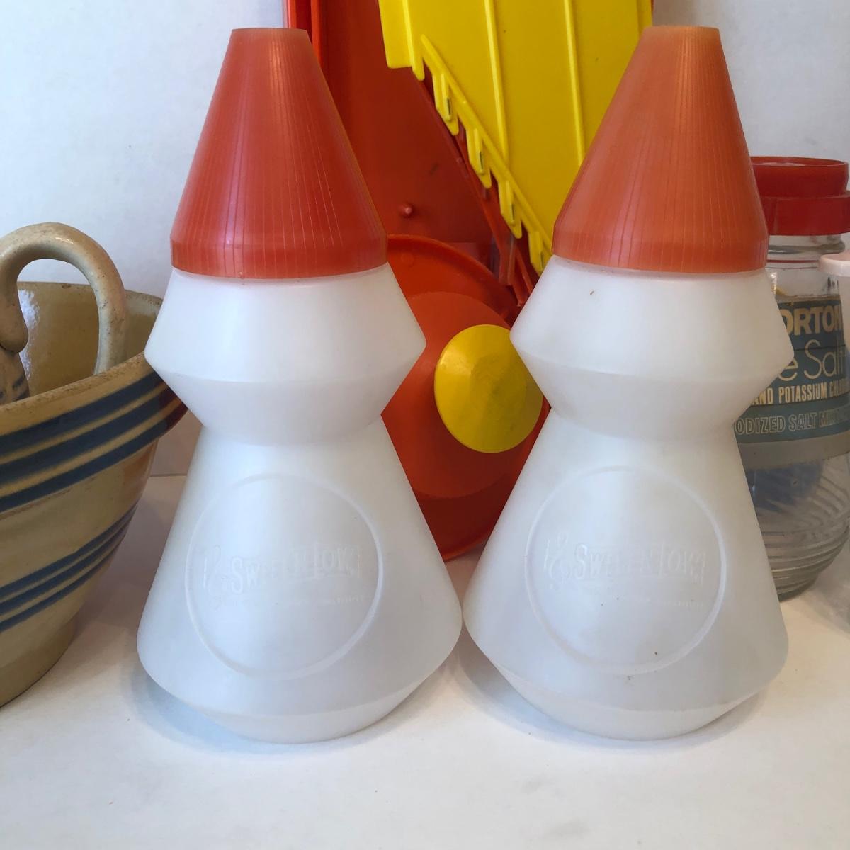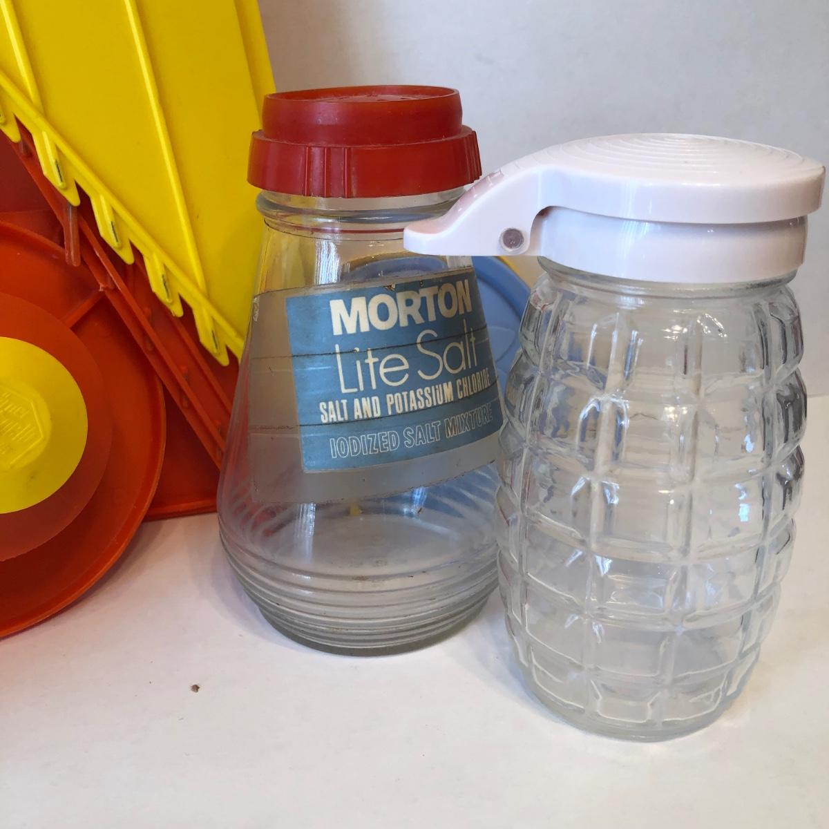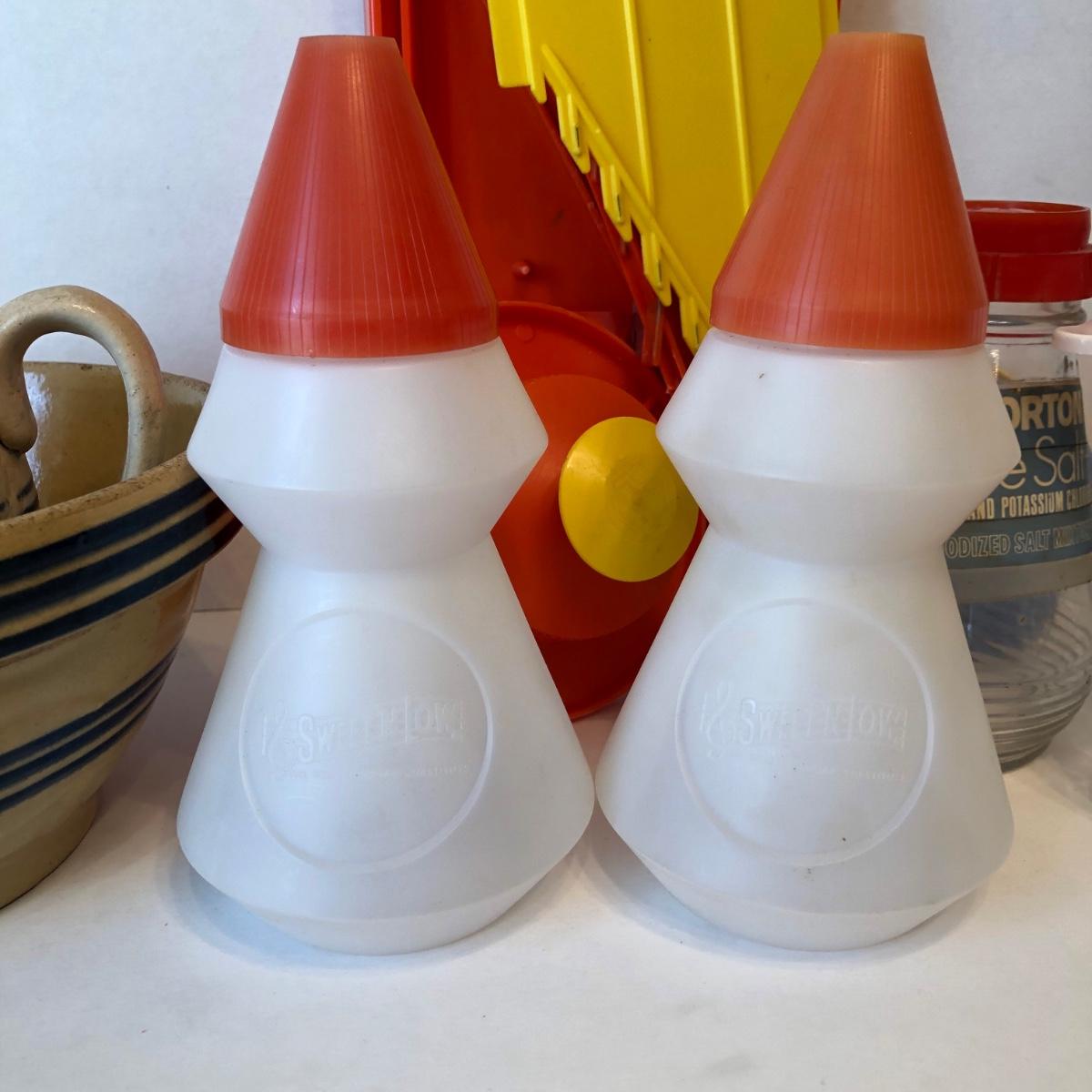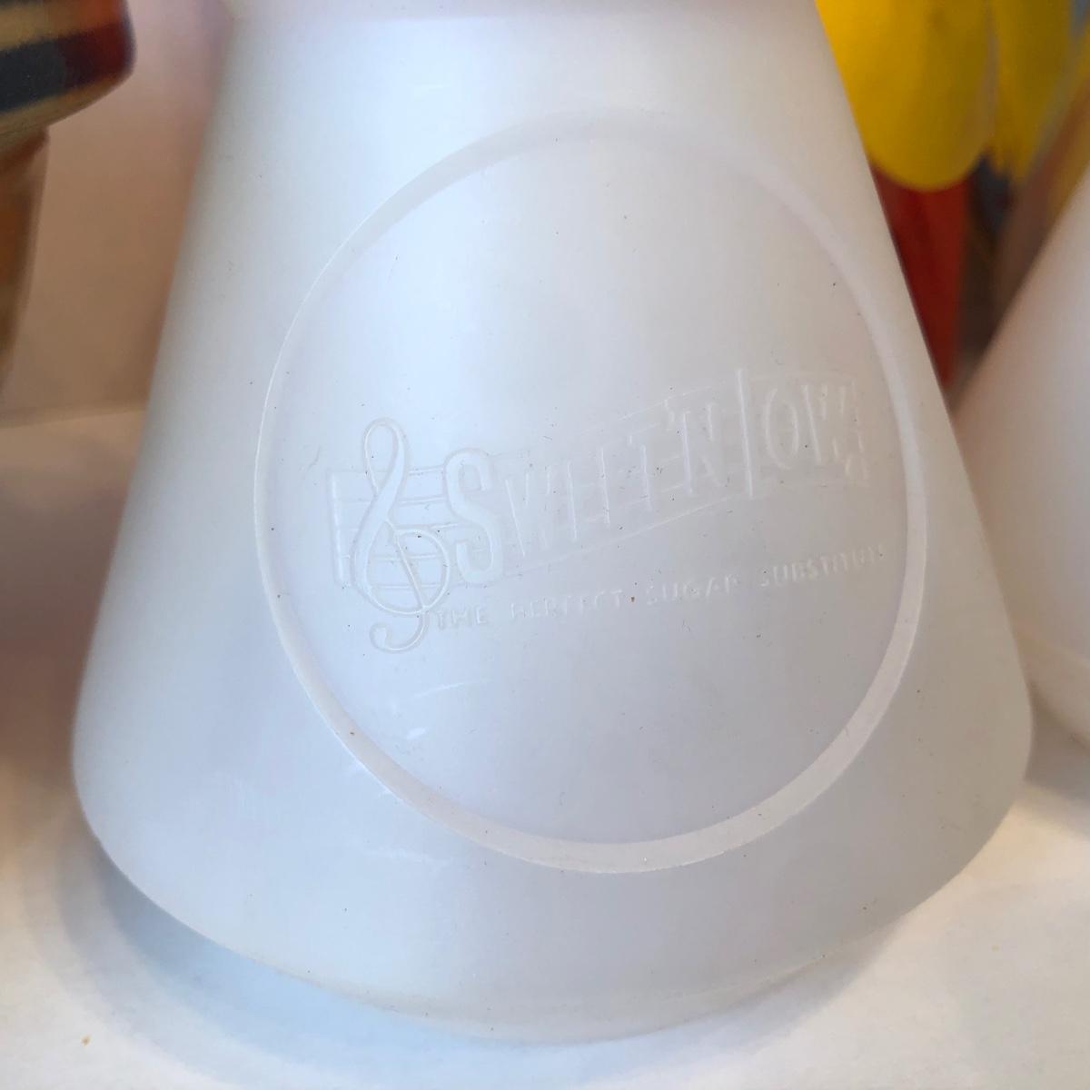 LOT 24M: Vintage Kitchen Collection - Sweet N Low Sugar Bowl & Plastic Dispensers, Asco Spices, Blue Striped YellowWare & More