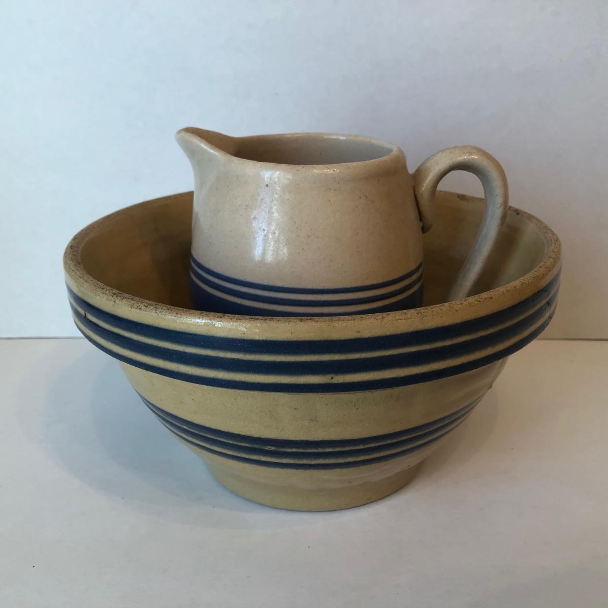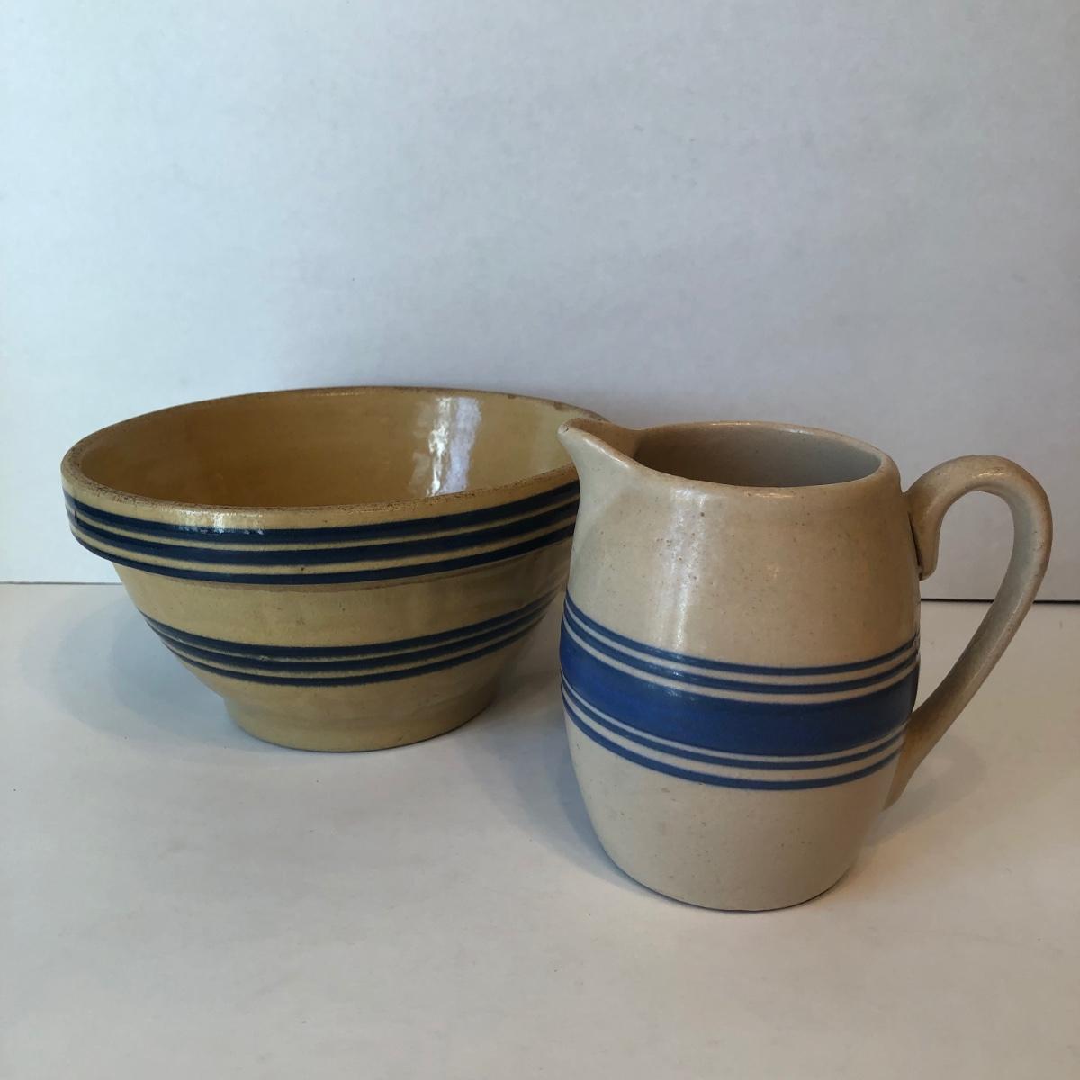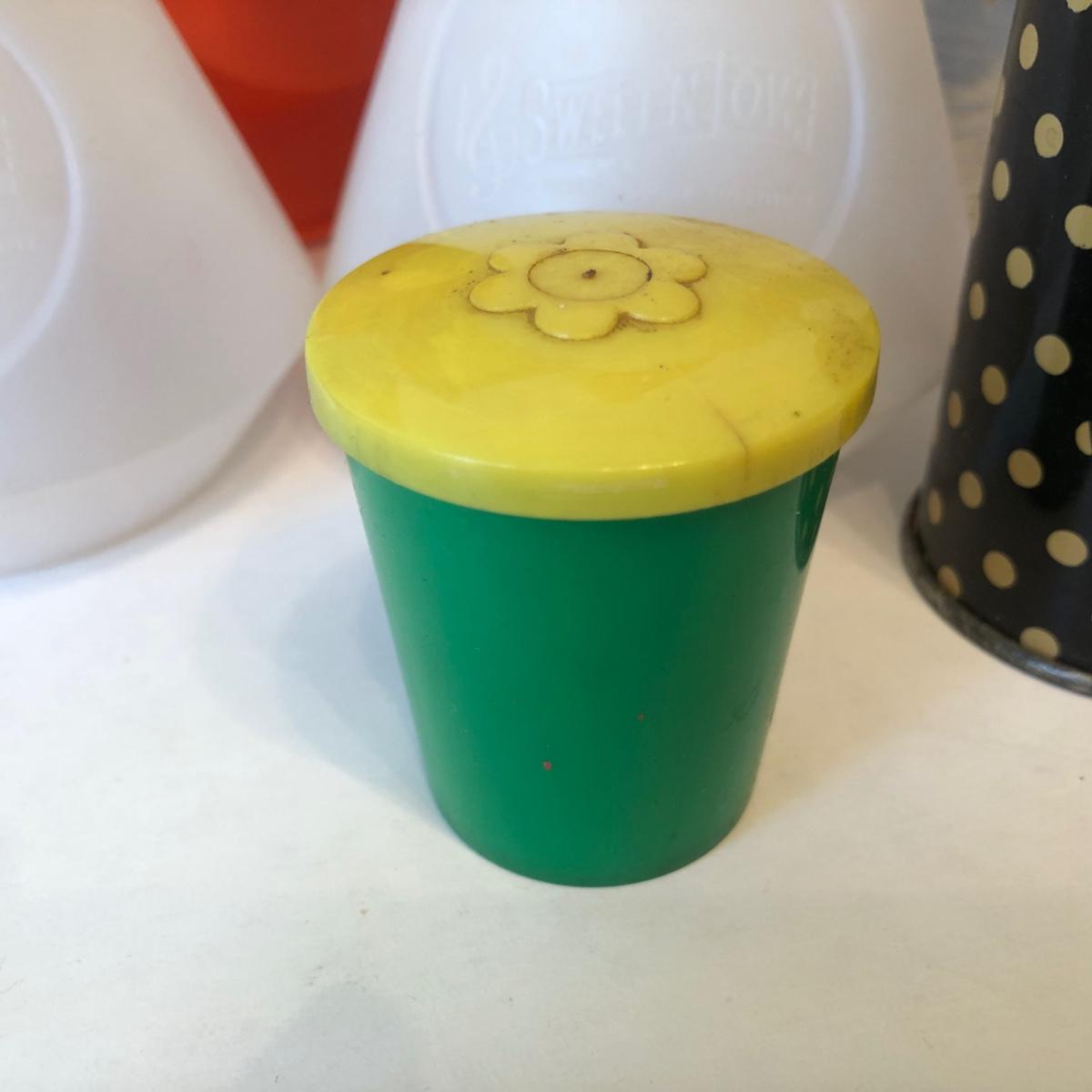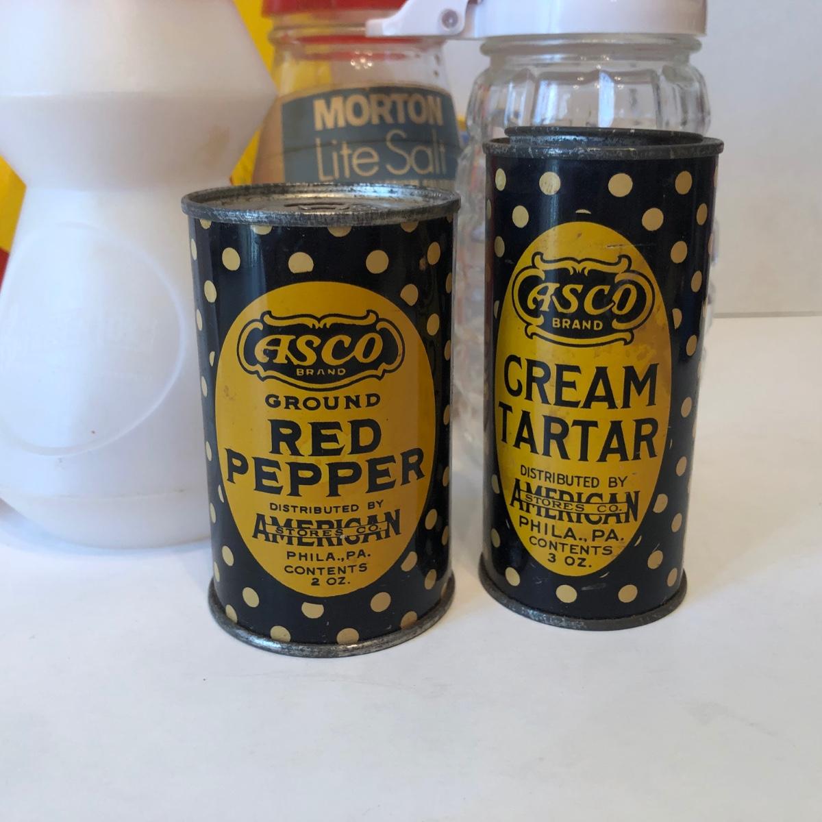 LOT 24M: Vintage Kitchen Collection - Sweet N Low Sugar Bowl & Plastic Dispensers, Asco Spices, Blue Striped YellowWare & More