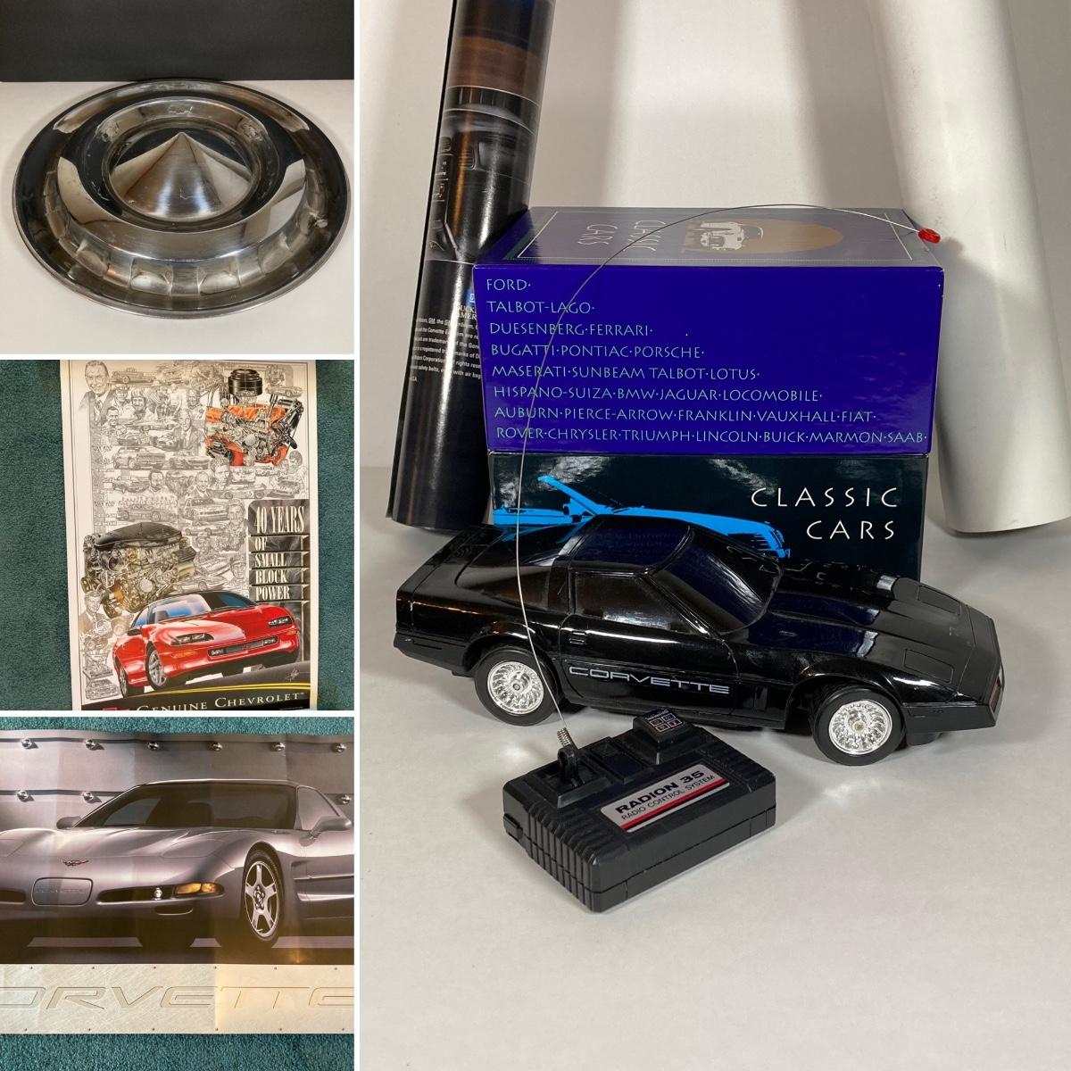 LOT 43J: Classic Car Collection - Posters, RC Corvette, Chevy Hubcap and More