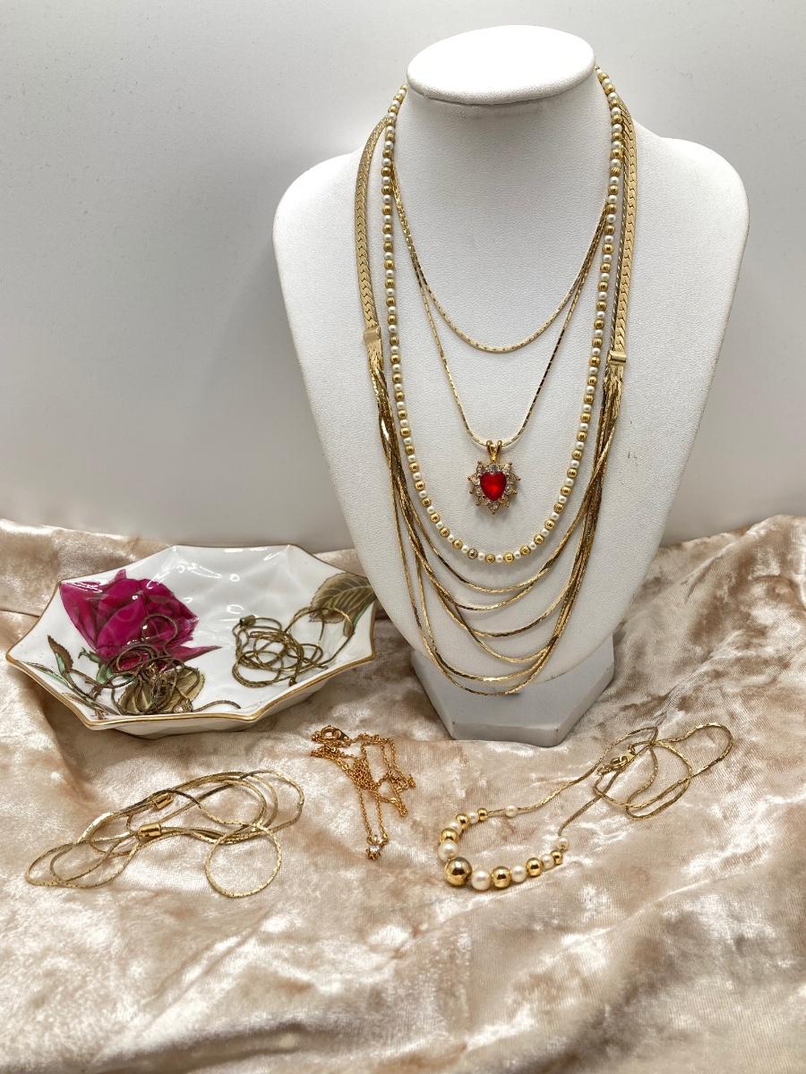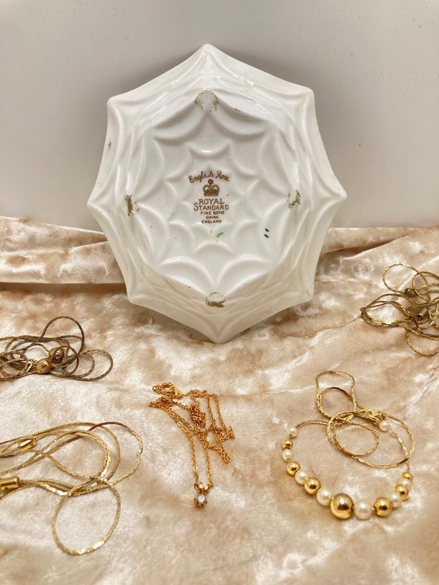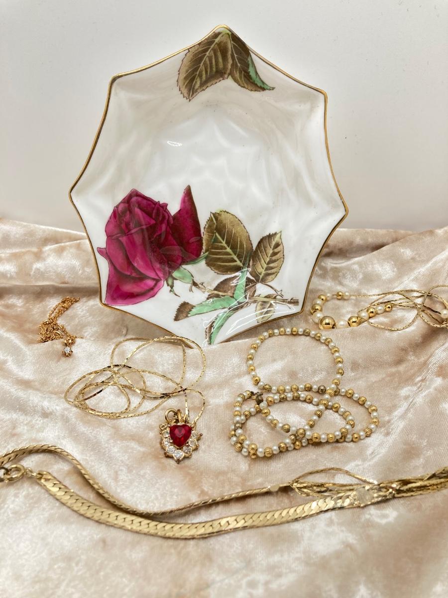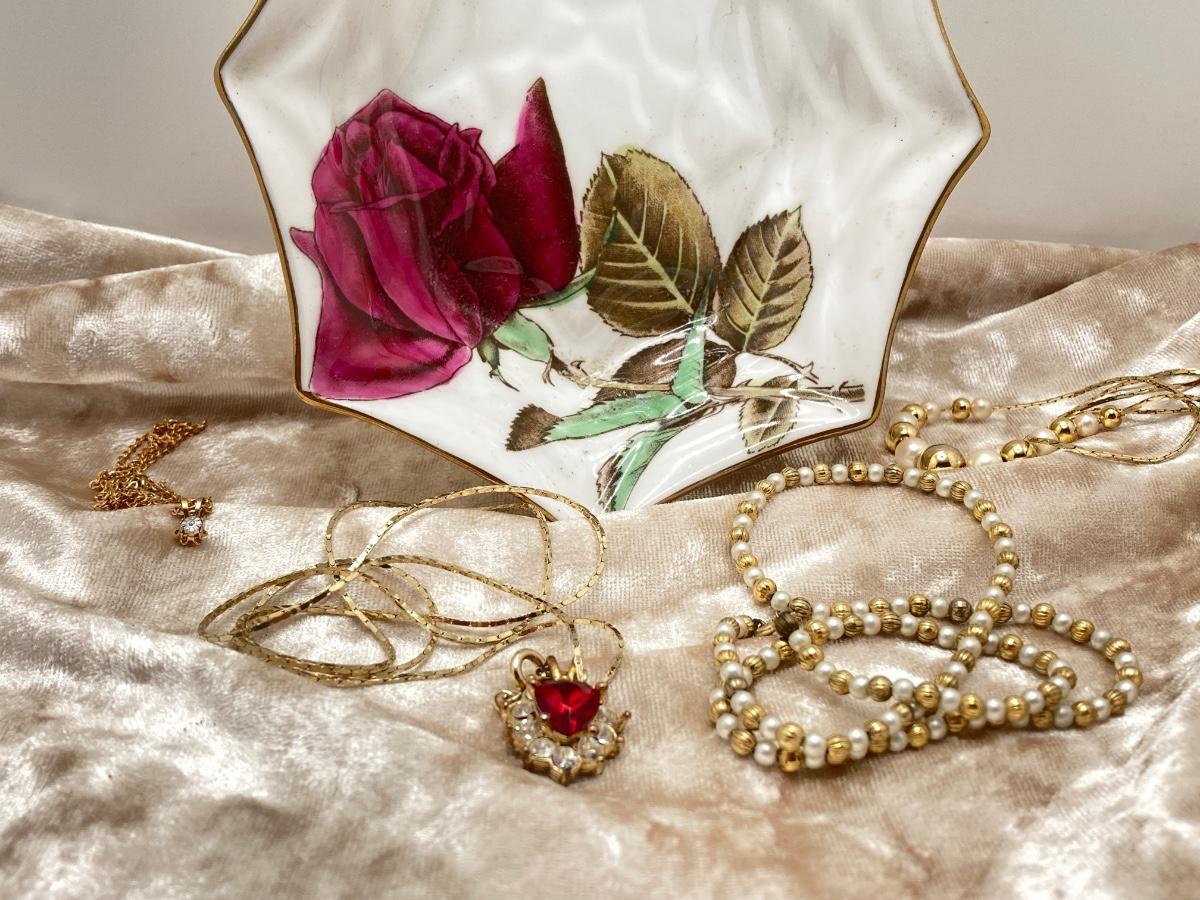LOT 51J: Gold Tone Necklaces with English Rose China Dish