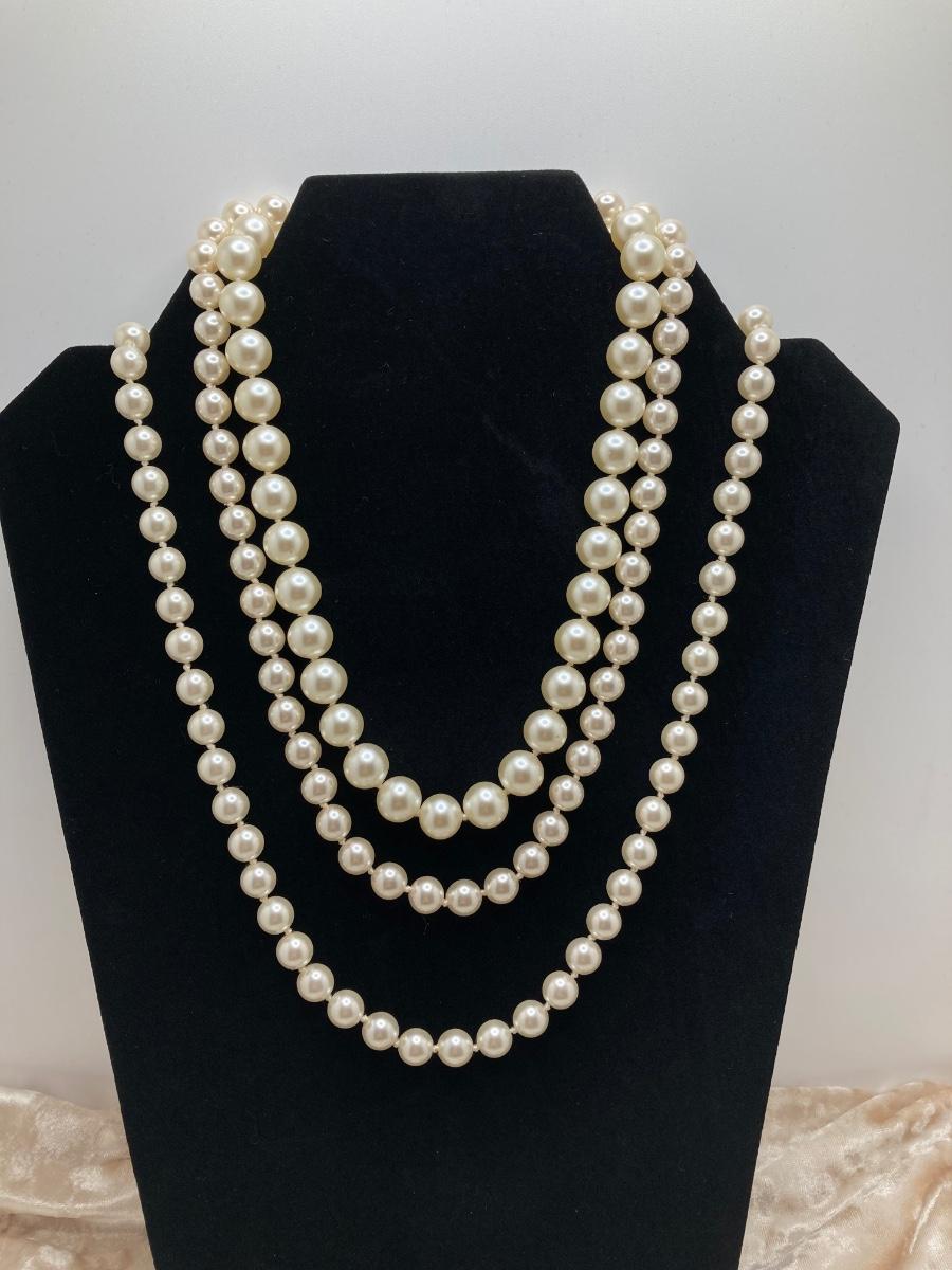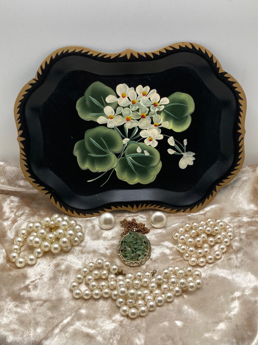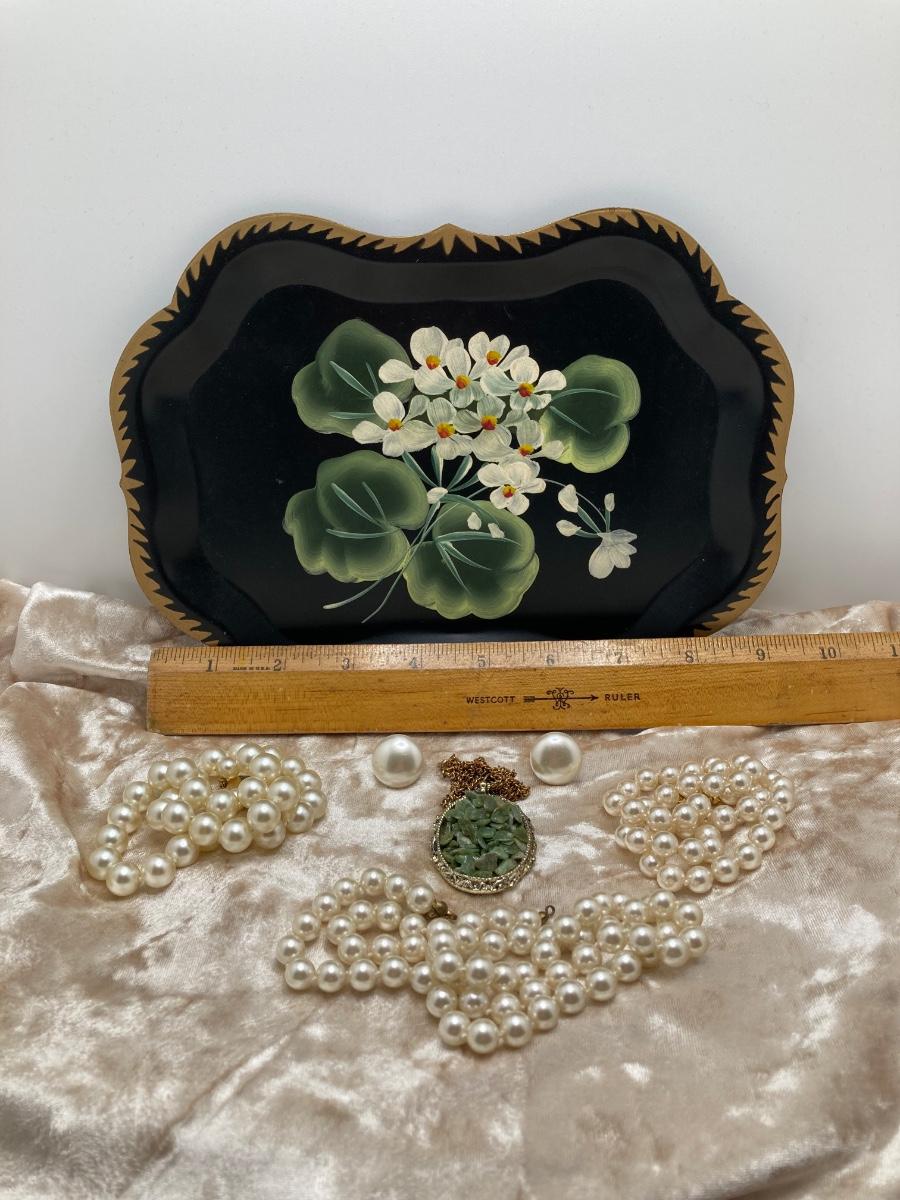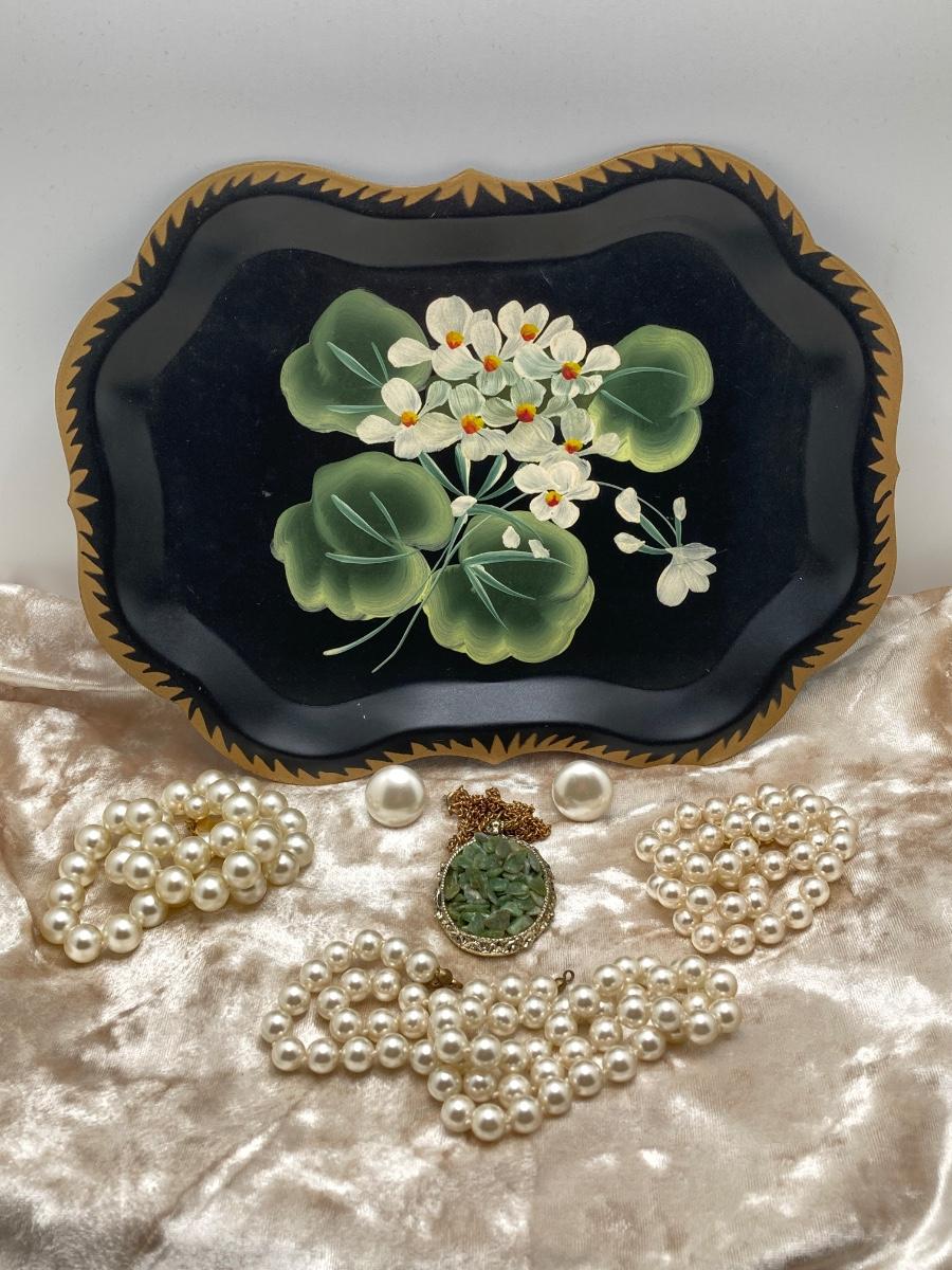 LOT 54J: Vintage Floral Tray with Faux Pearl Necklaces / Earrings and More
