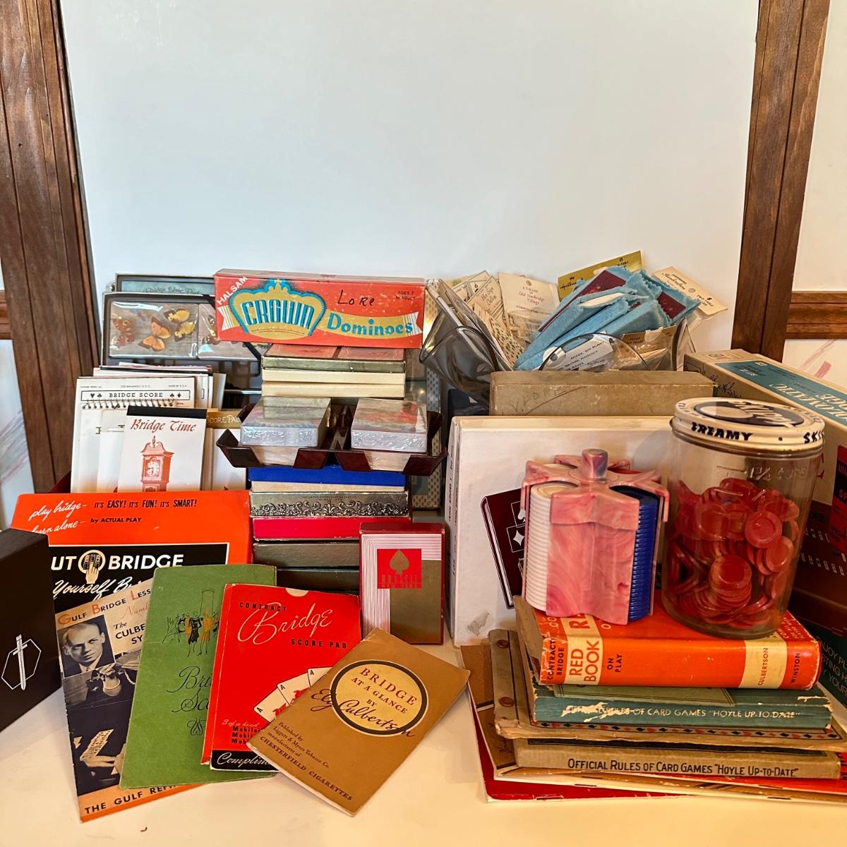 LOT 73N: Extra Large Lot of Vintage Cards along with Dominoes, Poker Chips, Bridge Sets, Card Game Books & More