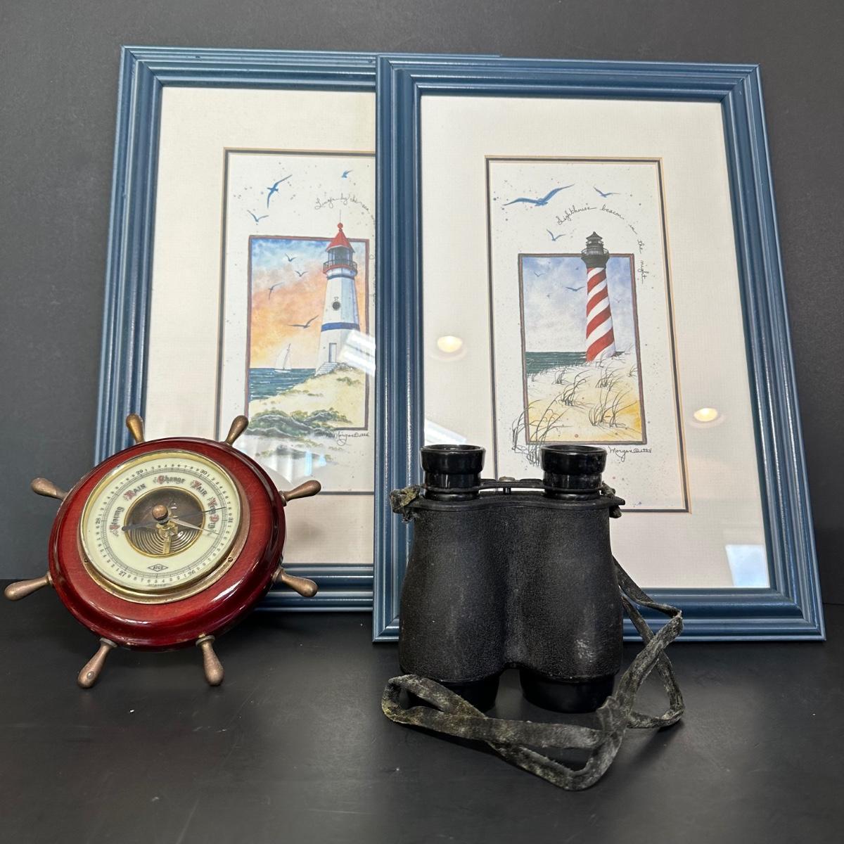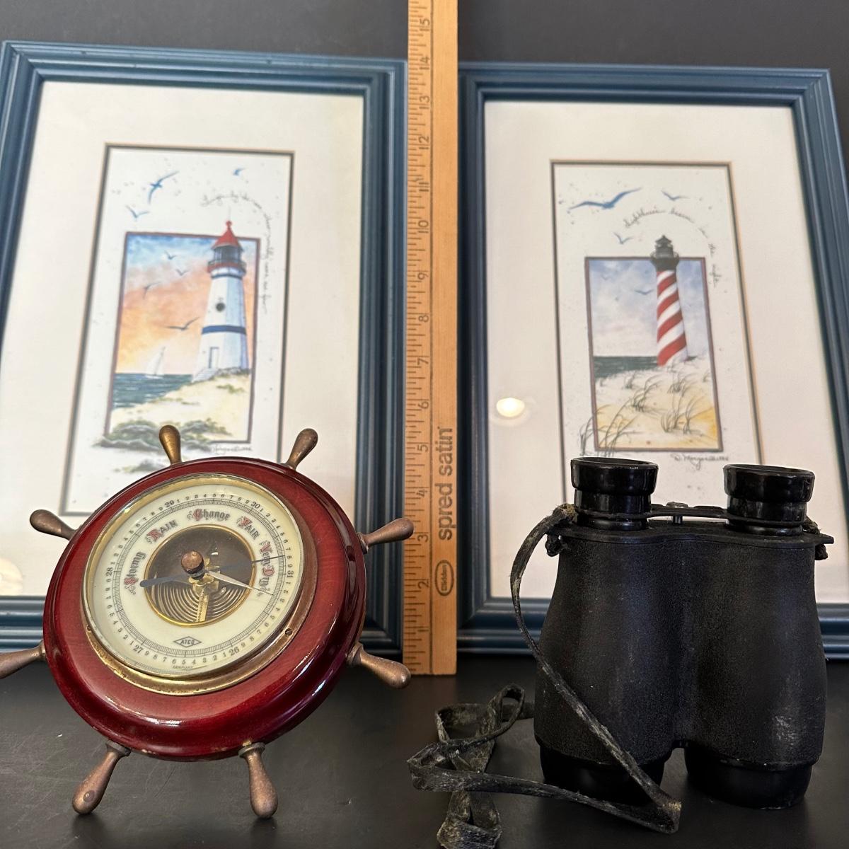 LOT 79N: Vintage Atco Ship Wheel Barometer, Scientific Products Field Glasses & D. Morgan Signed Paintings