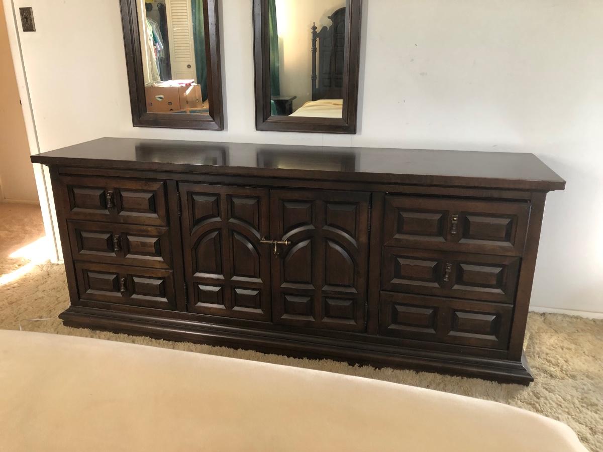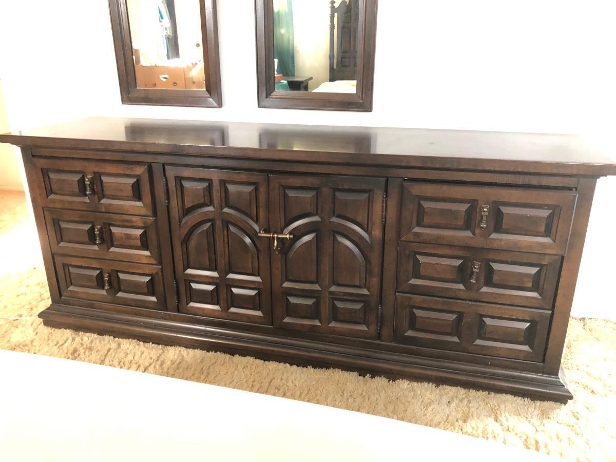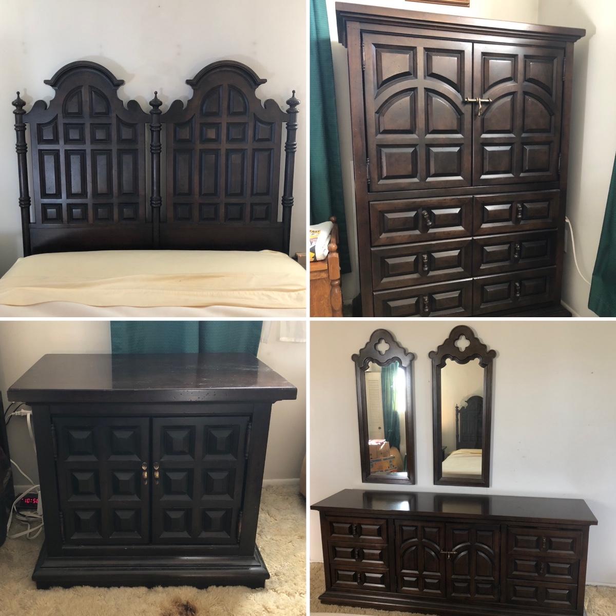 LOT 85M: Vintage Matching Bedroom Set - Bed, Dresser, Wardrobe, Nightstand & 2 Mirrors