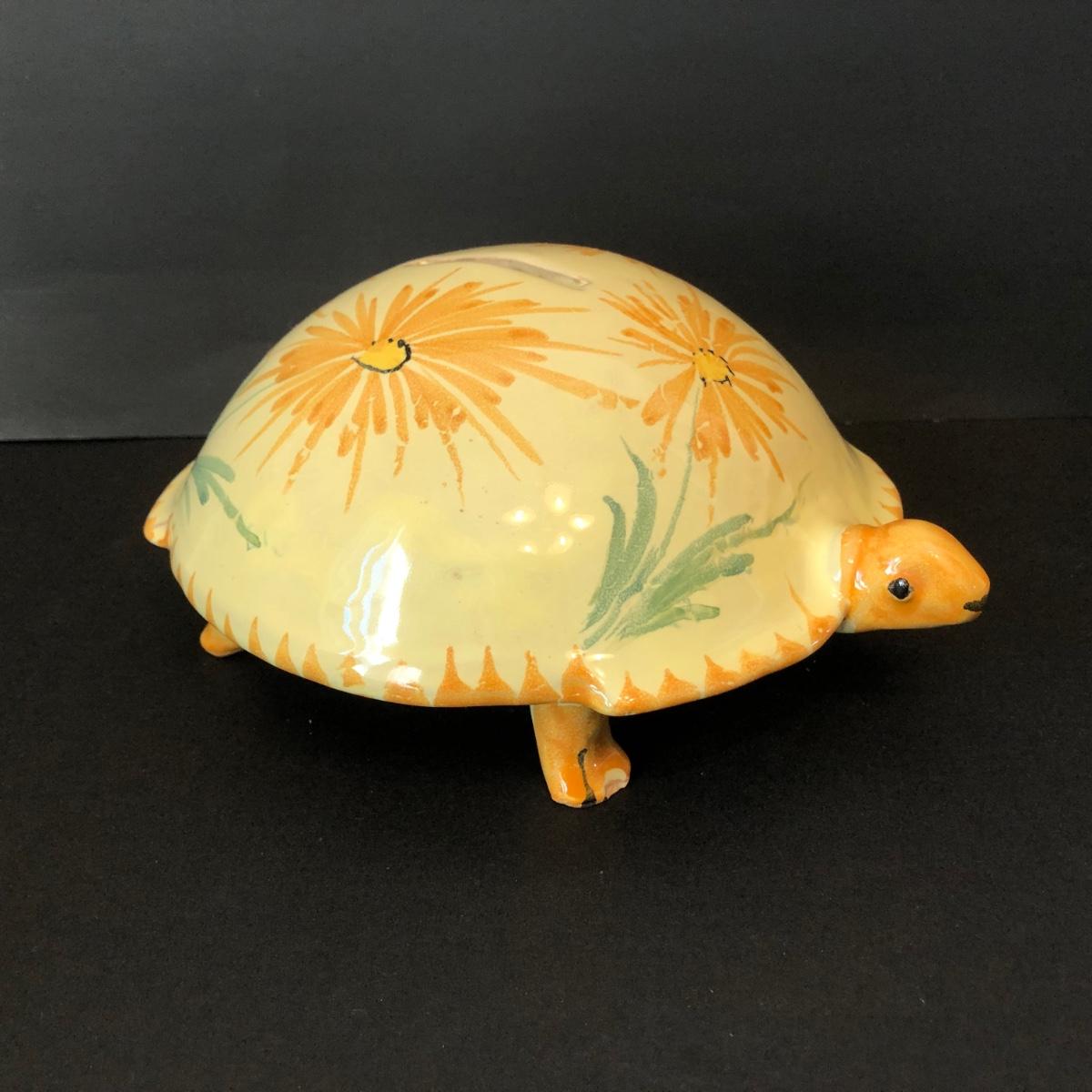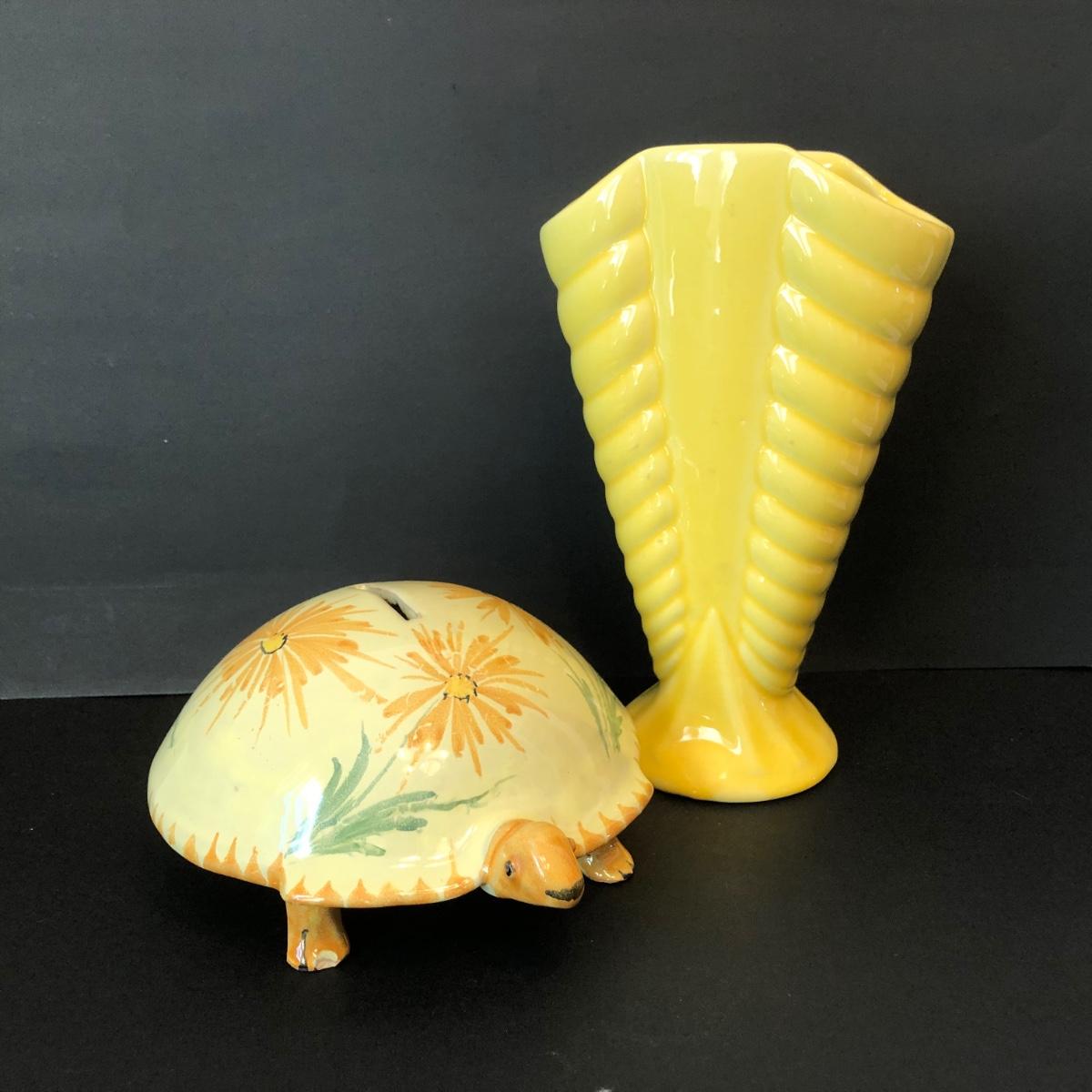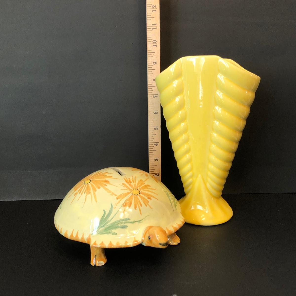 LOT 98M: Vintage Pottery - Painted Turtle Coin Bank & Yellow Art Deco Vase (by Shawnee)