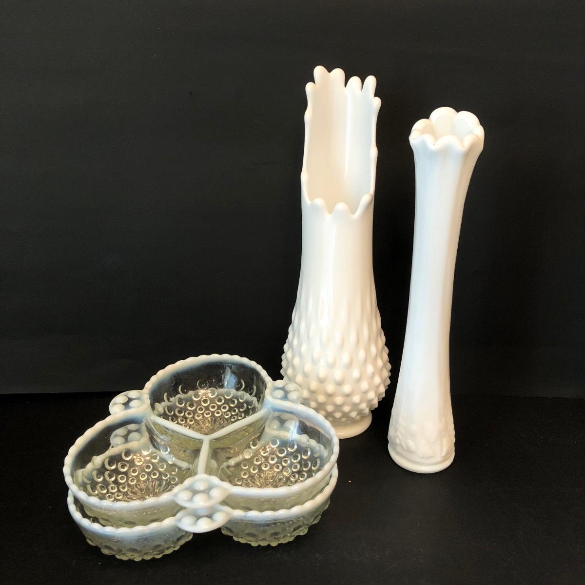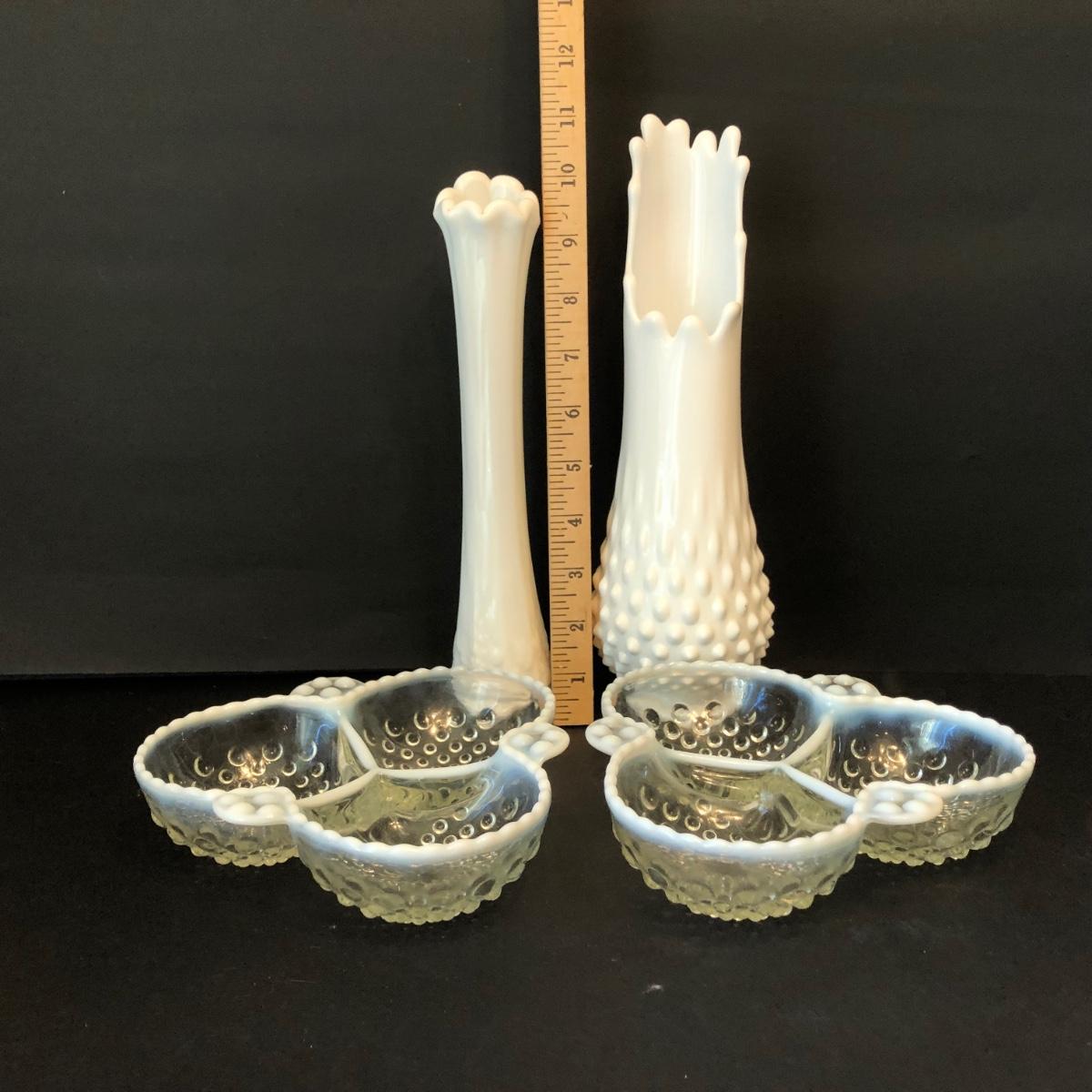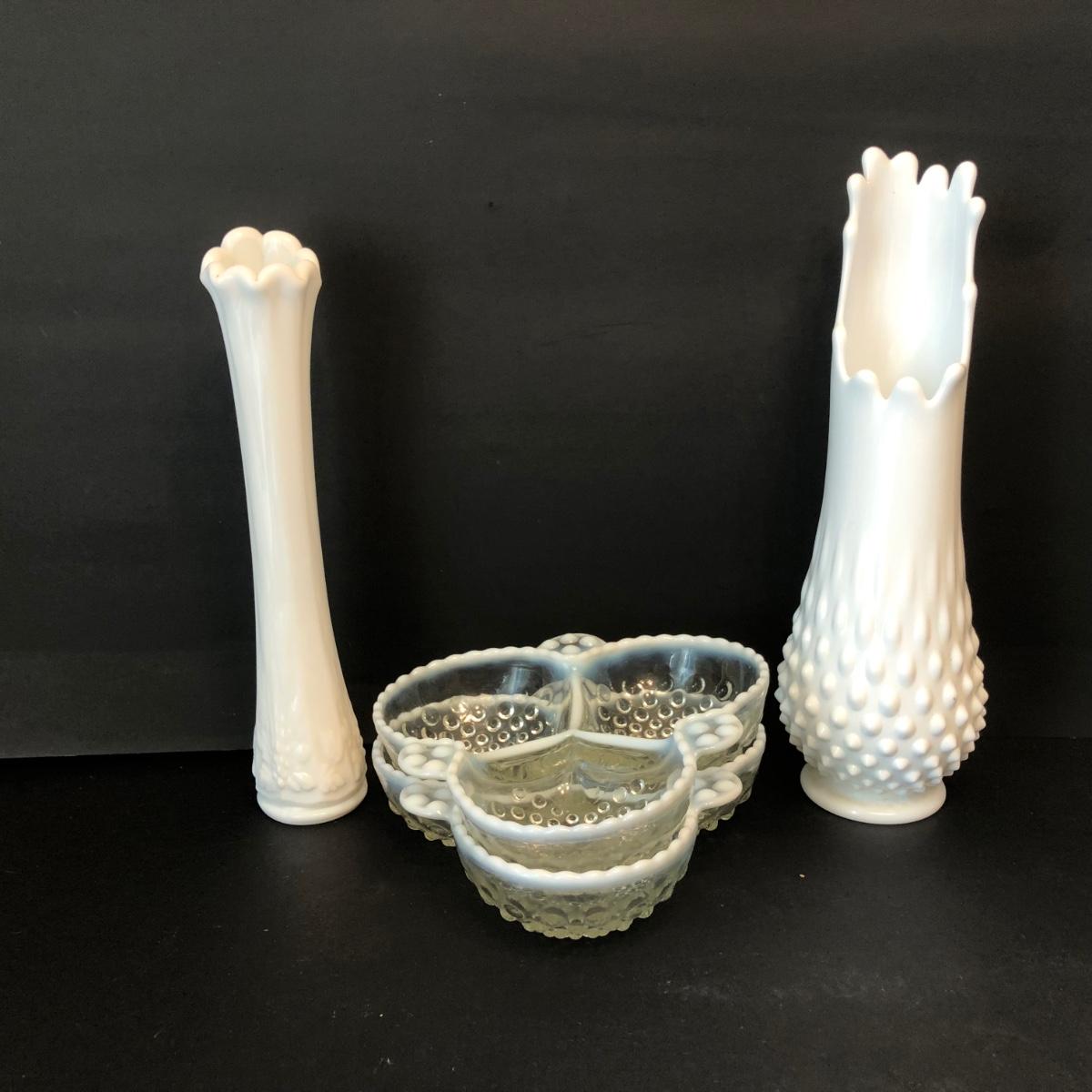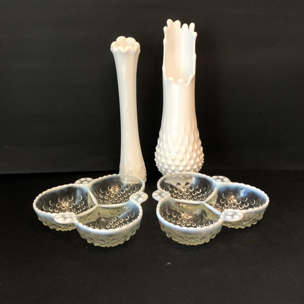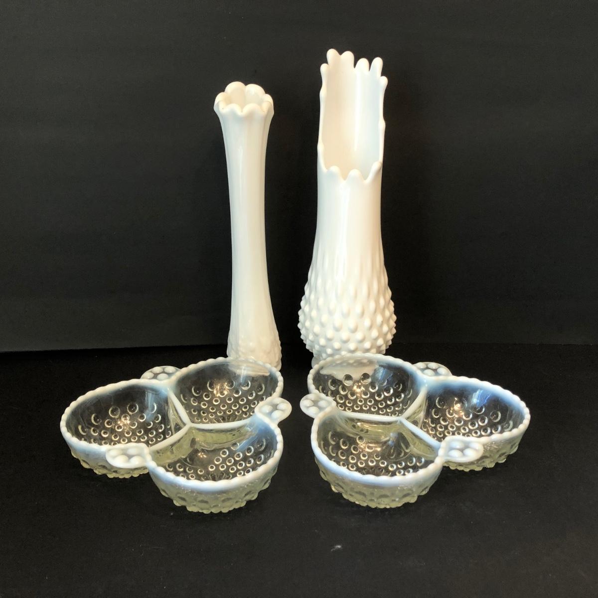 LOT 108M: Vintage Glass - Fenton Opalescent Hobnail Moonstone Condiment Dishes (2), Westmoreland Milk Glass Bud Vase & Milk Glass Hobnail Swung Vase