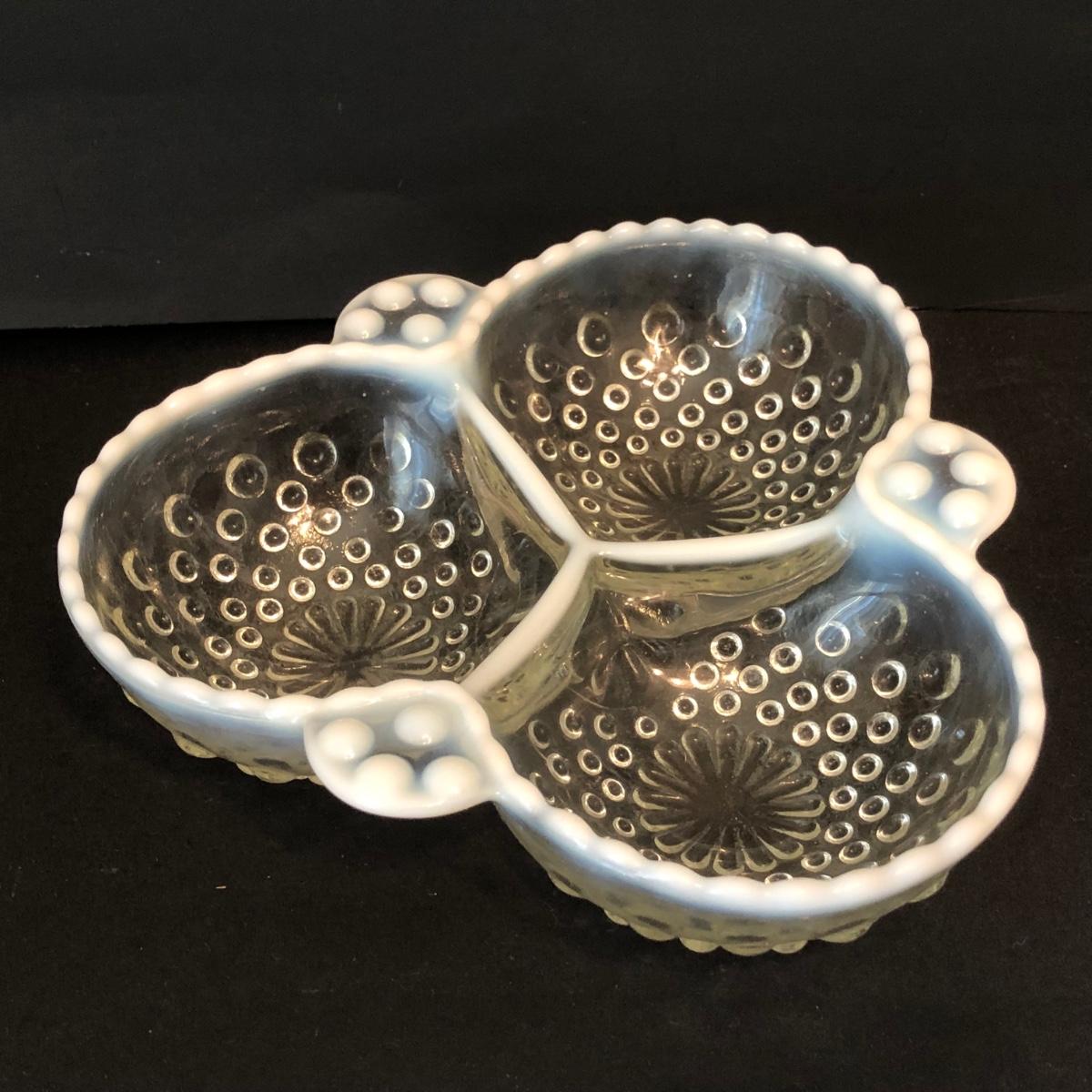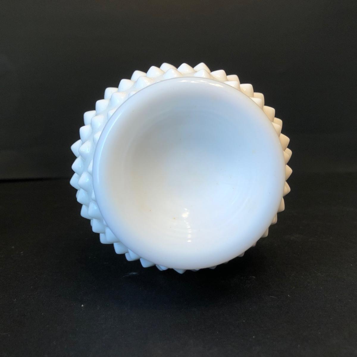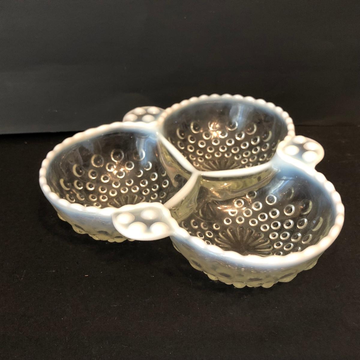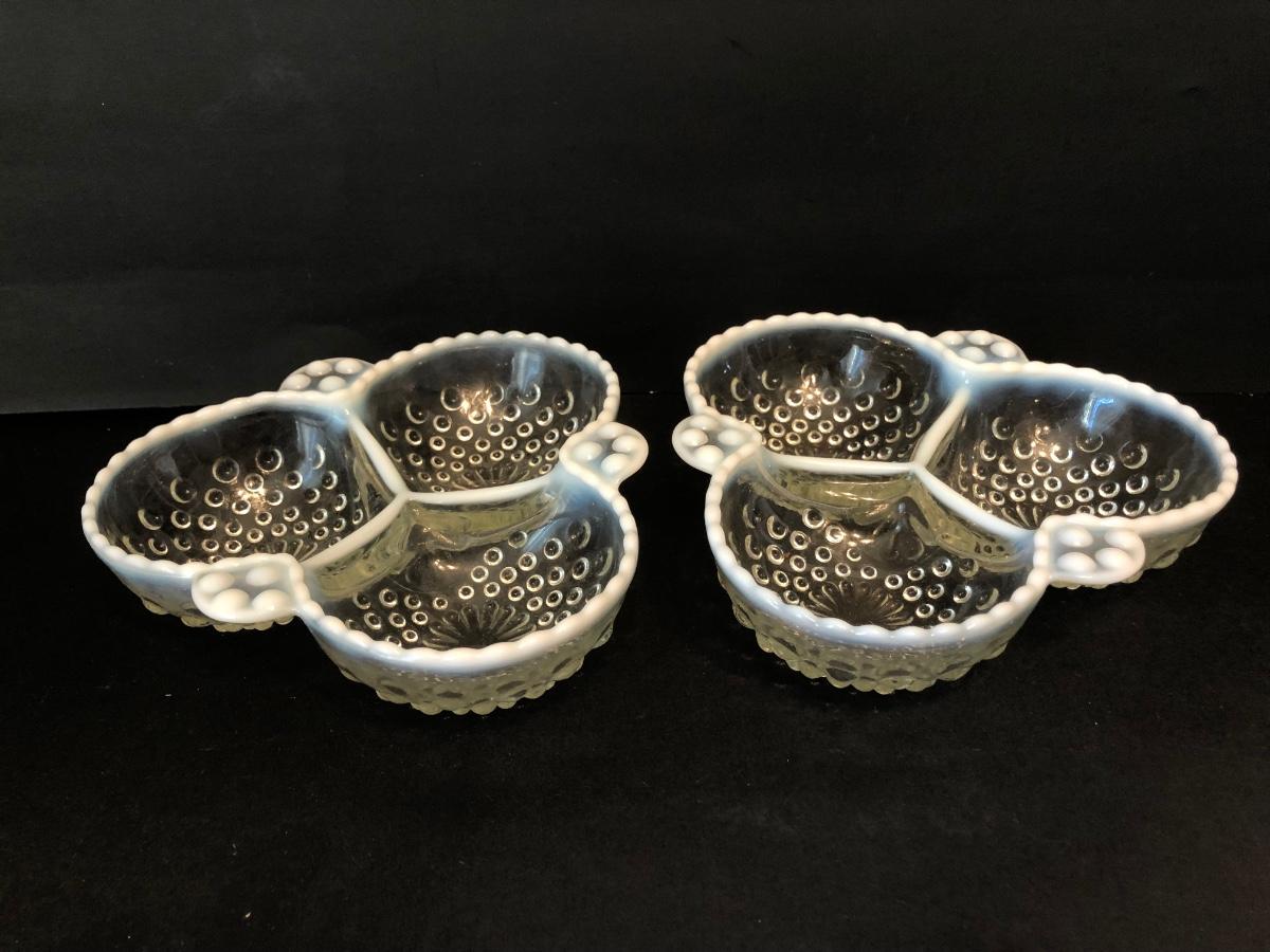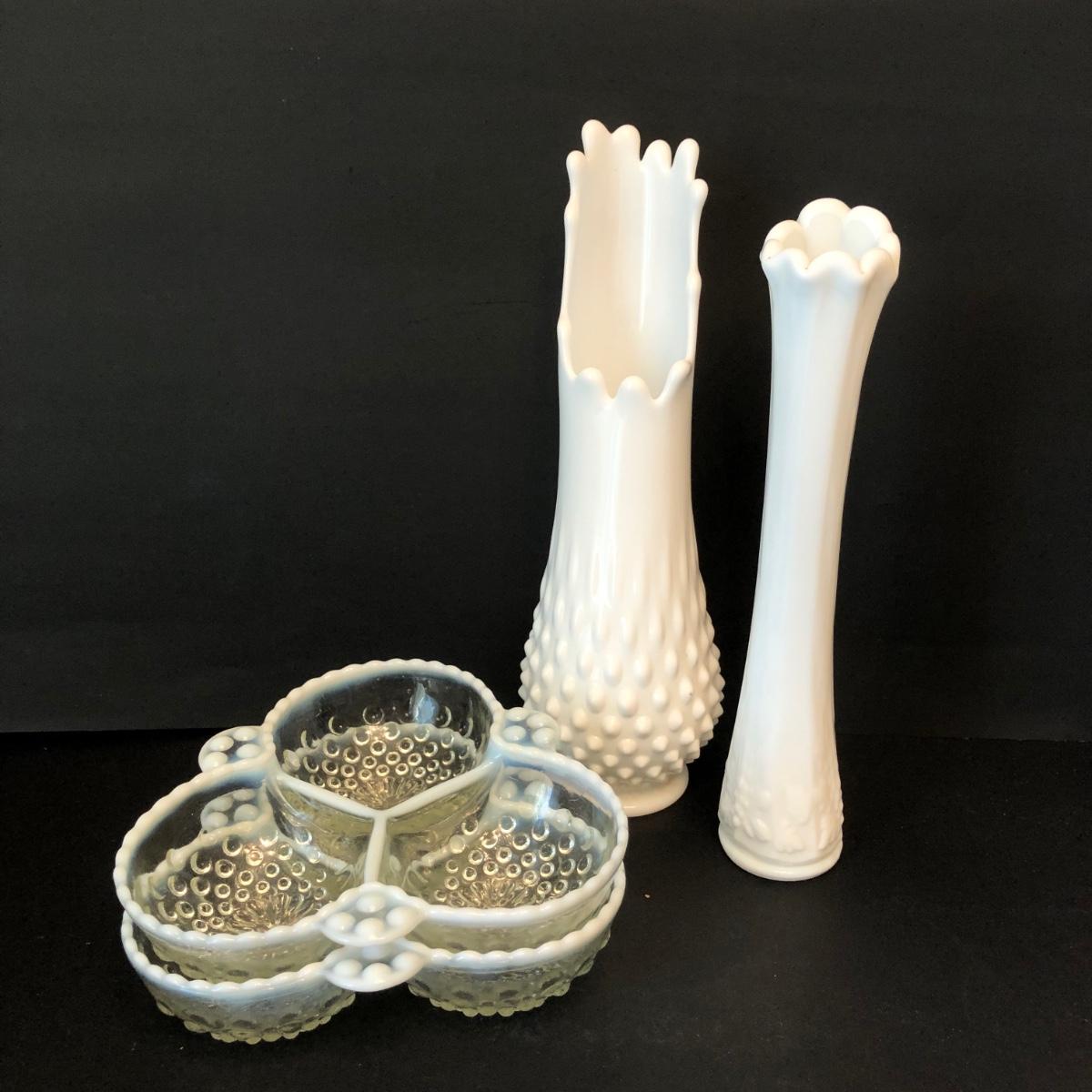 LOT 108M: Vintage Glass - Fenton Opalescent Hobnail Moonstone Condiment Dishes (2), Westmoreland Milk Glass Bud Vase & Milk Glass Hobnail Swung Vase