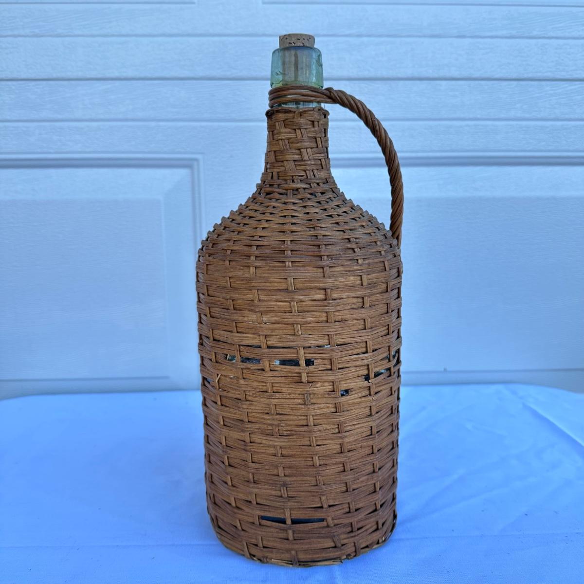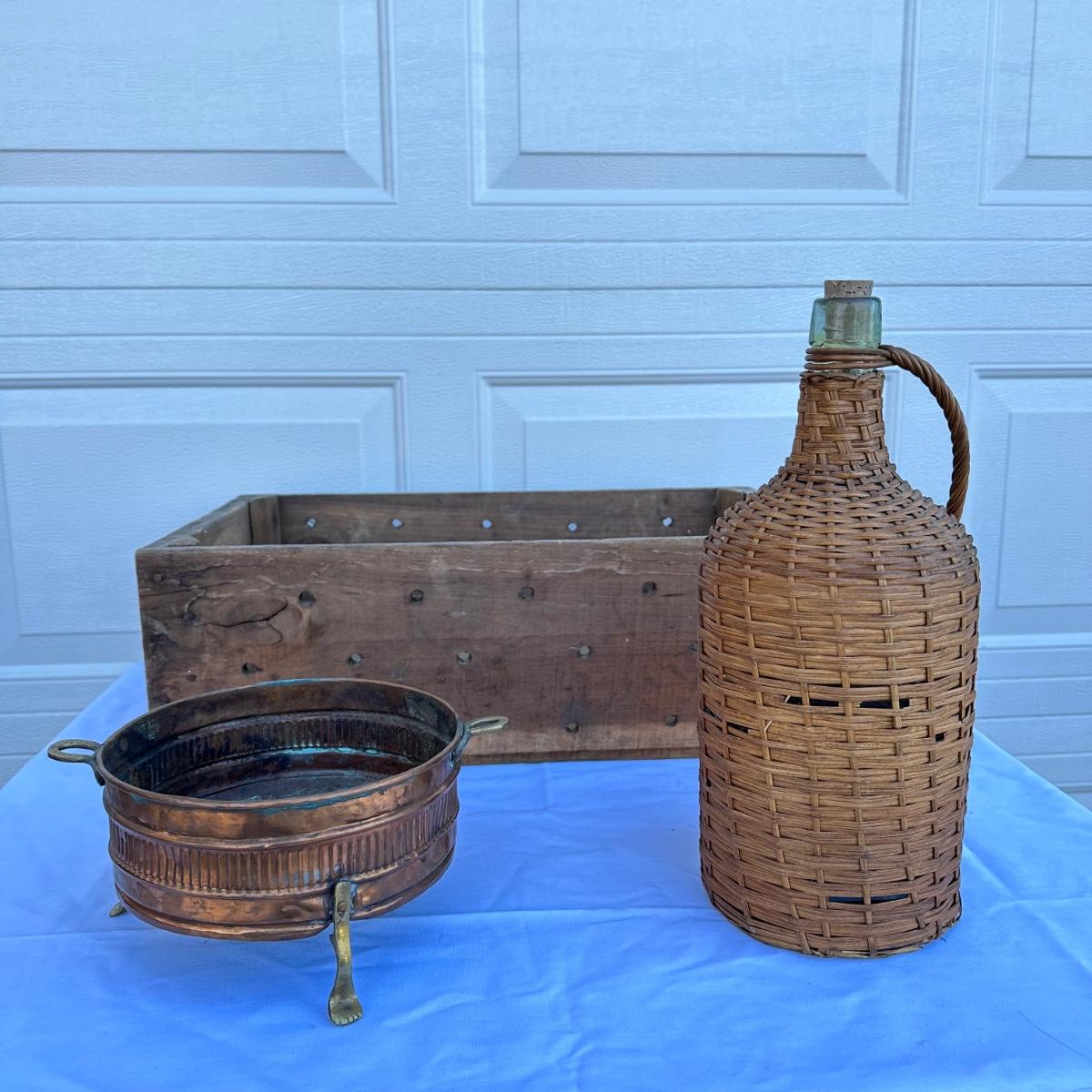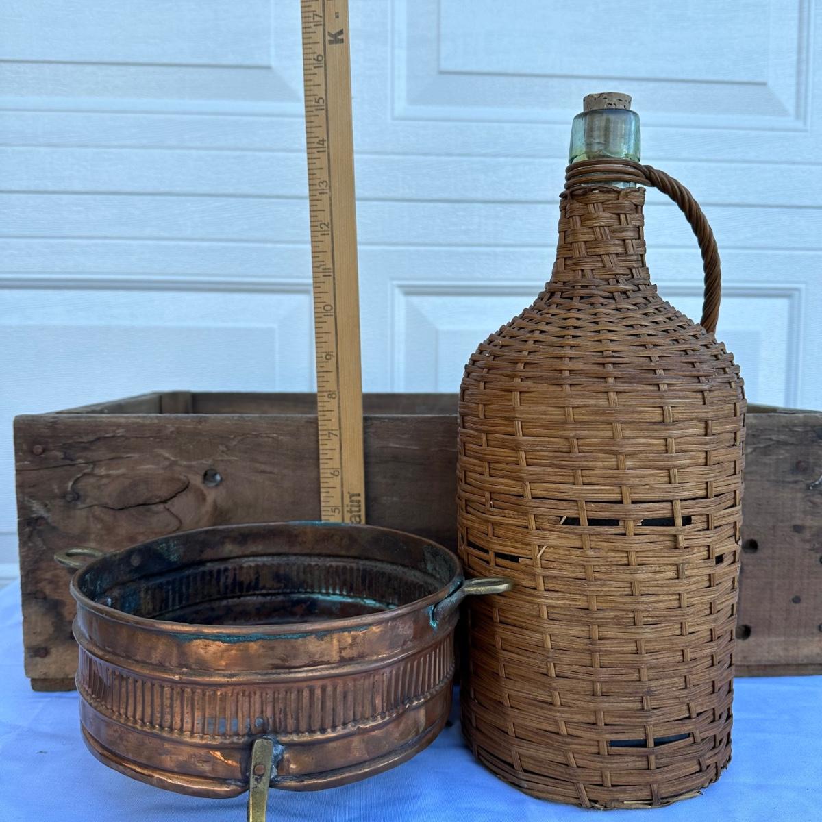 LOT 109N: Vintage Wicker Wine Jug, Crate & Copper Planter