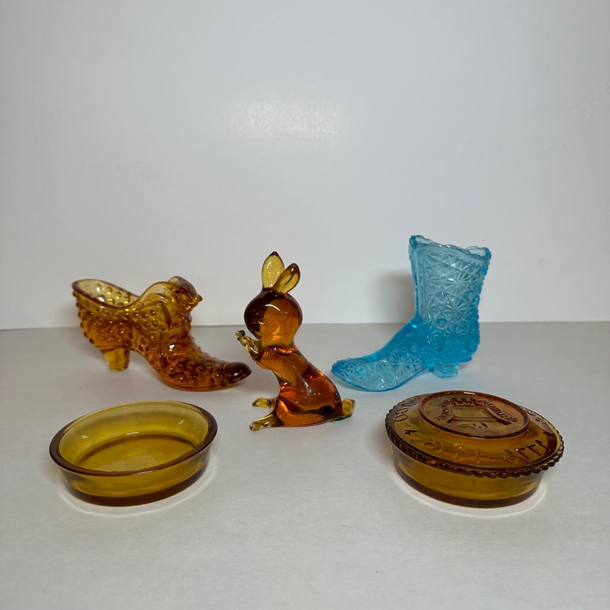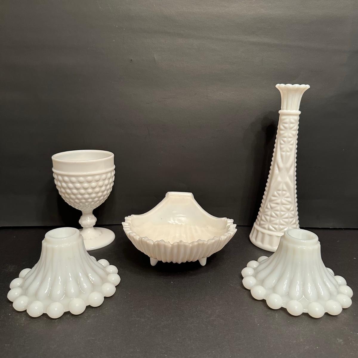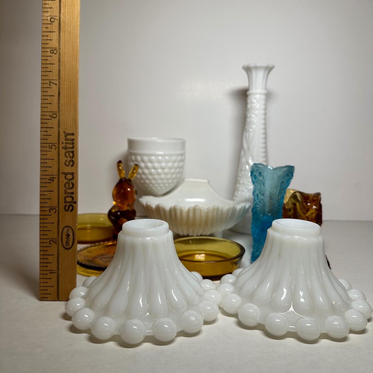 LOT 128N: Milk Glassware Set w/ Amber Glass Figurines & More