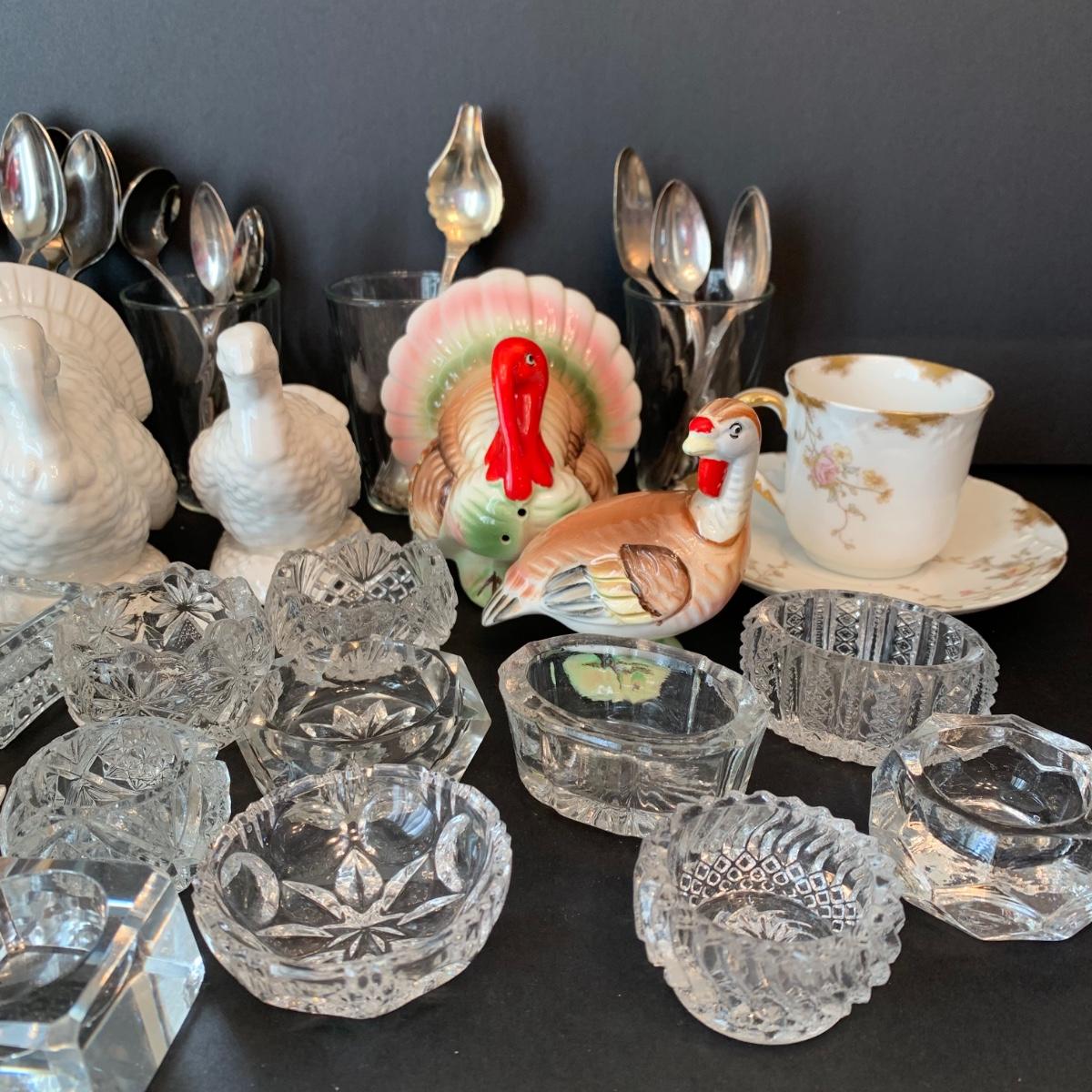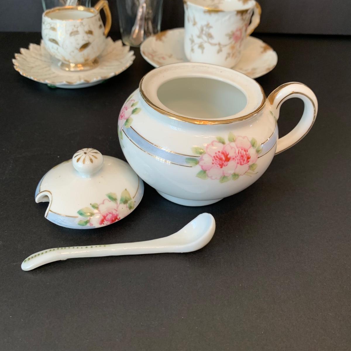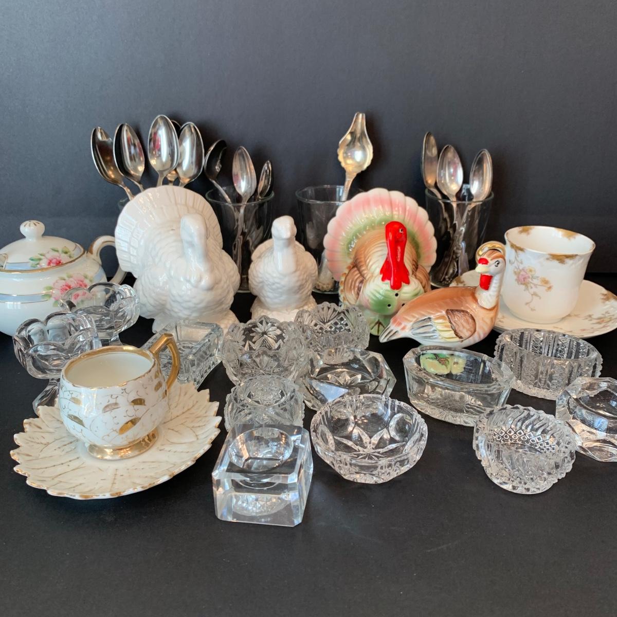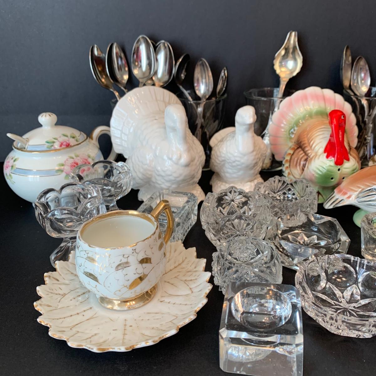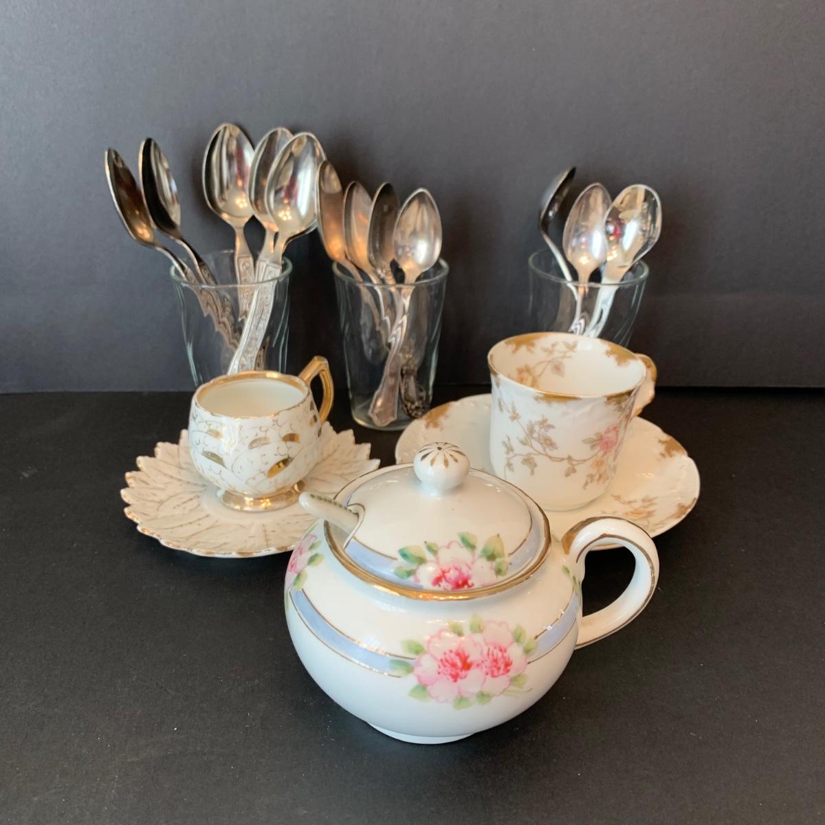 LOT 134R: Vintage Wm Rogers Sick Feeding Spoons, Nippon Sugar Bowl, Salt Dishes, Turkey Salt/Peppers, Teacups & Teaspoons