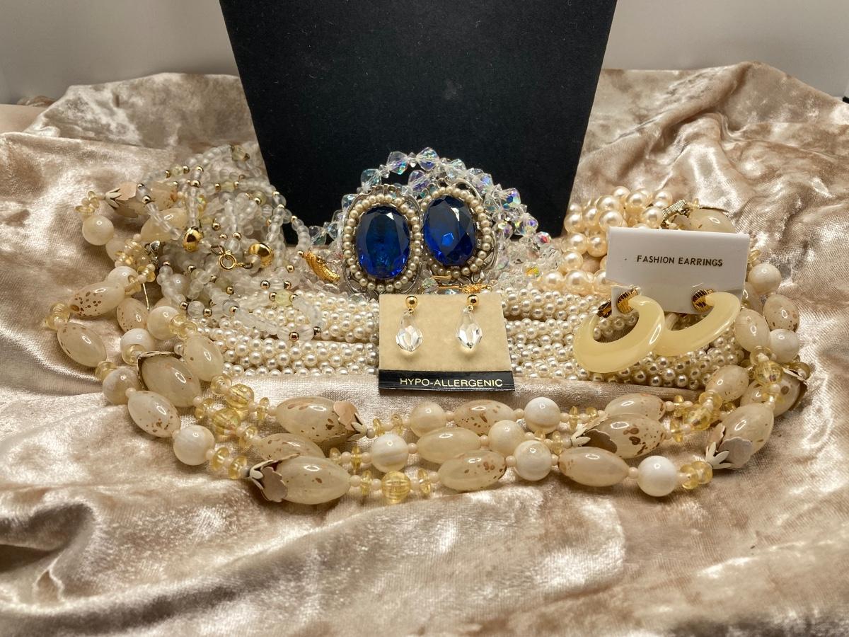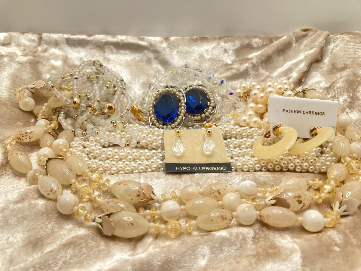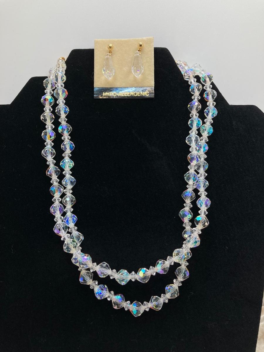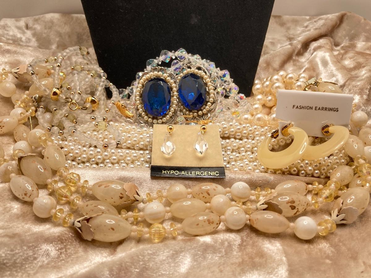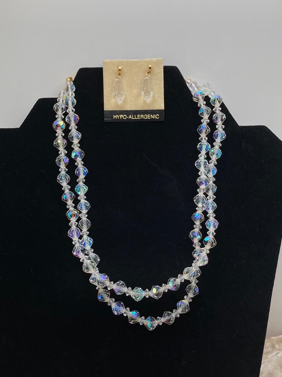 LOT 139J: Aurora Borealis Beaded Set, Glass Beaded Necklace, Blue Stone / Faux Pearl Earrings and More