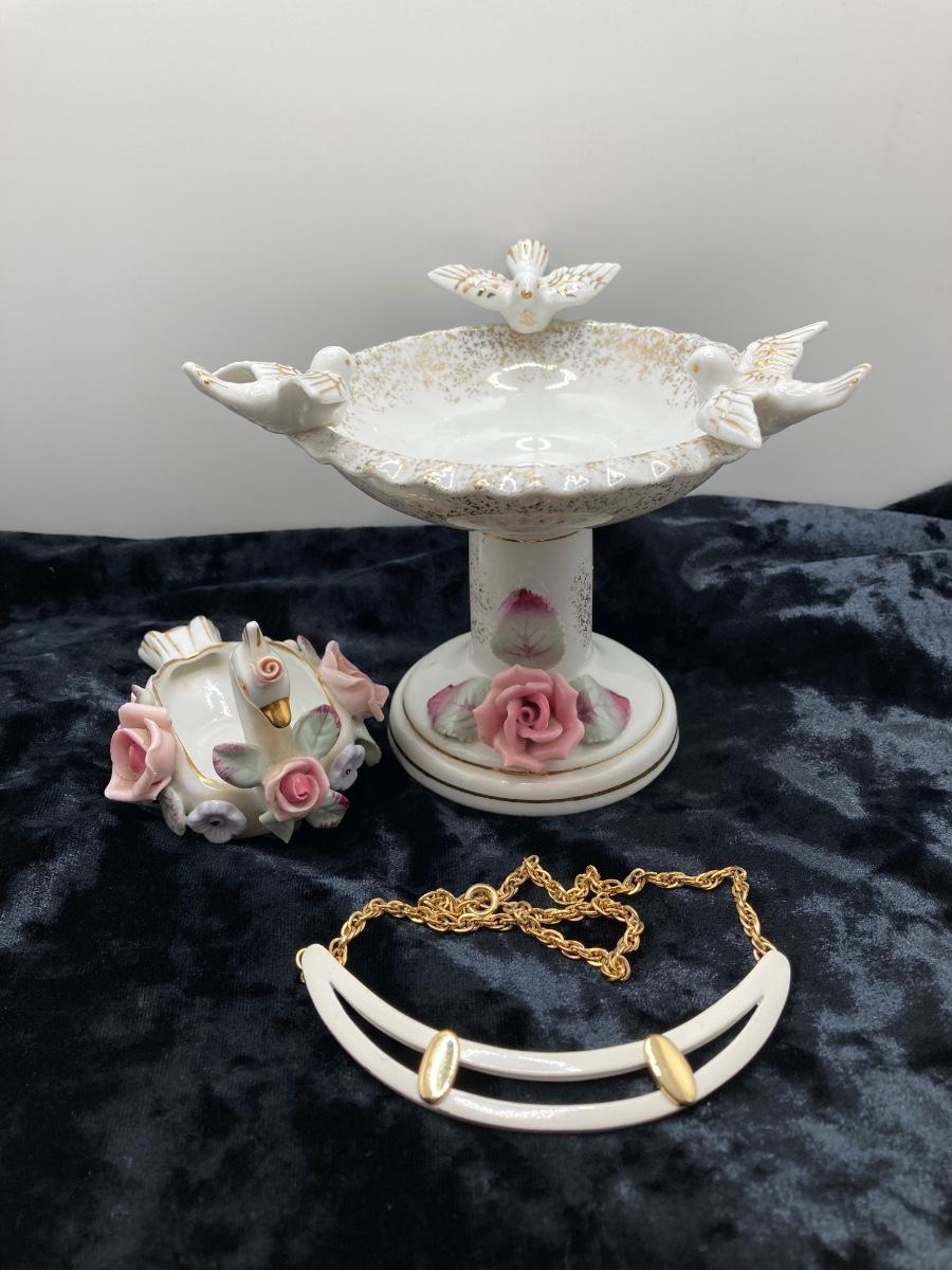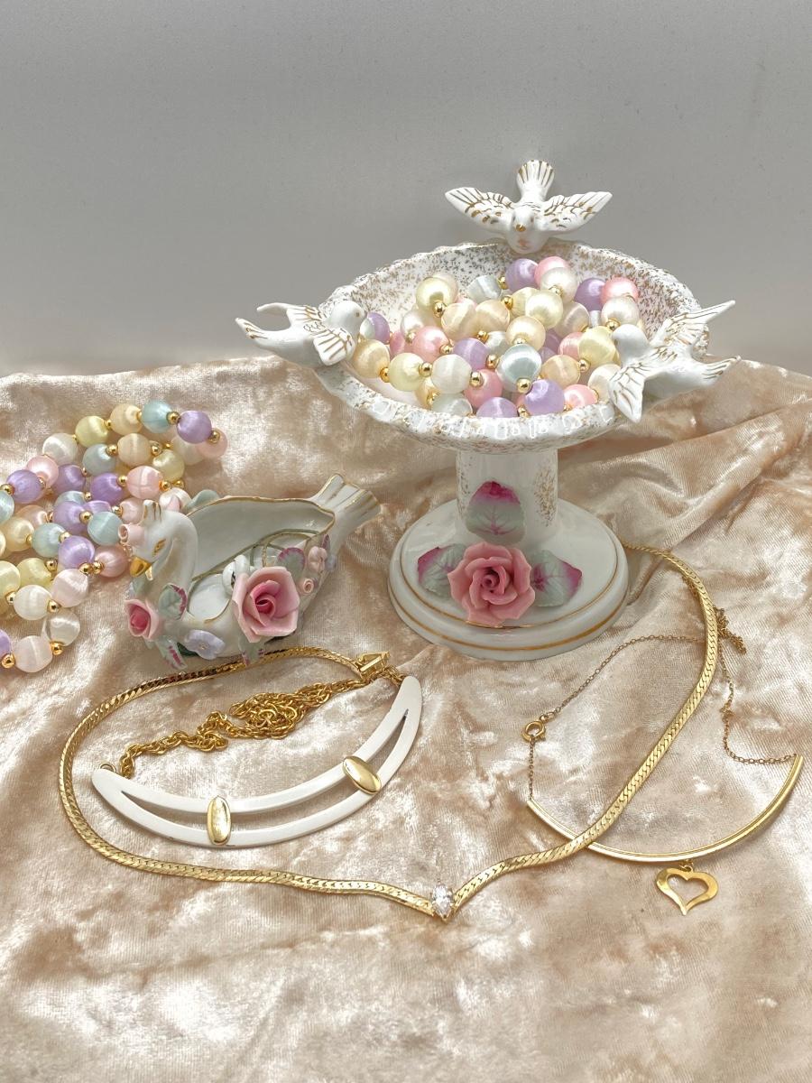 LOT 140J: Gold Tone Necklaces with Decorative Handpainted Lefton Trinket Dishes