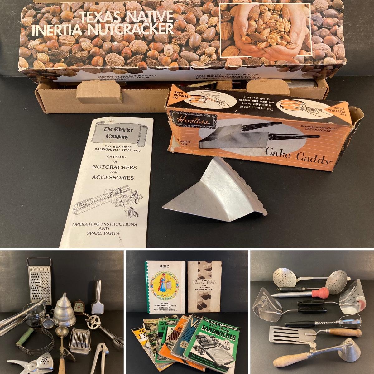 LOT 162J: Vintage Kitchen Utensils - Inertia Nutcracker, Cook Books and More