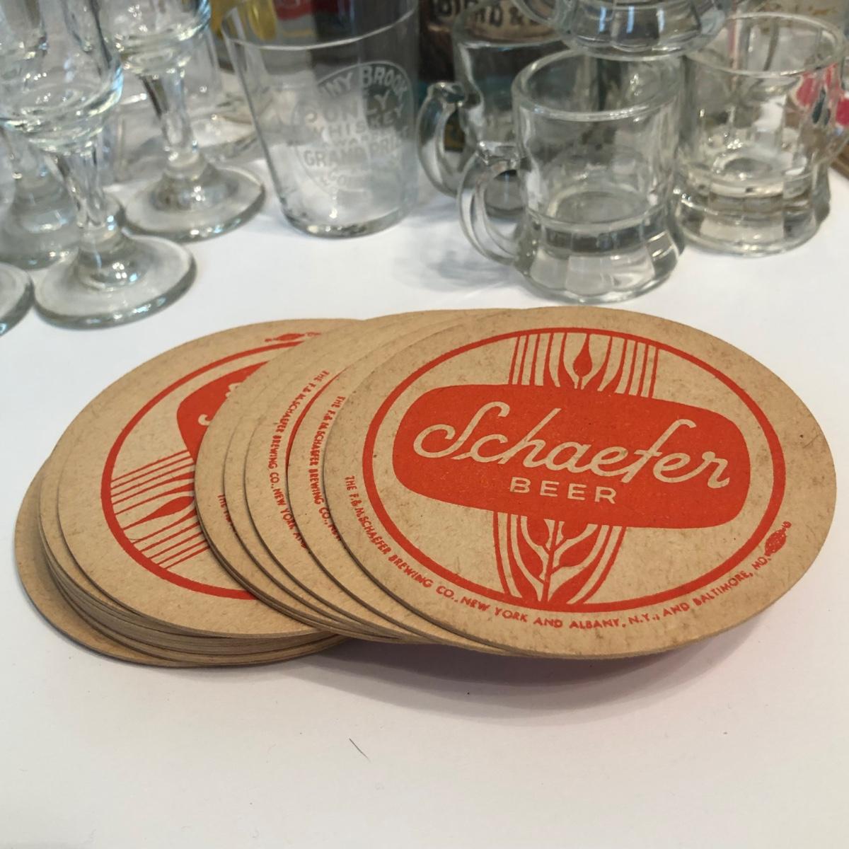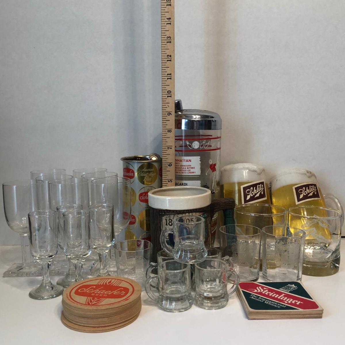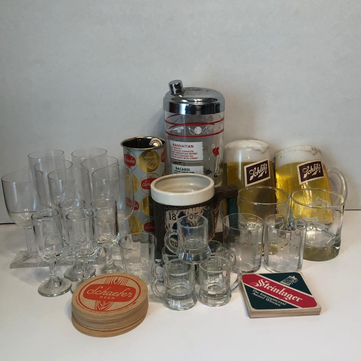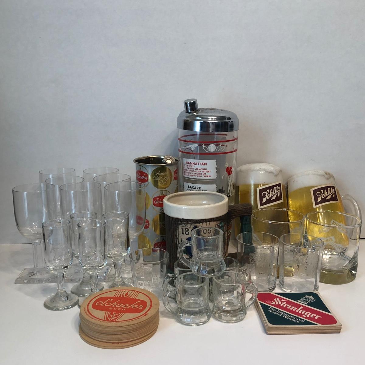 LOT 164M: Large Bar Collection - Federal Mini Beer Mug Shot Glasses, Schlitz Plastic Beer Mug Decor, Vintage Shaefer & Steinlager Paper Coasters, 1805 Bird & Bottle Inn Napcowarae Pottery Mug & More