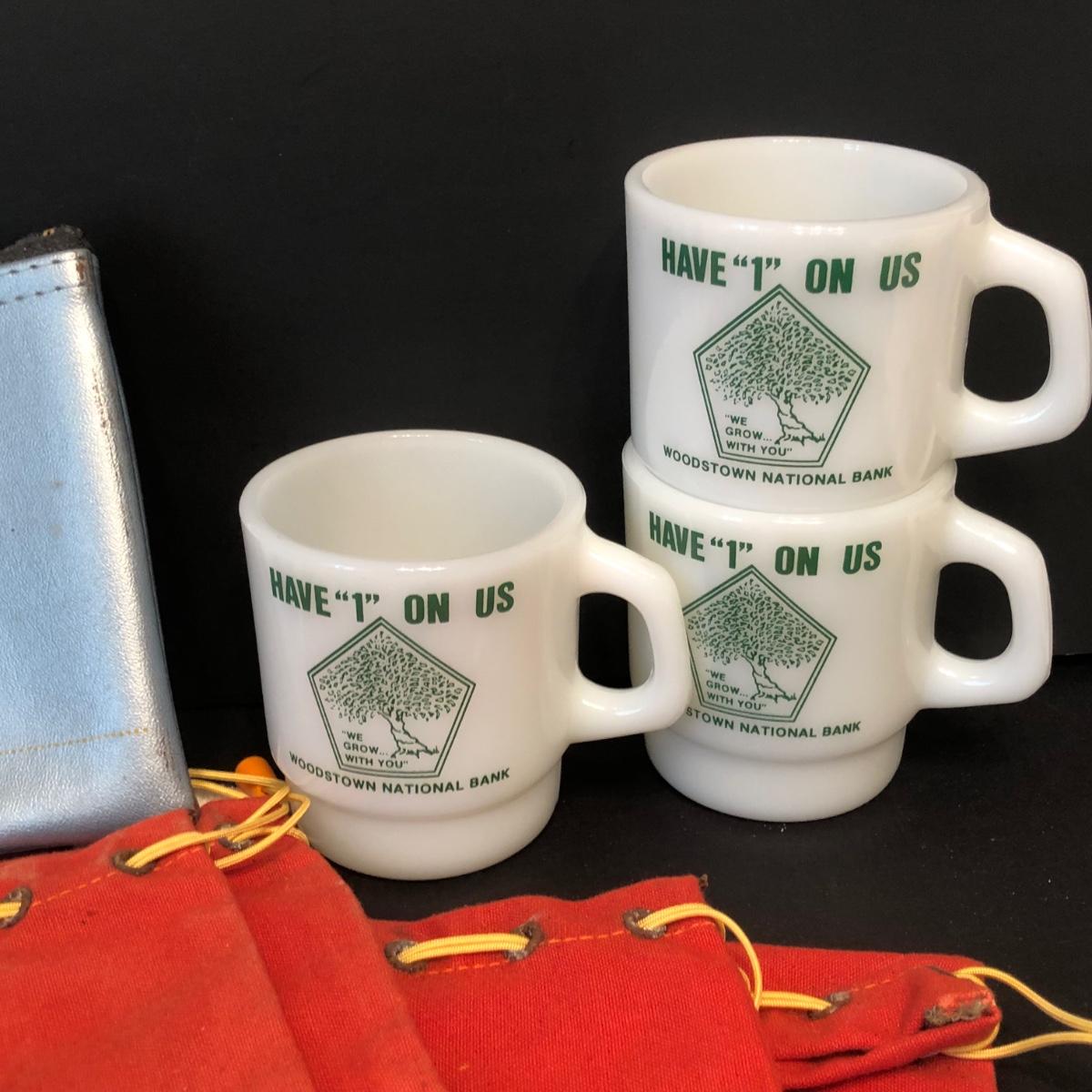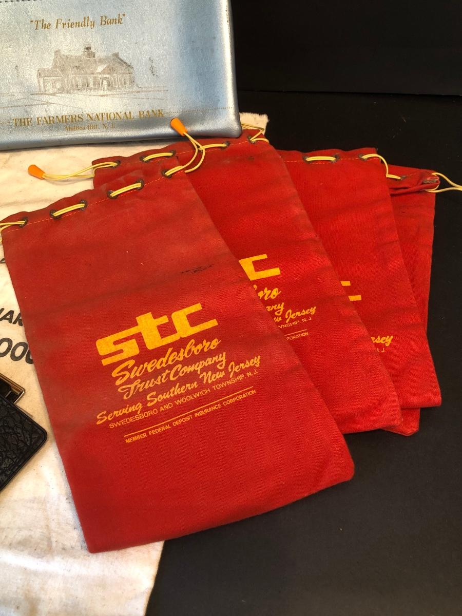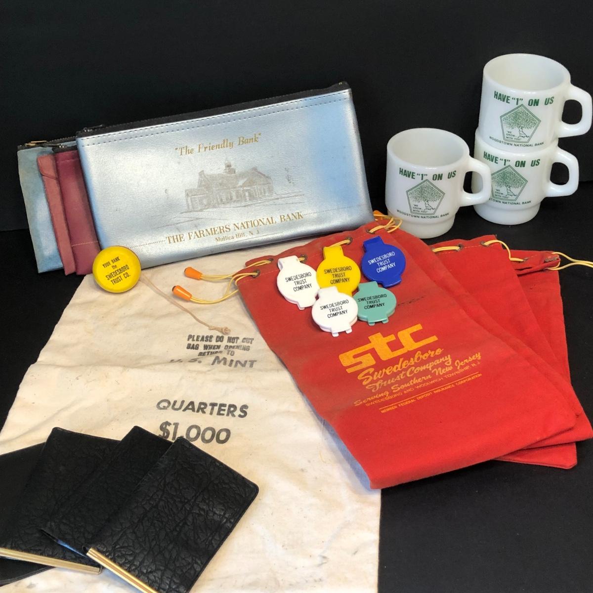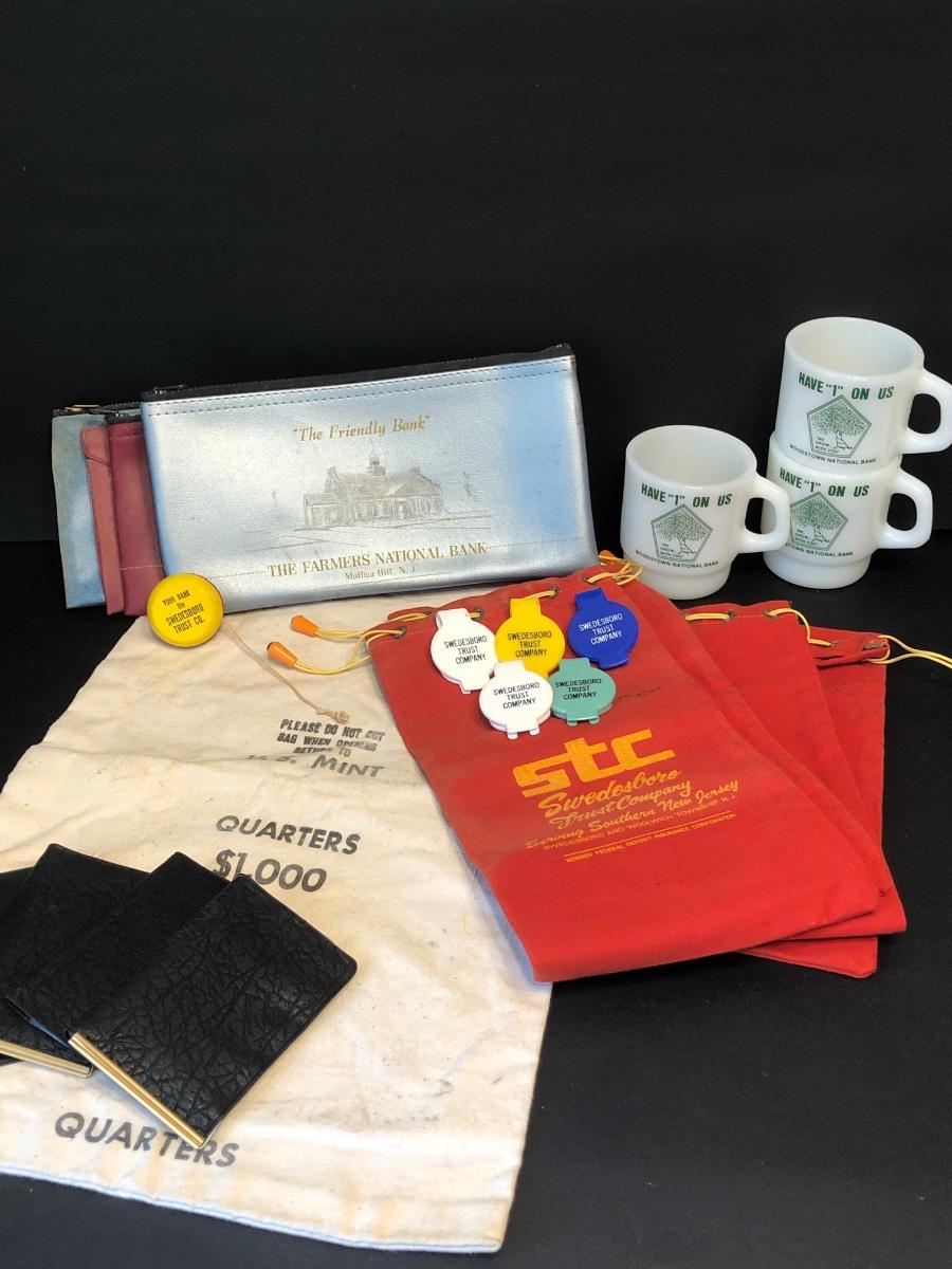 LOT 169M: Local Bank Lot - Woodstown National Bank Milk Glass Mugs, US Mint Quarters Bag, Swedesboro Trust Company Deposit Bags, Farmers National Bank Deposit Bags & More