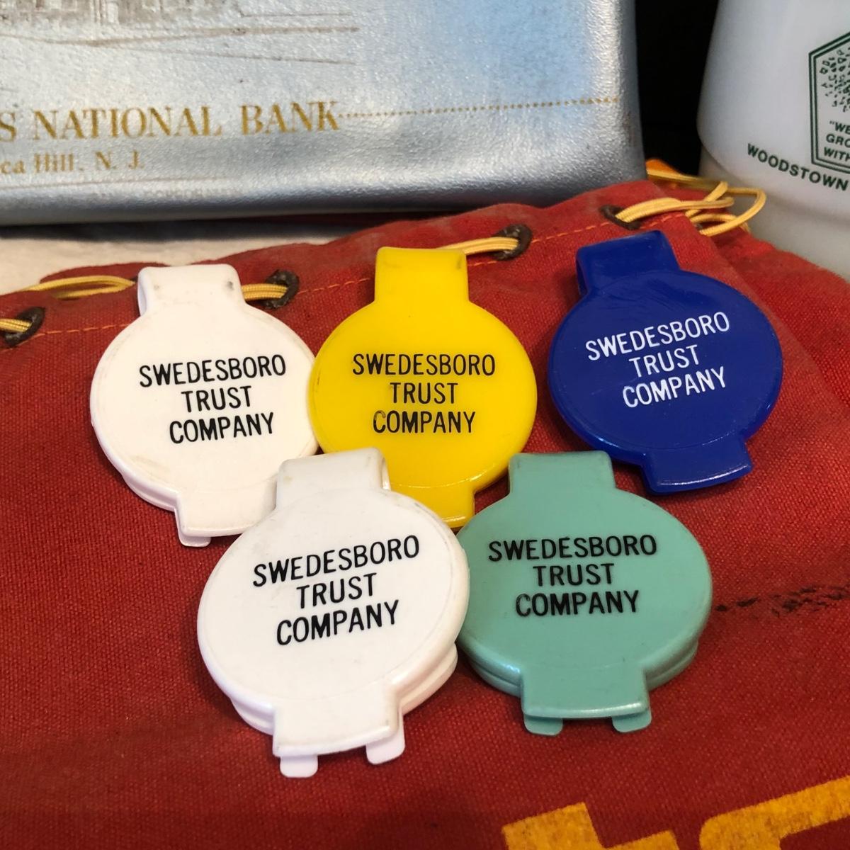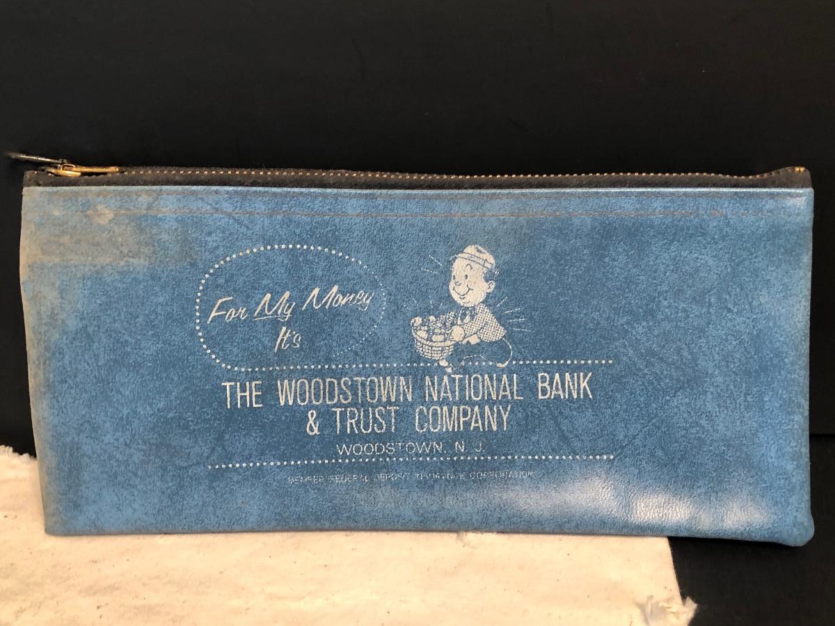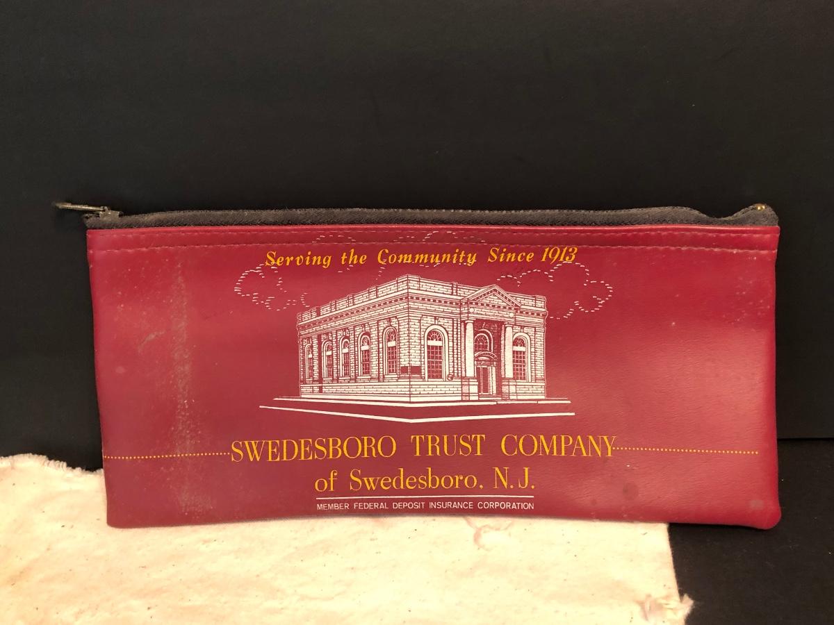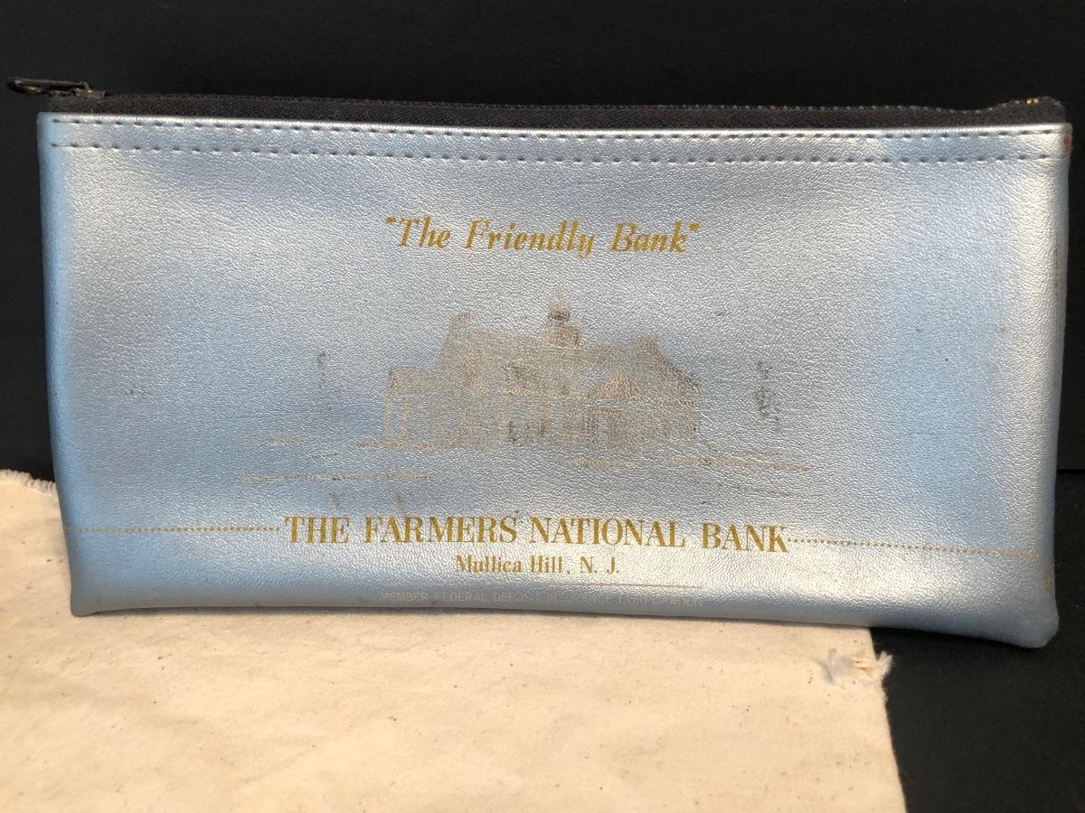 LOT 169M: Local Bank Lot - Woodstown National Bank Milk Glass Mugs, US Mint Quarters Bag, Swedesboro Trust Company Deposit Bags, Farmers National Bank Deposit Bags & More