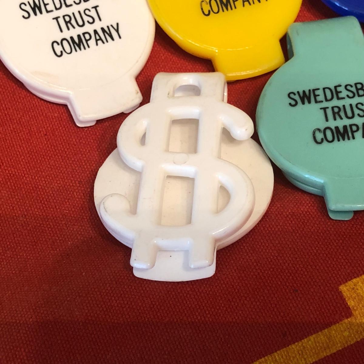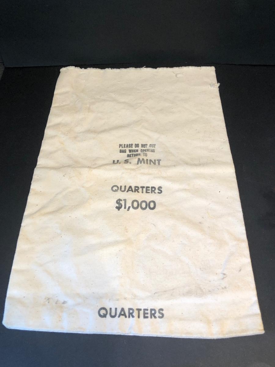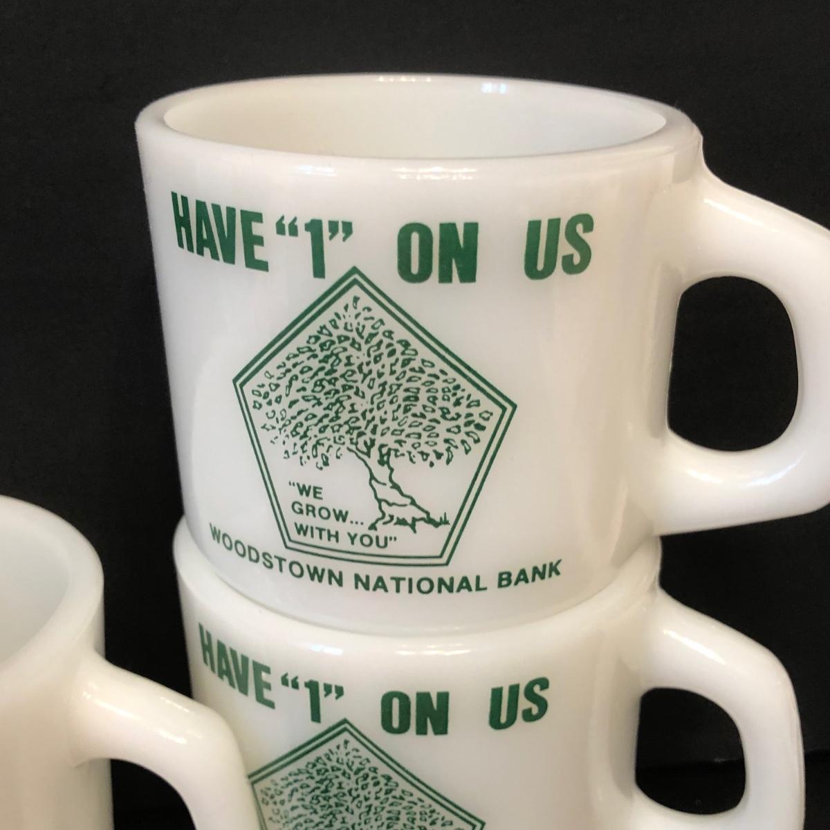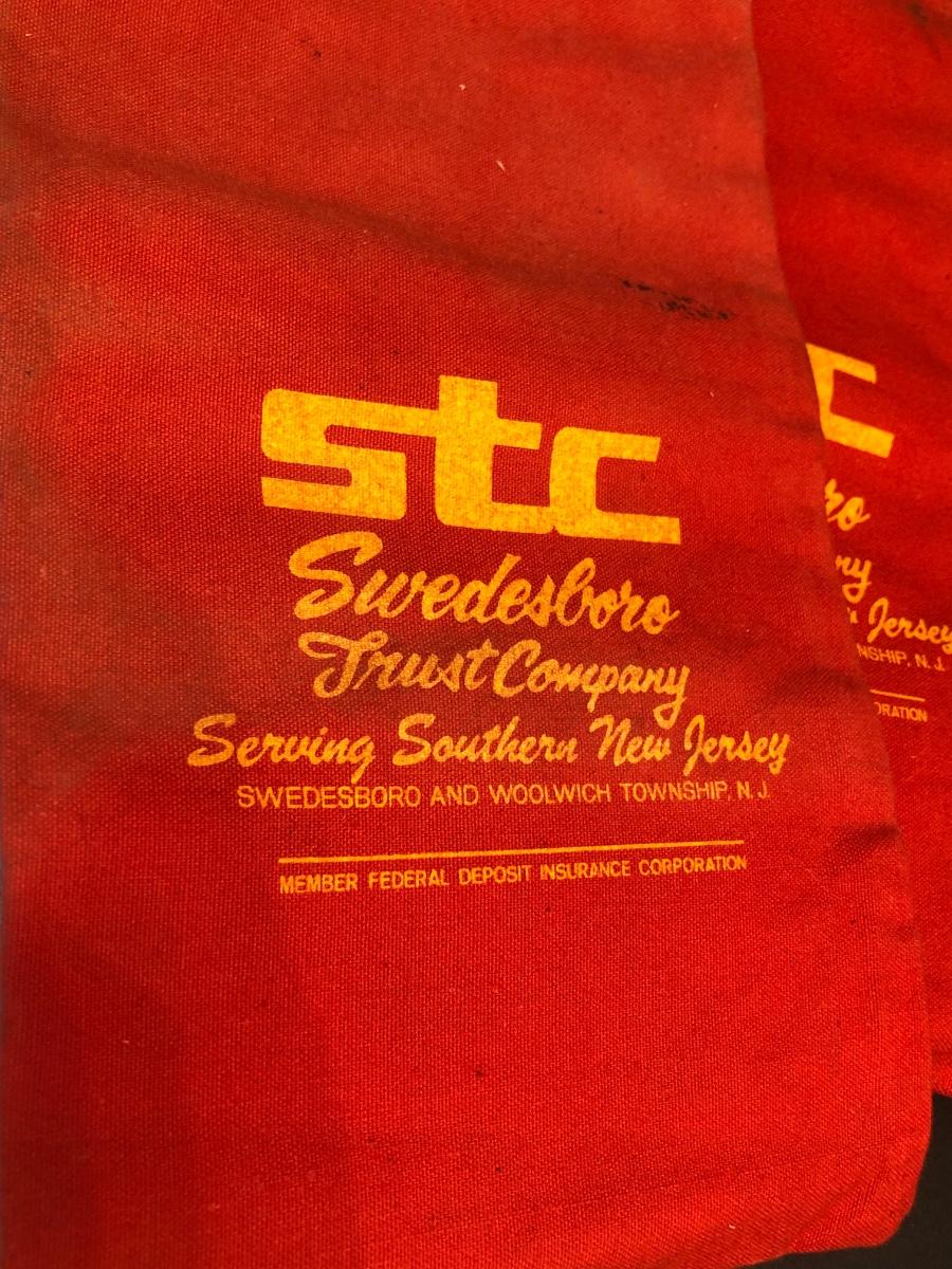 LOT 169M: Local Bank Lot - Woodstown National Bank Milk Glass Mugs, US Mint Quarters Bag, Swedesboro Trust Company Deposit Bags, Farmers National Bank Deposit Bags & More