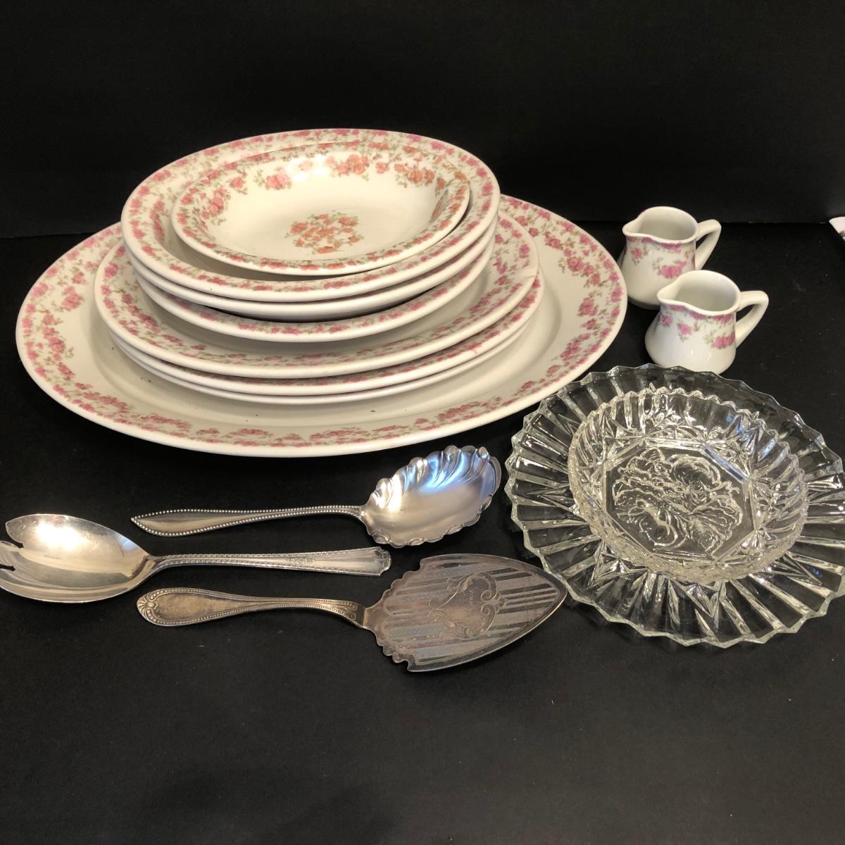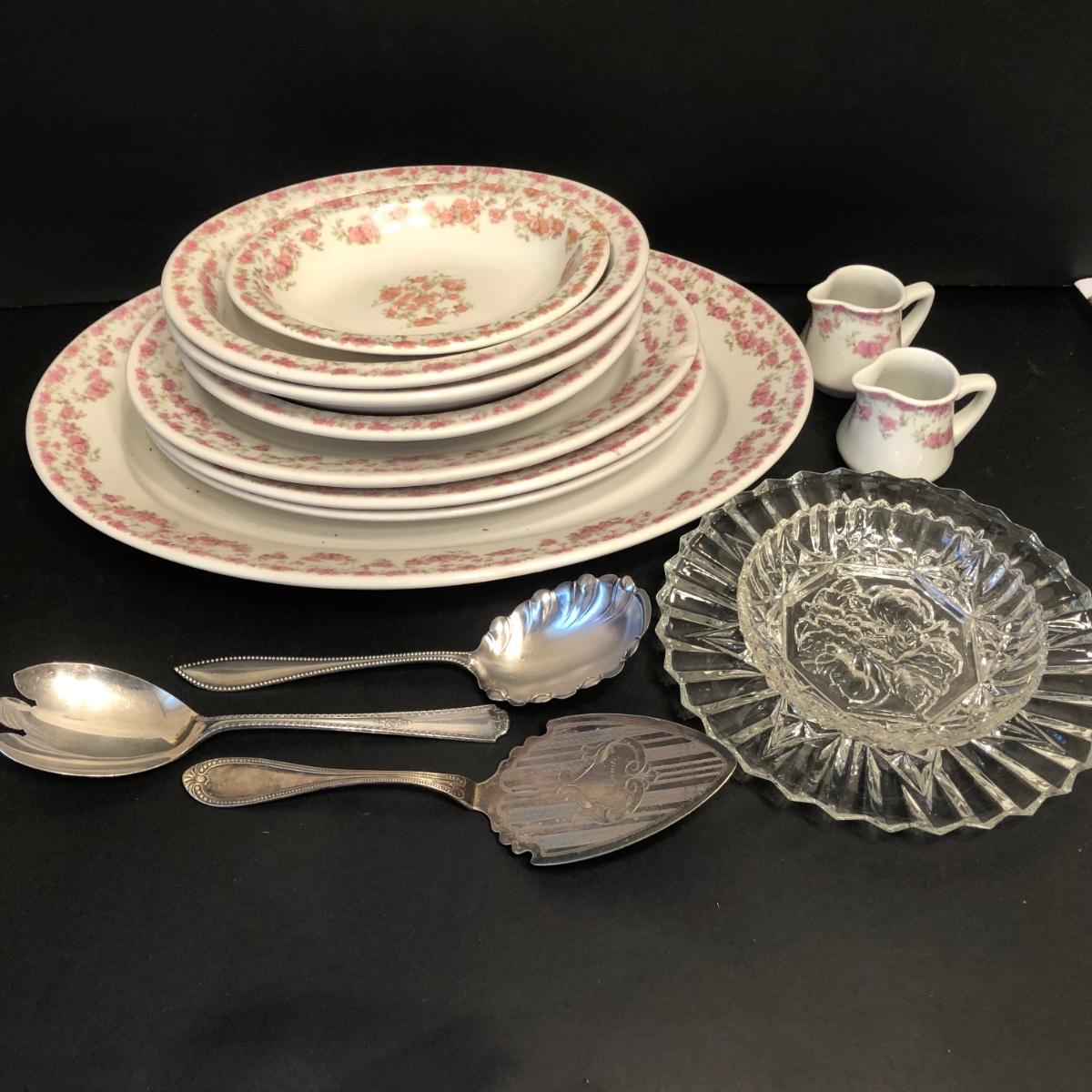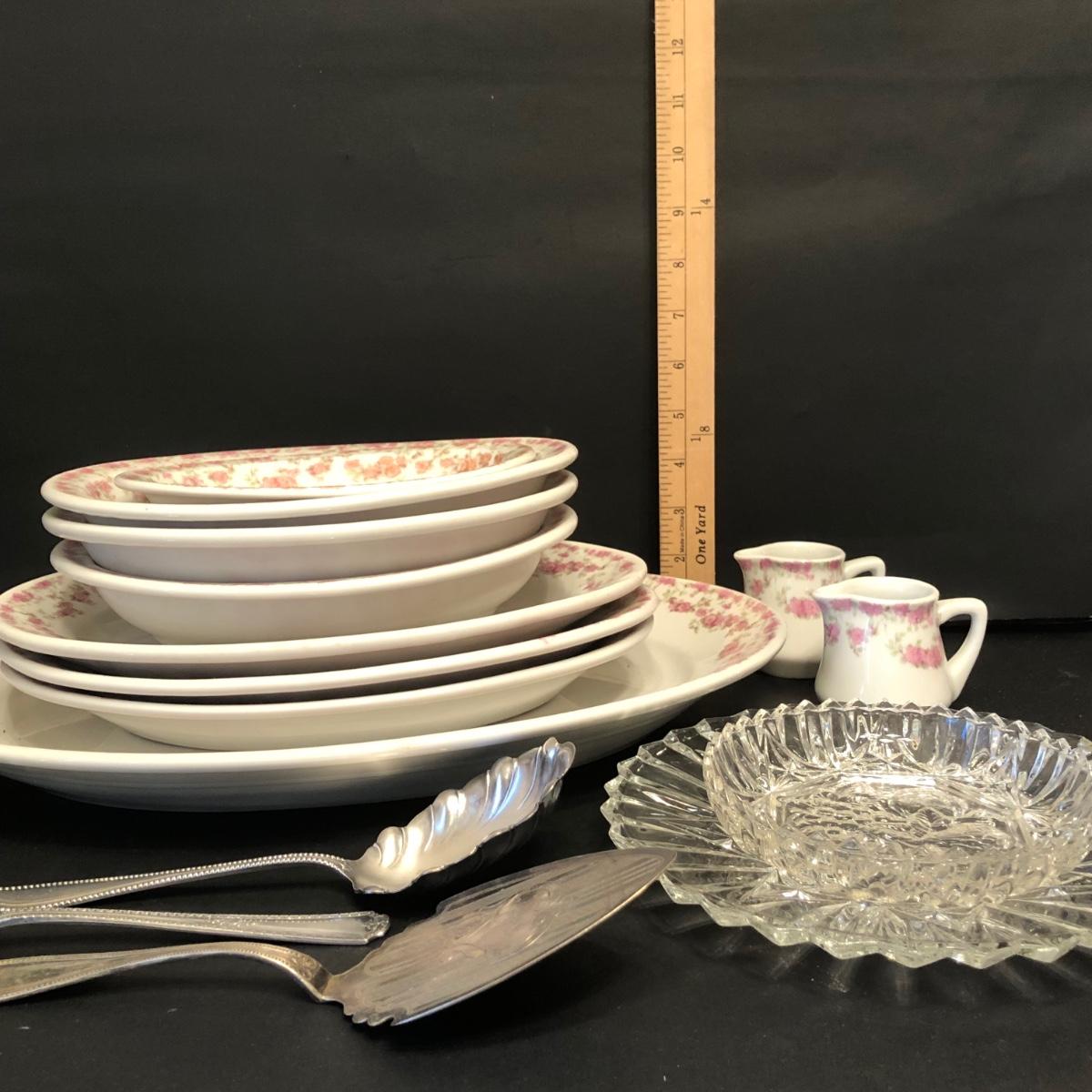 LOT 171M: Lamberton China Serving Platters, Federal Crystal Dish, Silver Plate Serving Utensils
