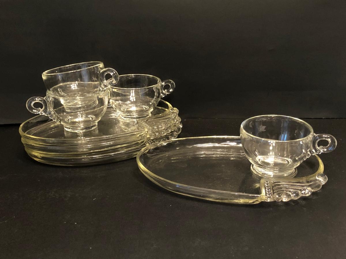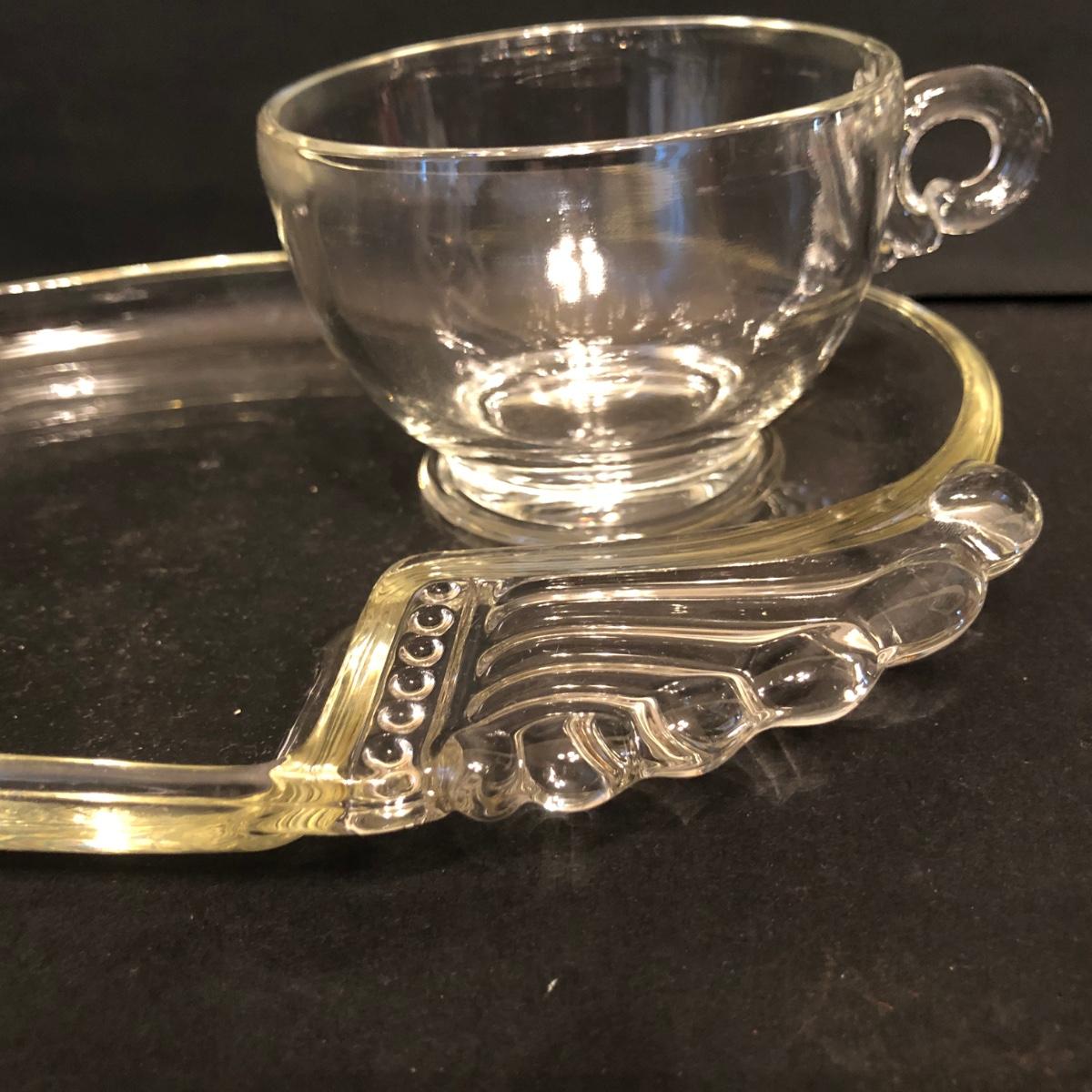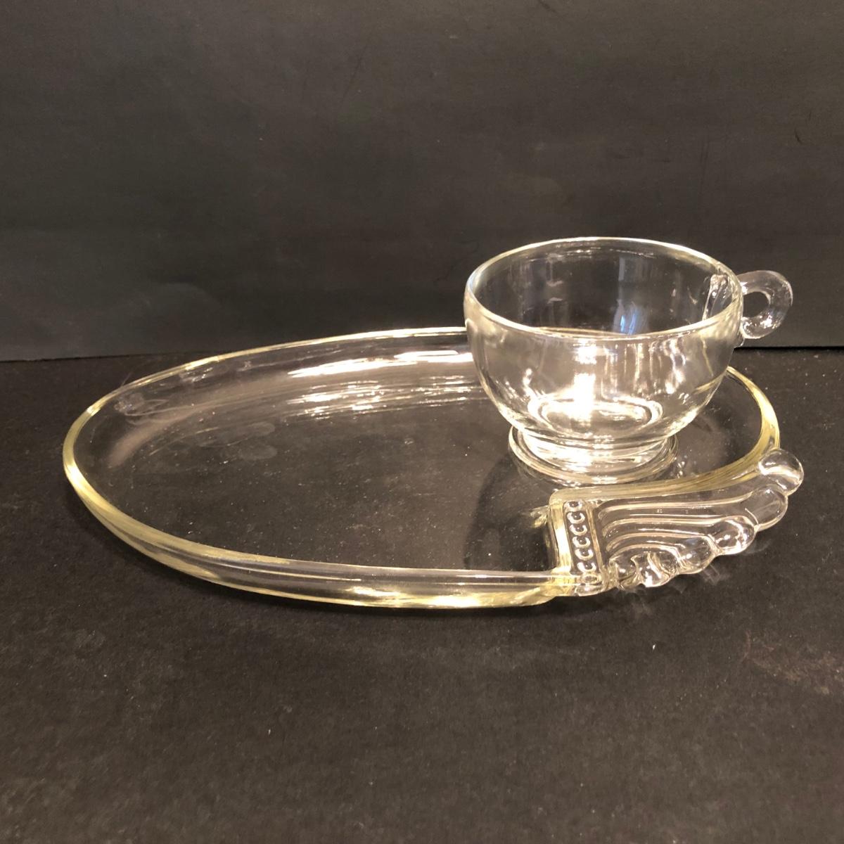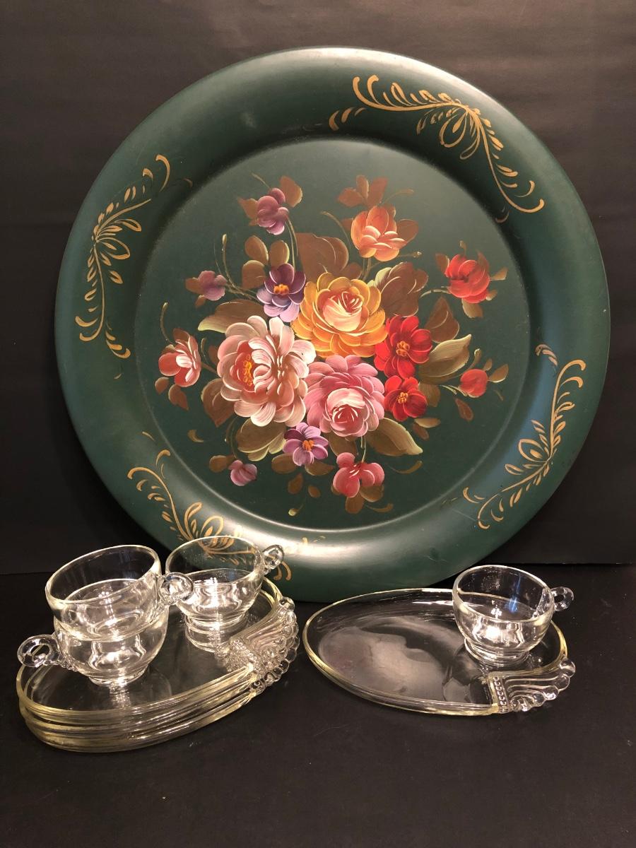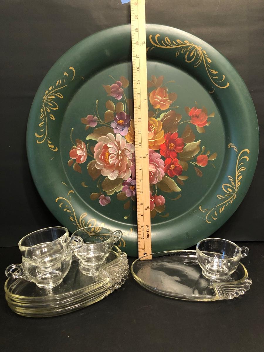 LOT 172M: Large Hand Painted Decor Piece & 1940s Art Deco Hazel Atlas Glass Parti-Ade Snack Plates & Cups (4)