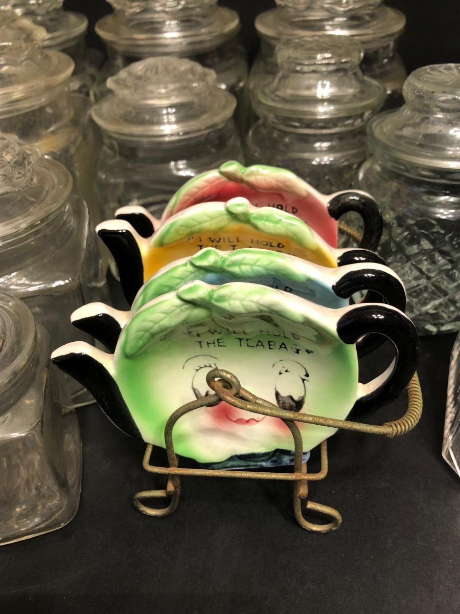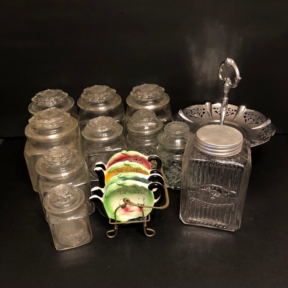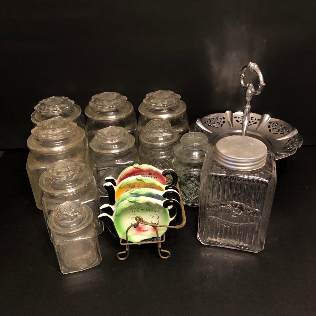 LOT 174M: Ceramic Tea Bag Holders w/ Rack, Tea Jar, Cookie Plate & Glass. Kitchen Canisters