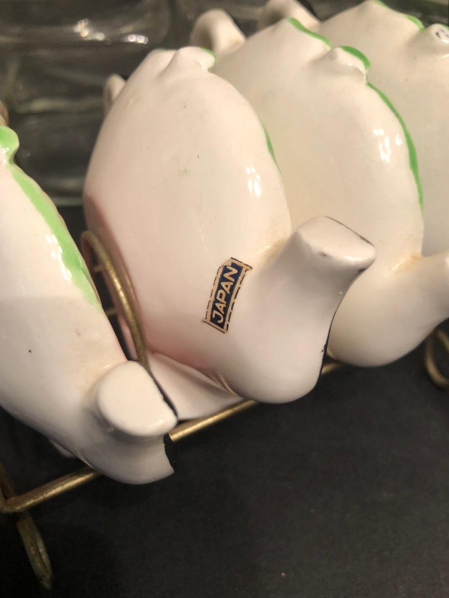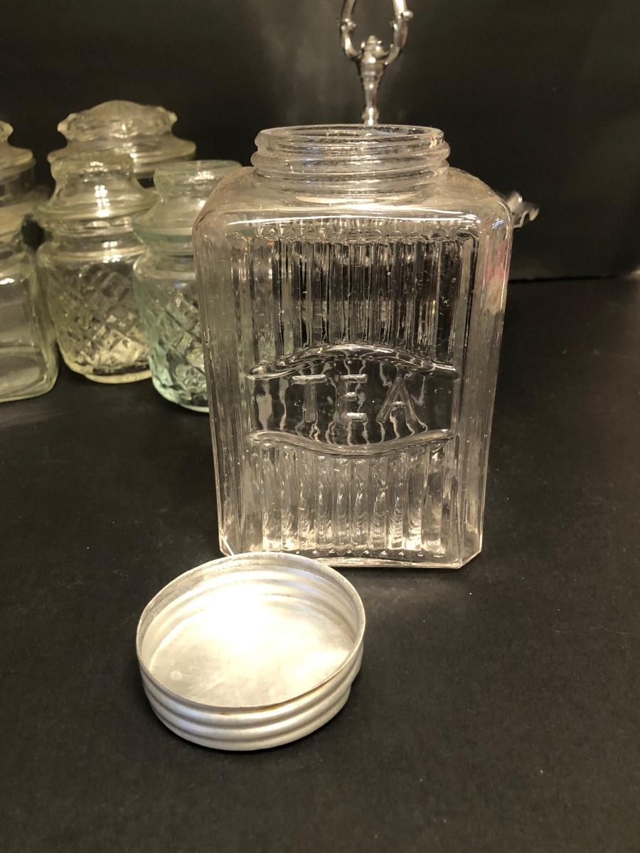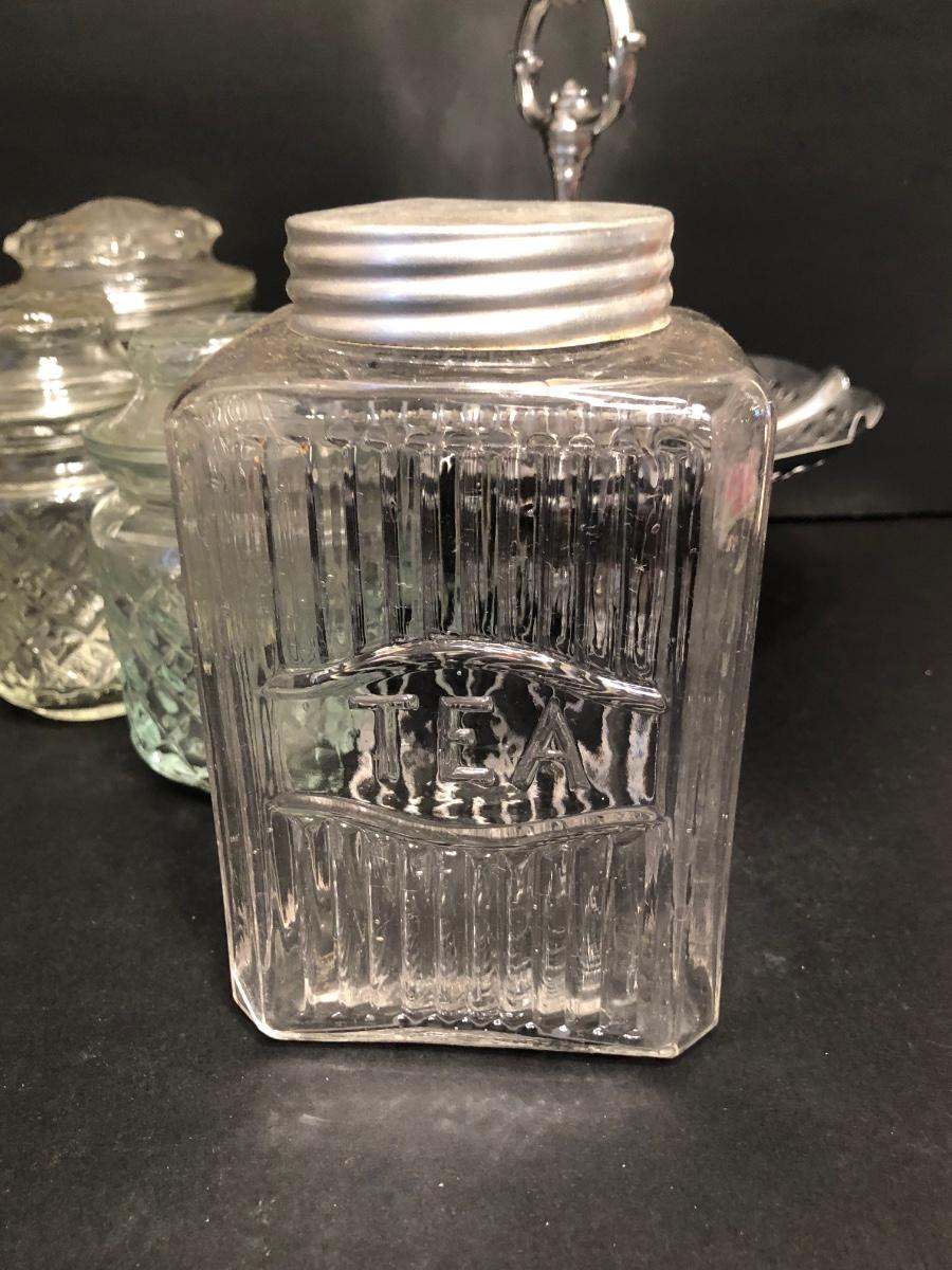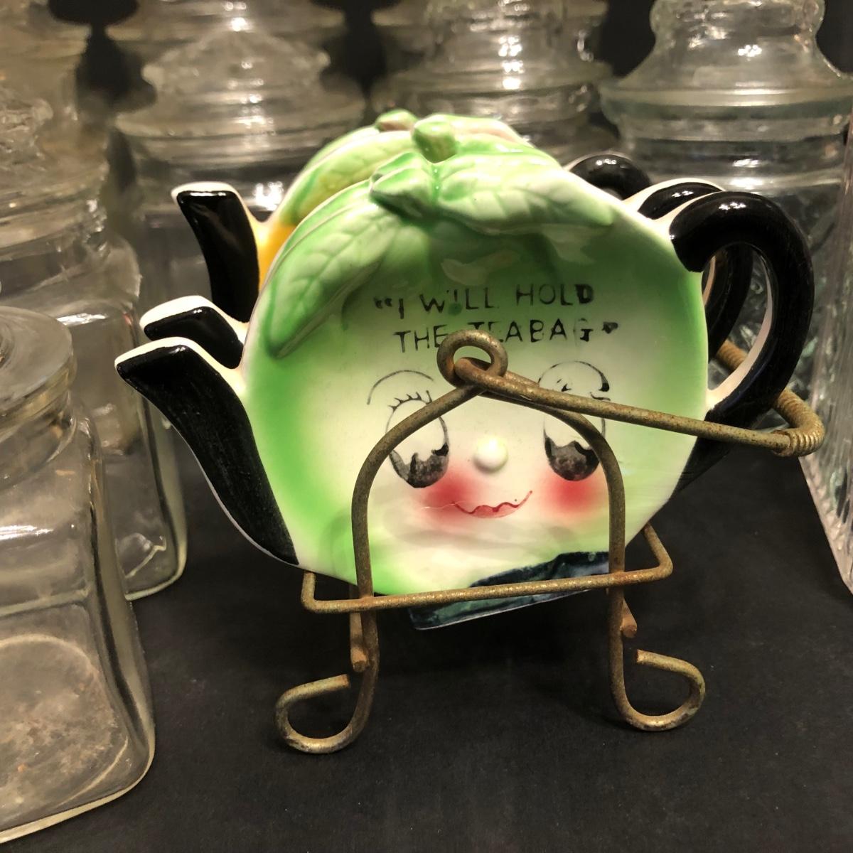 LOT 174M: Ceramic Tea Bag Holders w/ Rack, Tea Jar, Cookie Plate & Glass. Kitchen Canisters