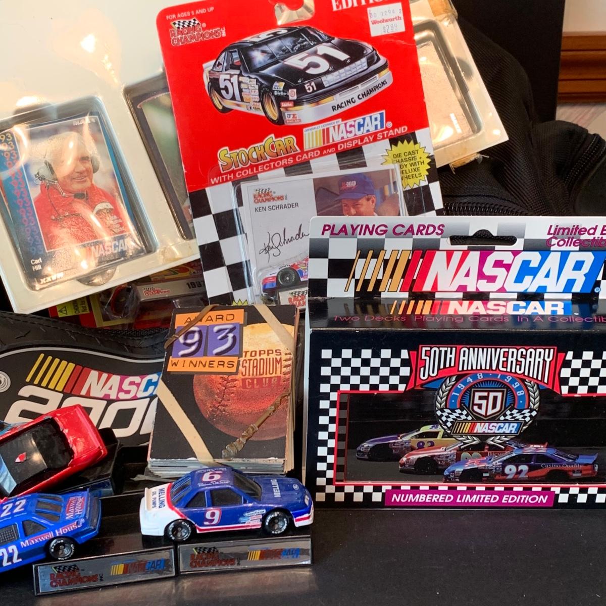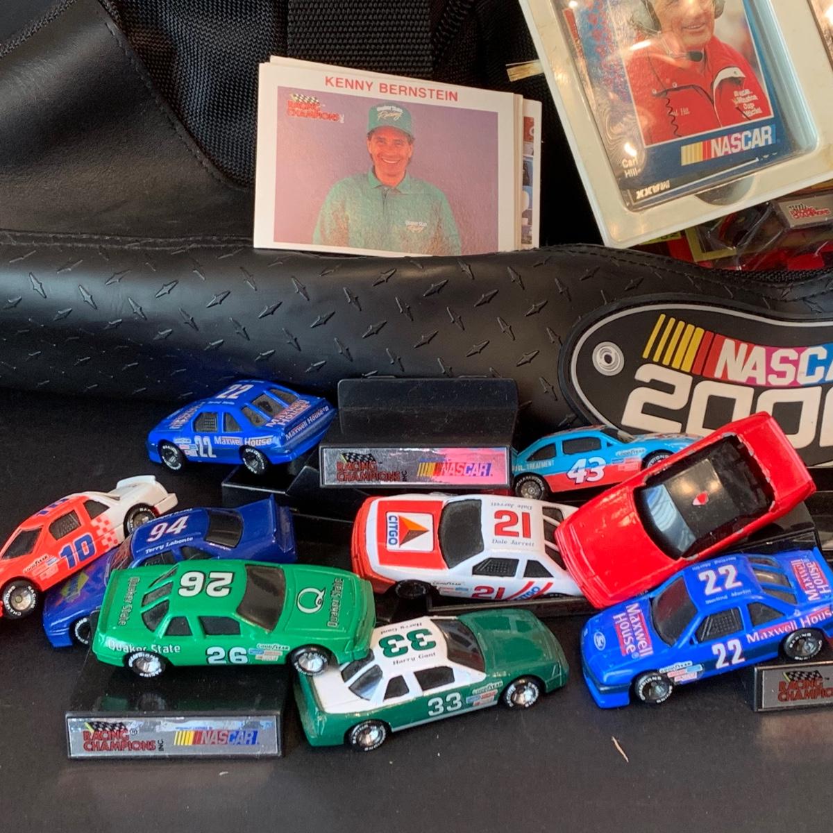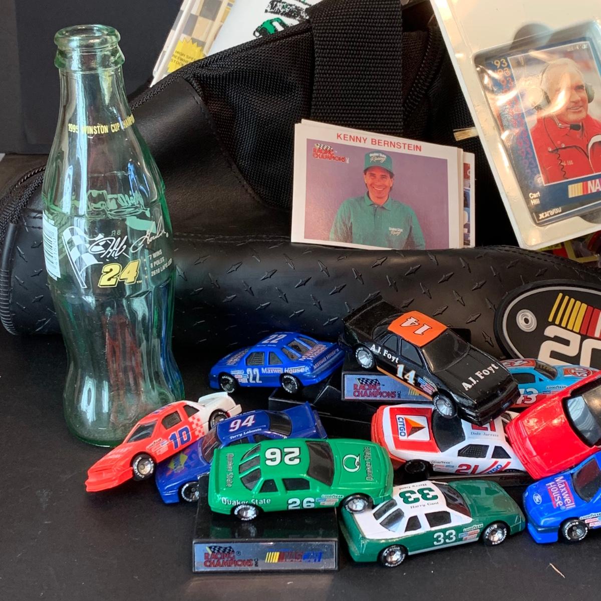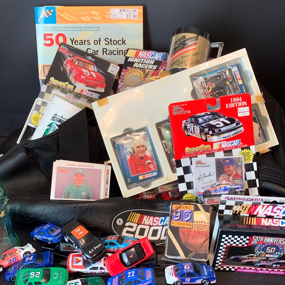LOT 182R: Large Collection of Nascar Cars, Trading Cards, Duffle Bag etc.