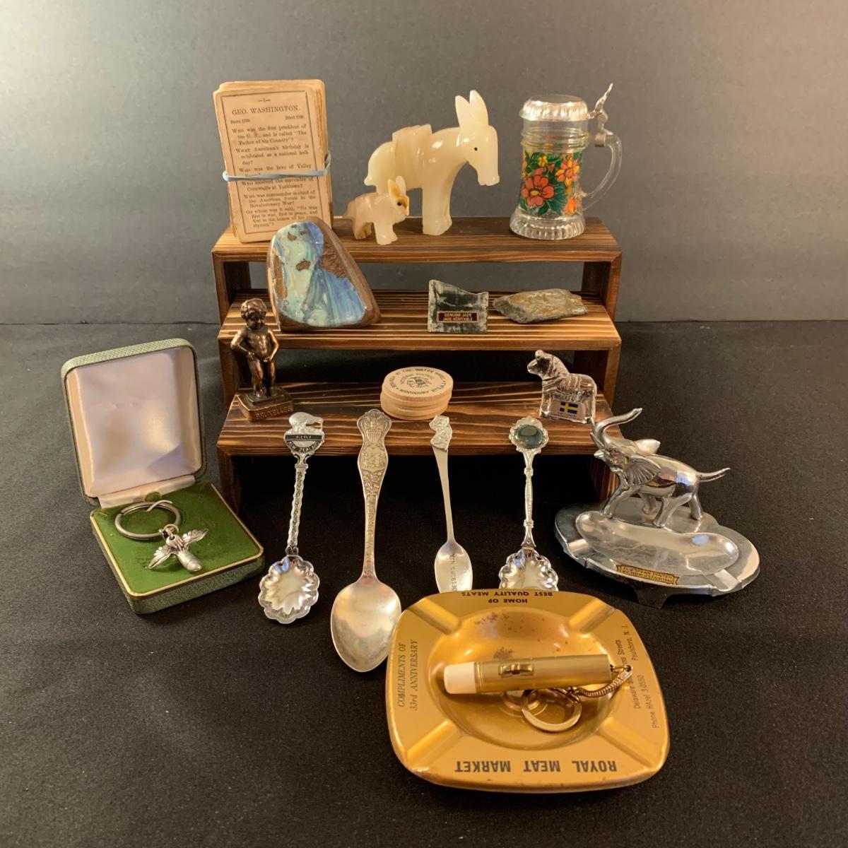 Dala Horse Crystal Miniature Figurine LINDSHAMMAR Sweden Art Glass, World's Fair Elephant Ashtray Vintage Trivia Cards, Royal Meats Ashtray, Carved Stone Donkey's, Pava Shell Spoon, Wooden Nickles & so much more.