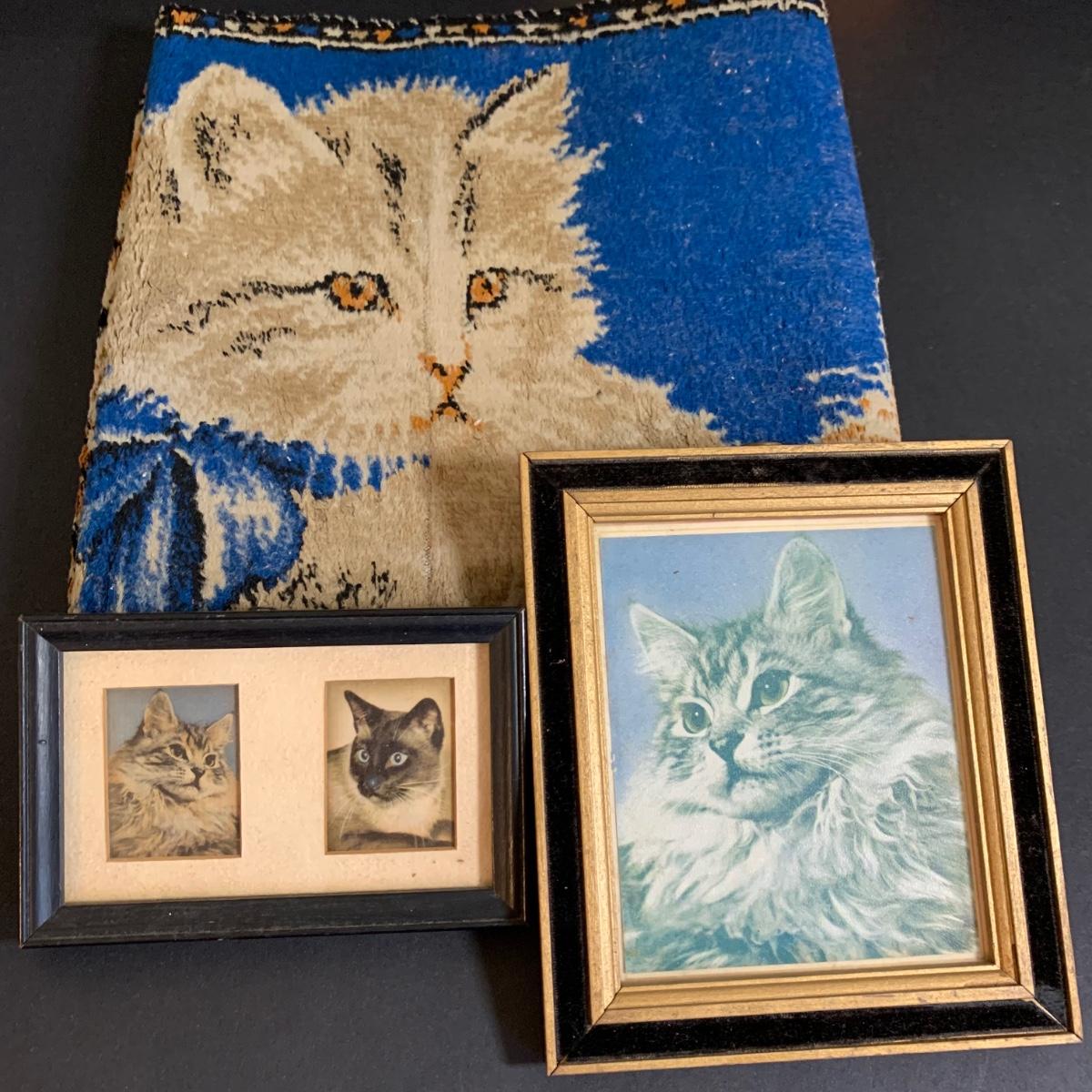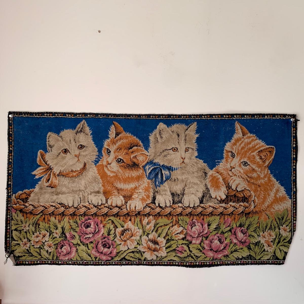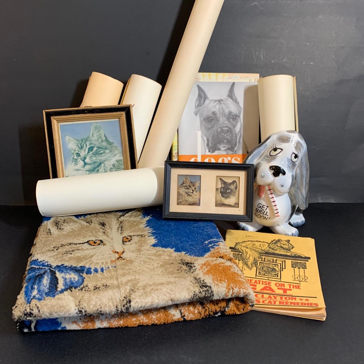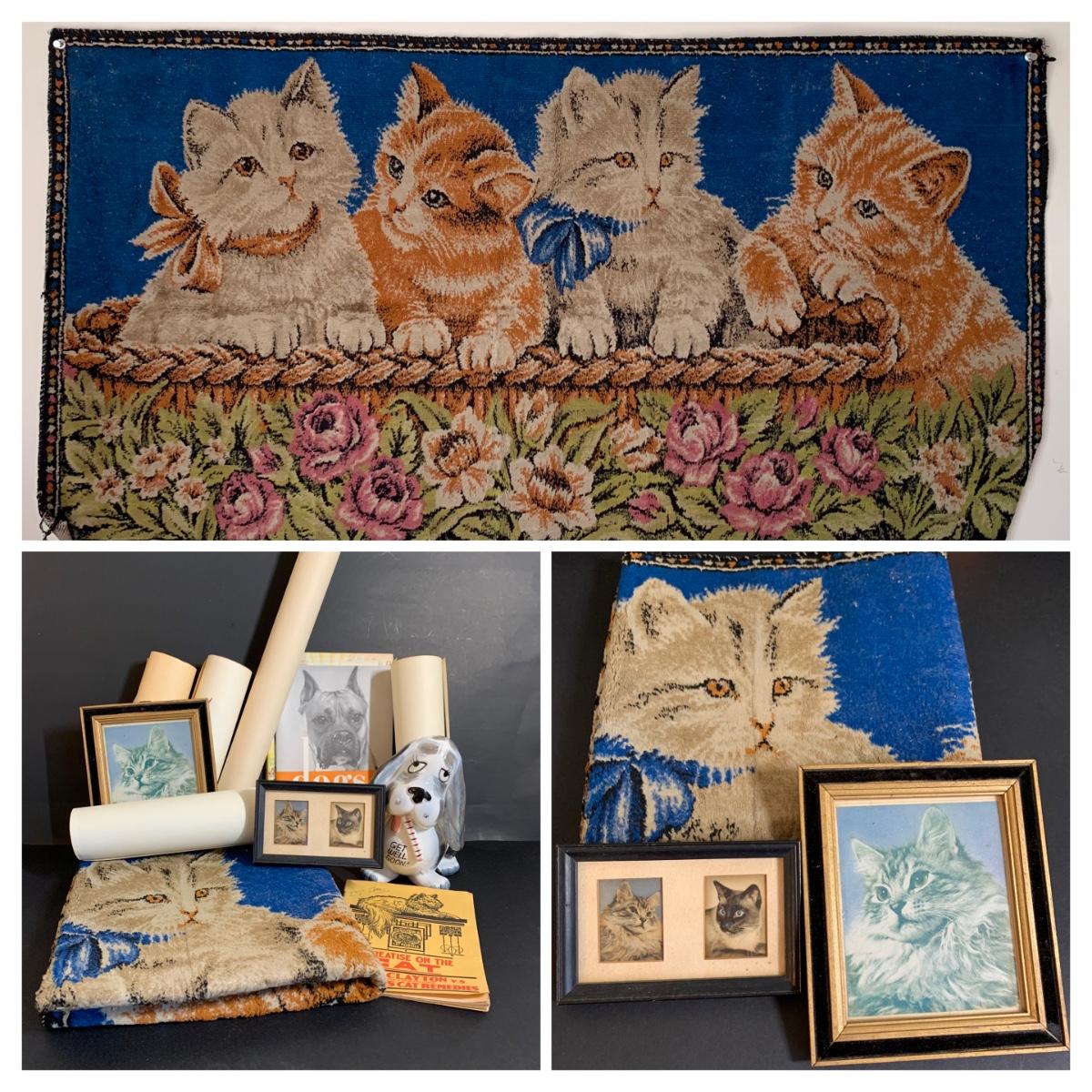 LOT 197R: Cats & Dogs: 3-Kittens Tapestry, Florence Kroger Kitten Cat Lithograph Prints, Get Well Doggy Planters & More