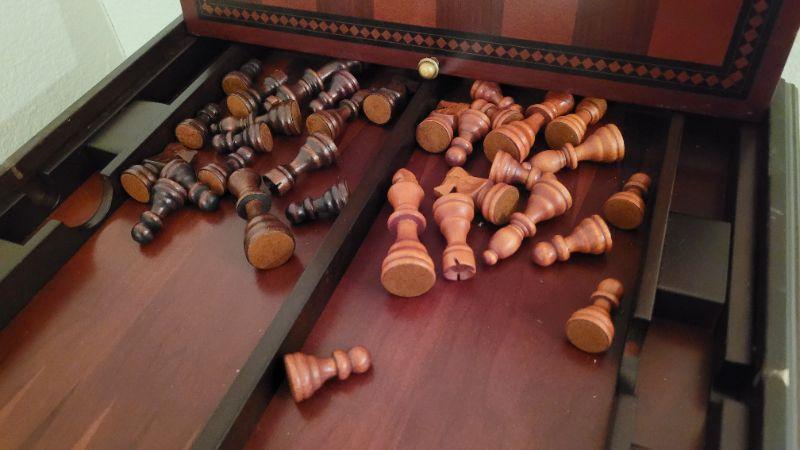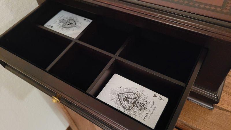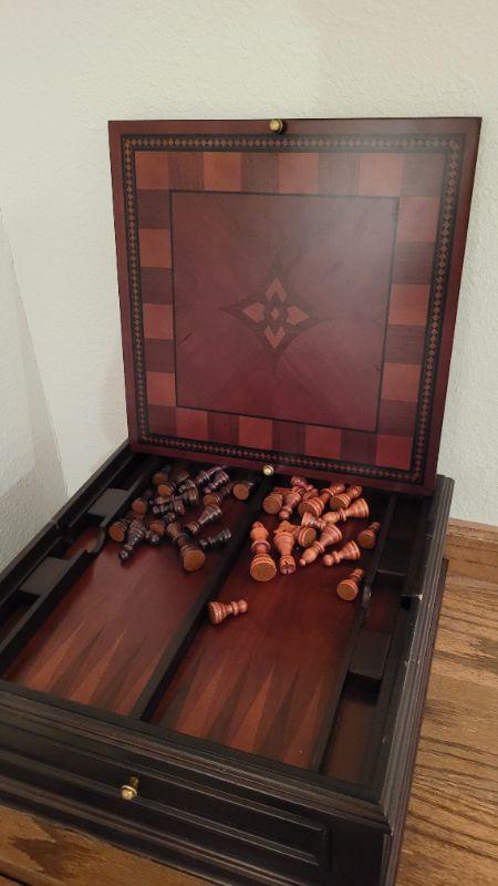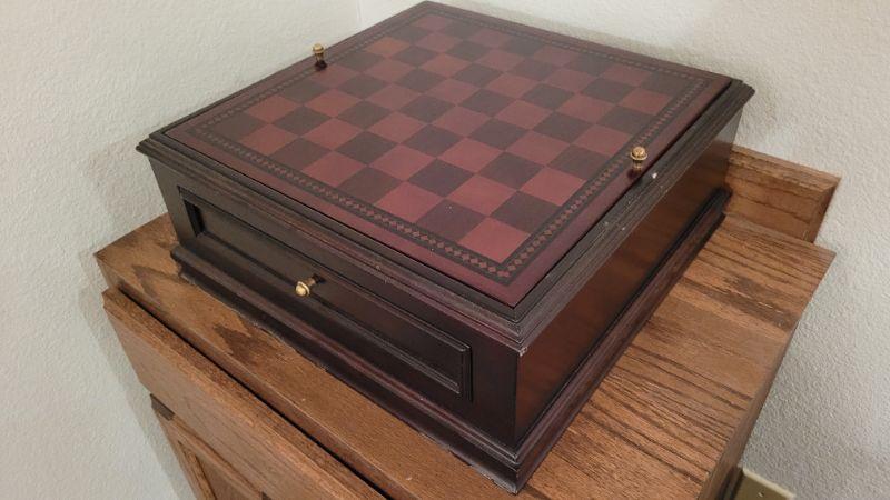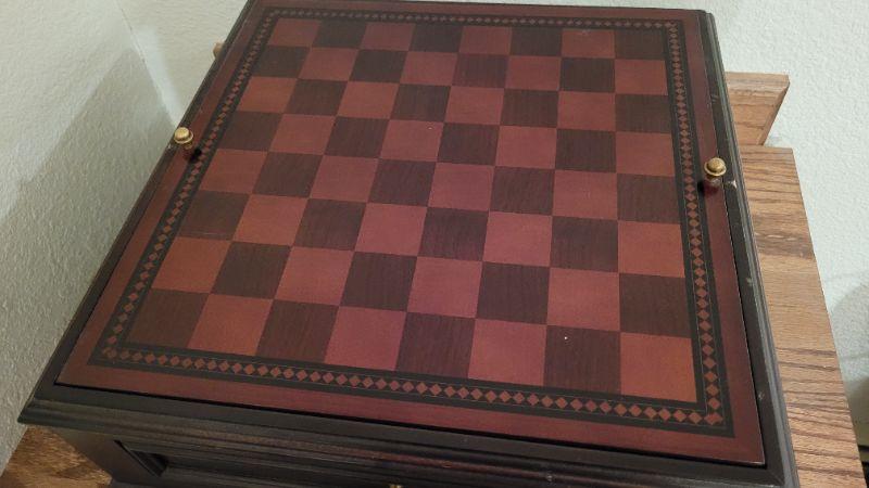 Lot 975: Flip Top Reversible Game Board w/ Various Options (Cards, Chess, etc.)