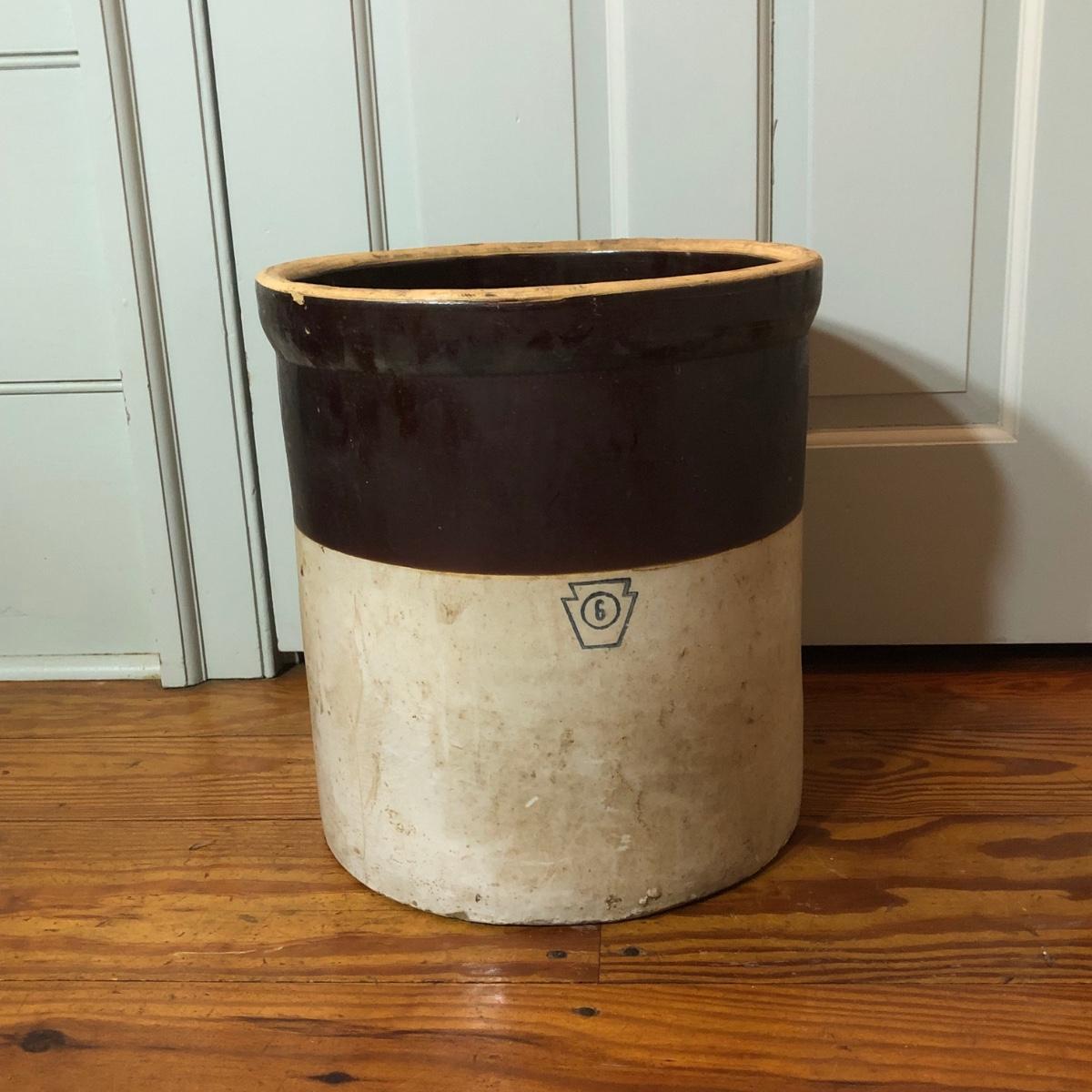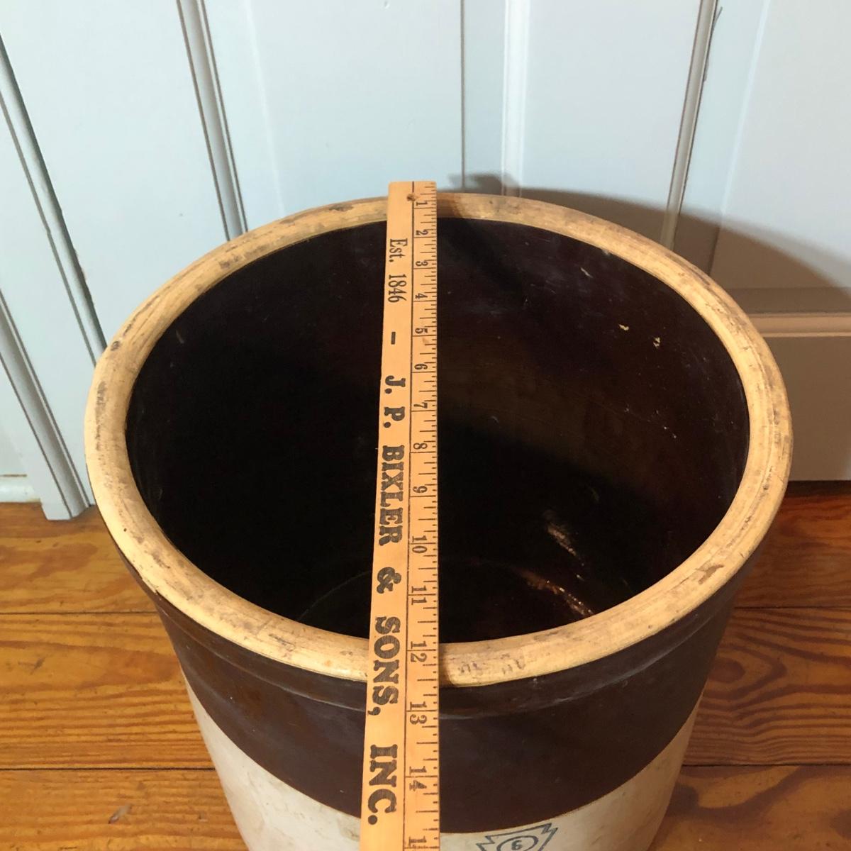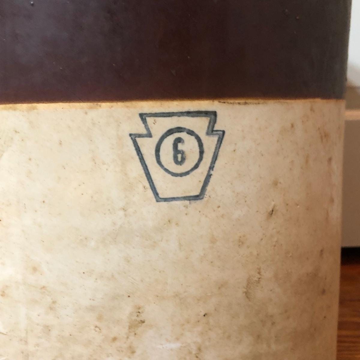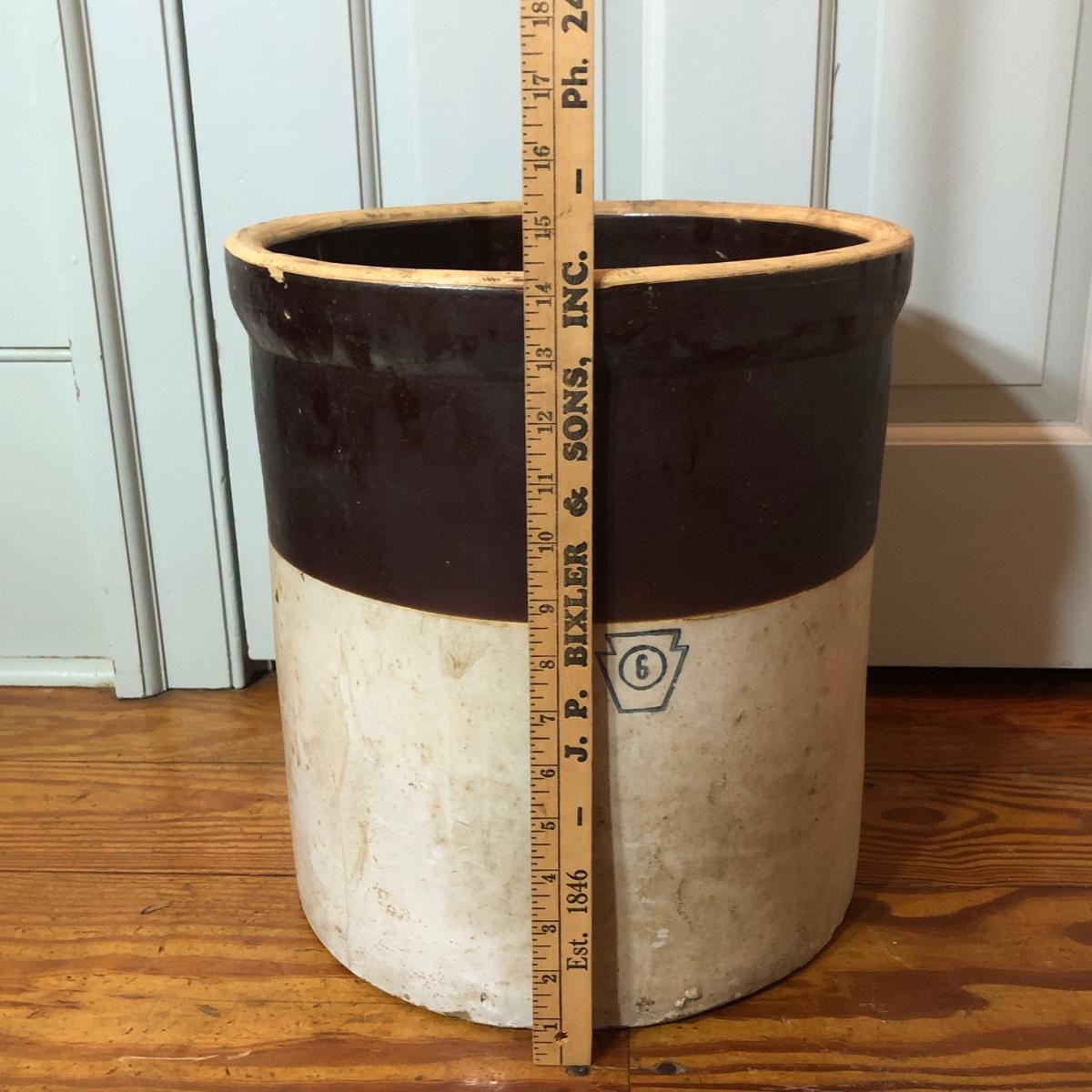 Crock is marked 6. Condition issues. Marked “leaks” on the bottom.