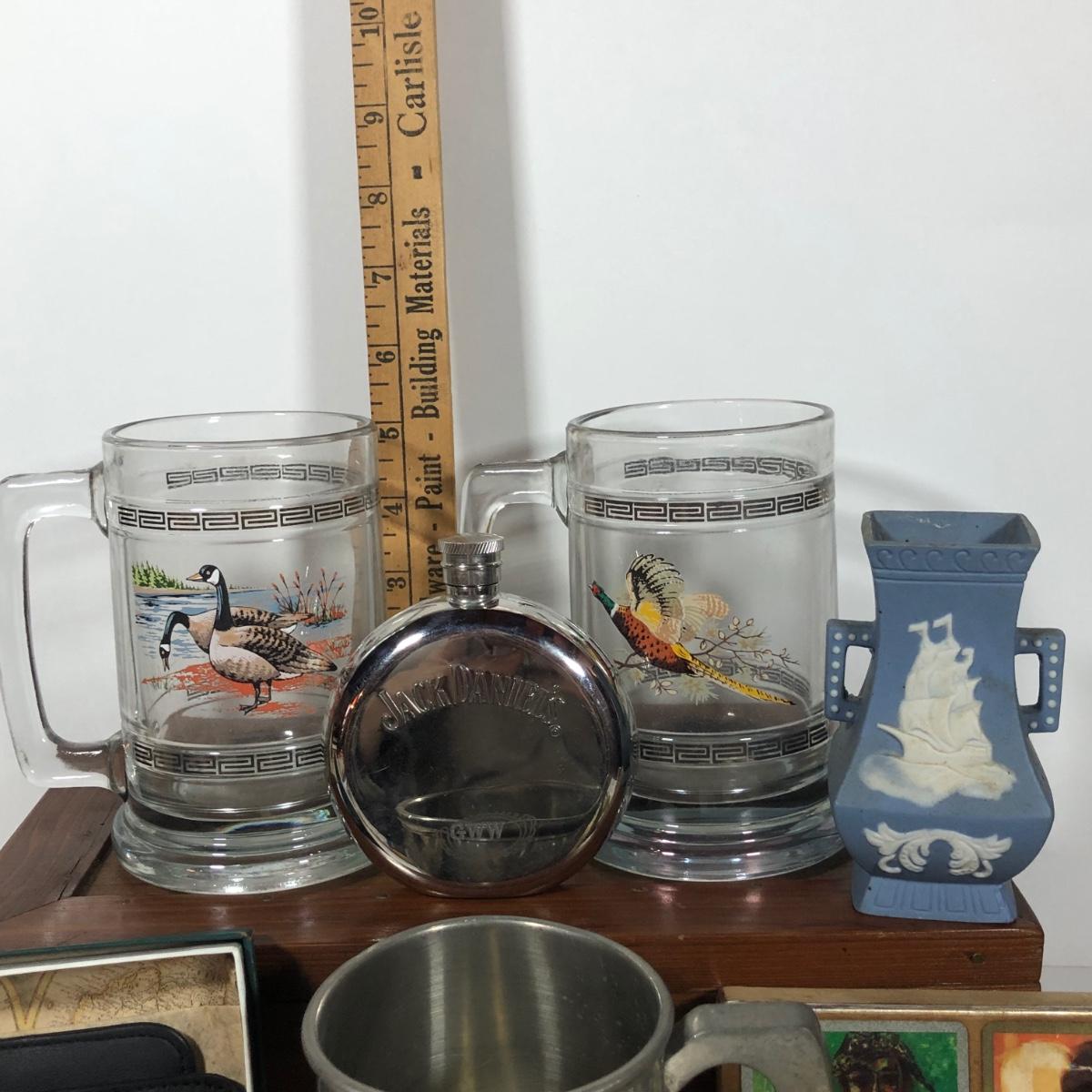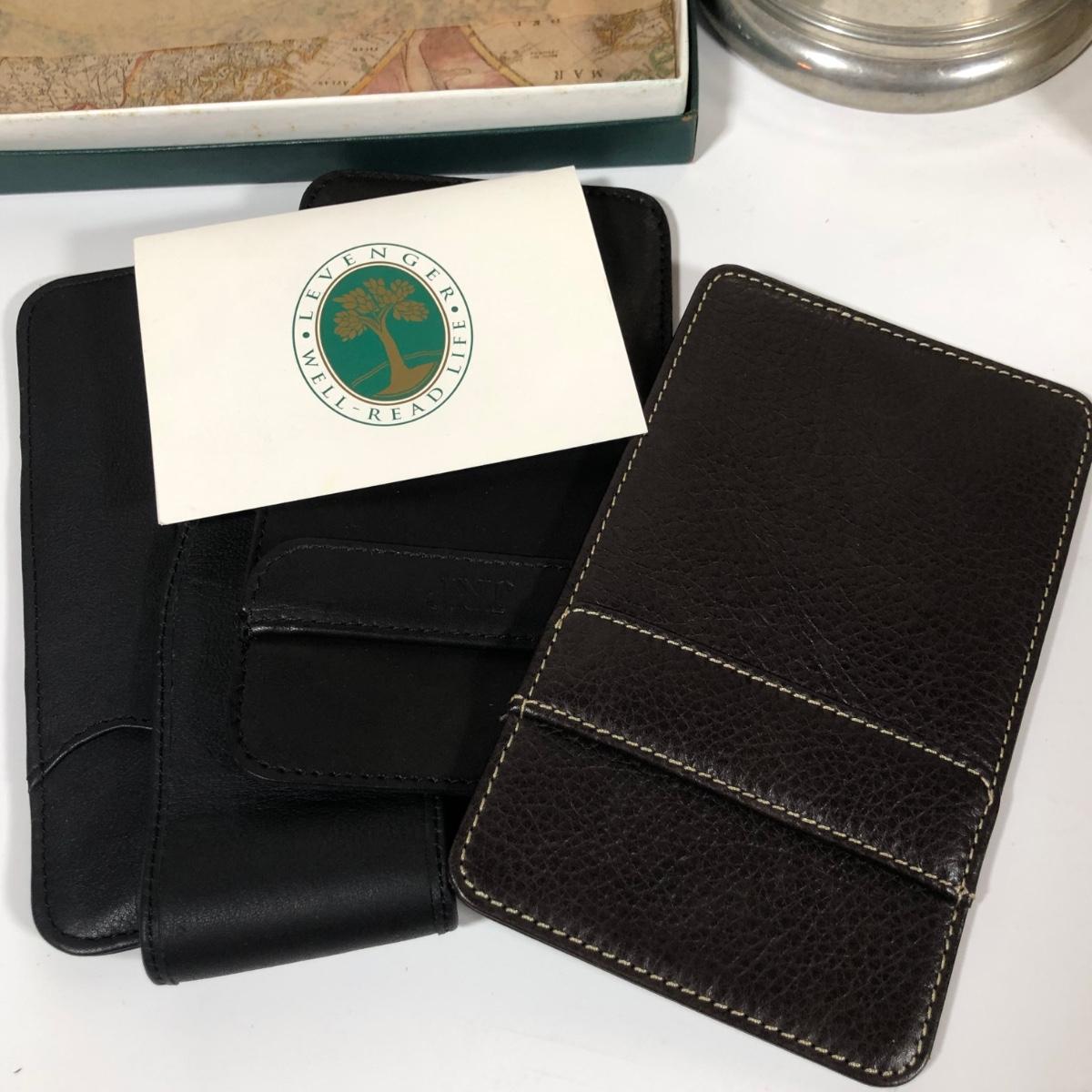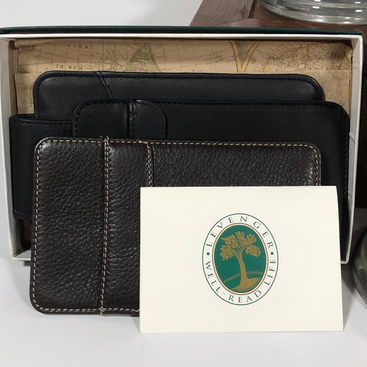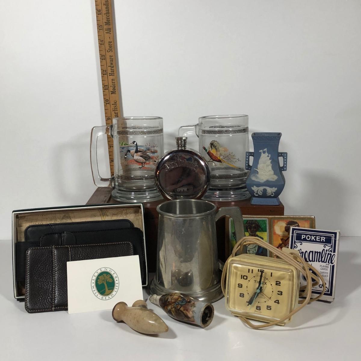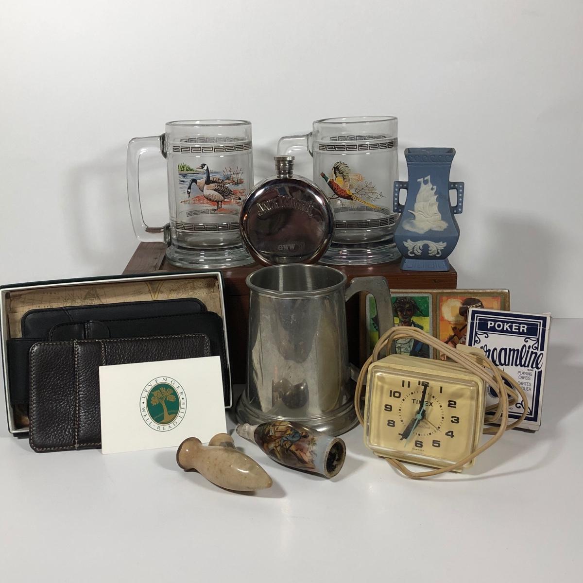 LOT 13L: Vintage Men’s Collection - Levenger Wallets, Bailey Banks & Biddle Congress Playing Cards, Jack Daniel’s Flask, Pipes, Wooden Dresser Box & More
