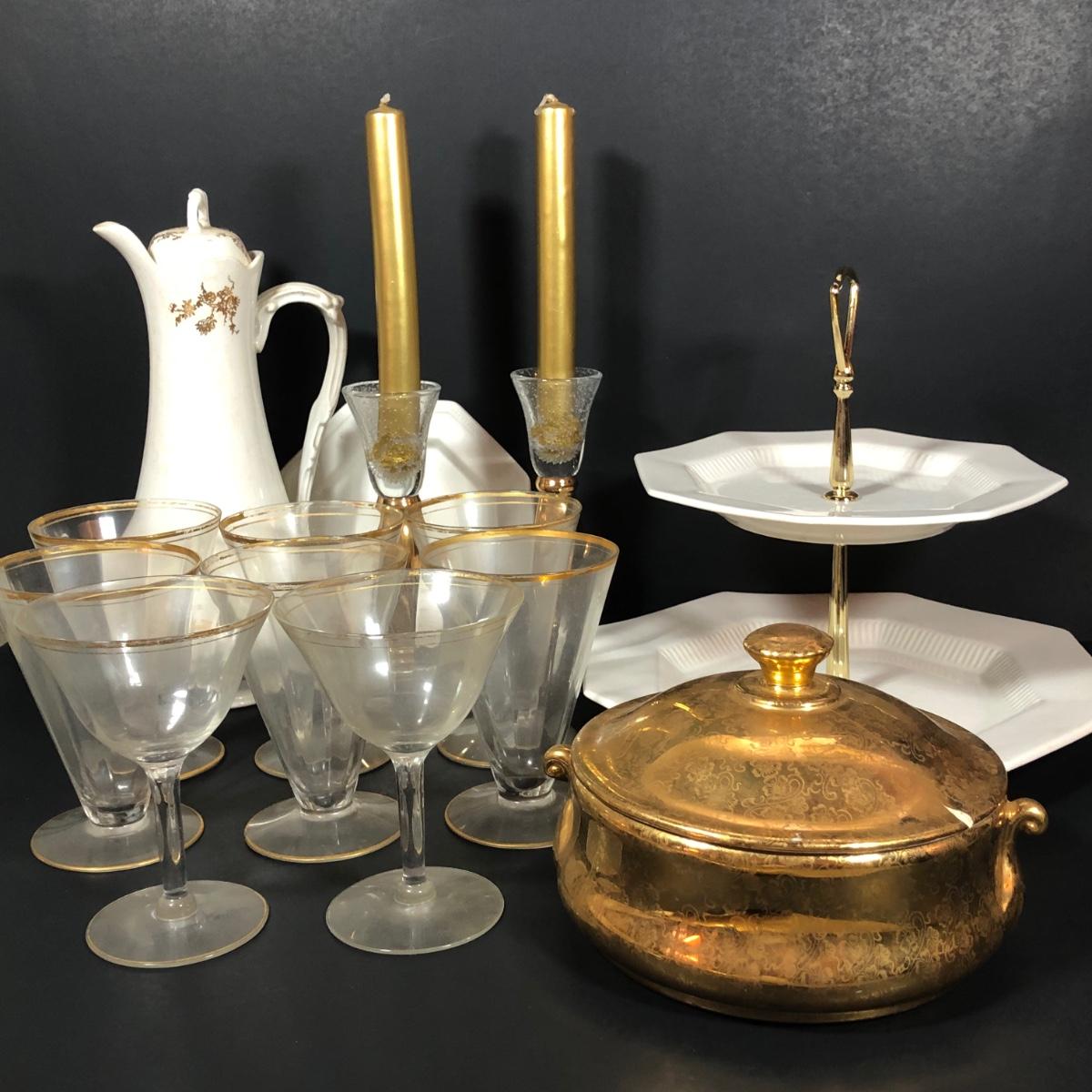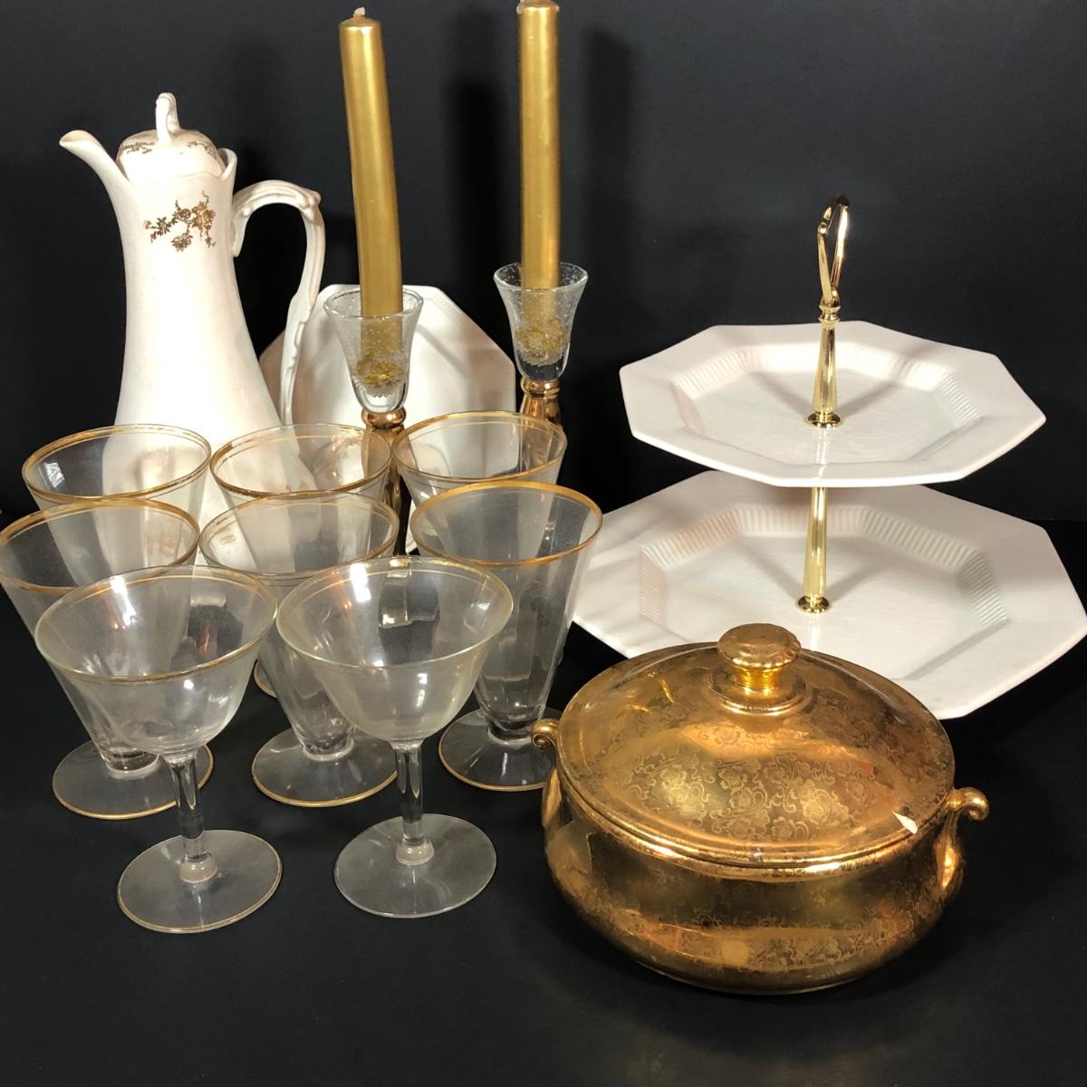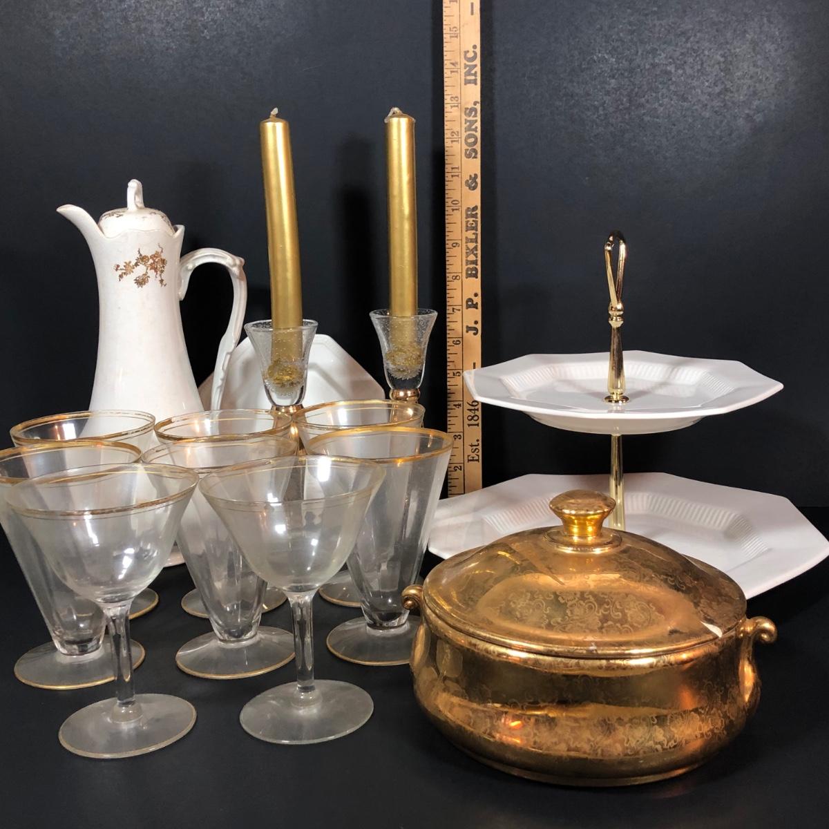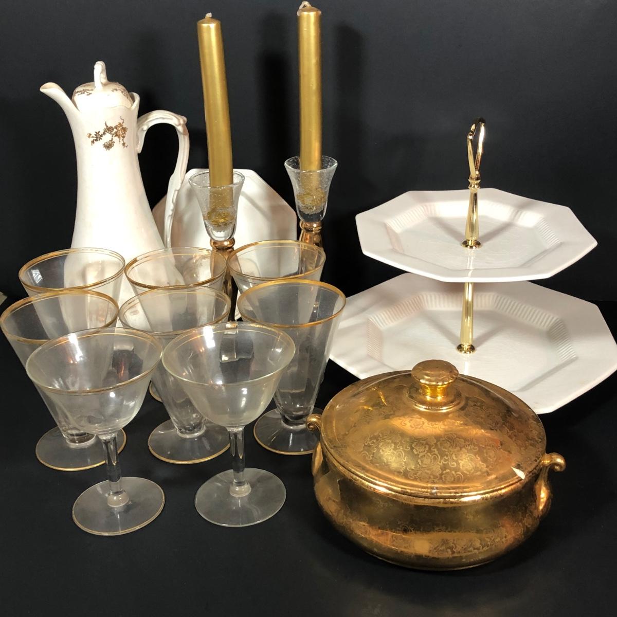 LOT 17L: Vintage Gold Rim Cocktail Glasses, Independence Ironstone Interpace Tiered Tray, Tall Teapot, Lady Hamilton 22kt Gold Painted Serving Dish & More