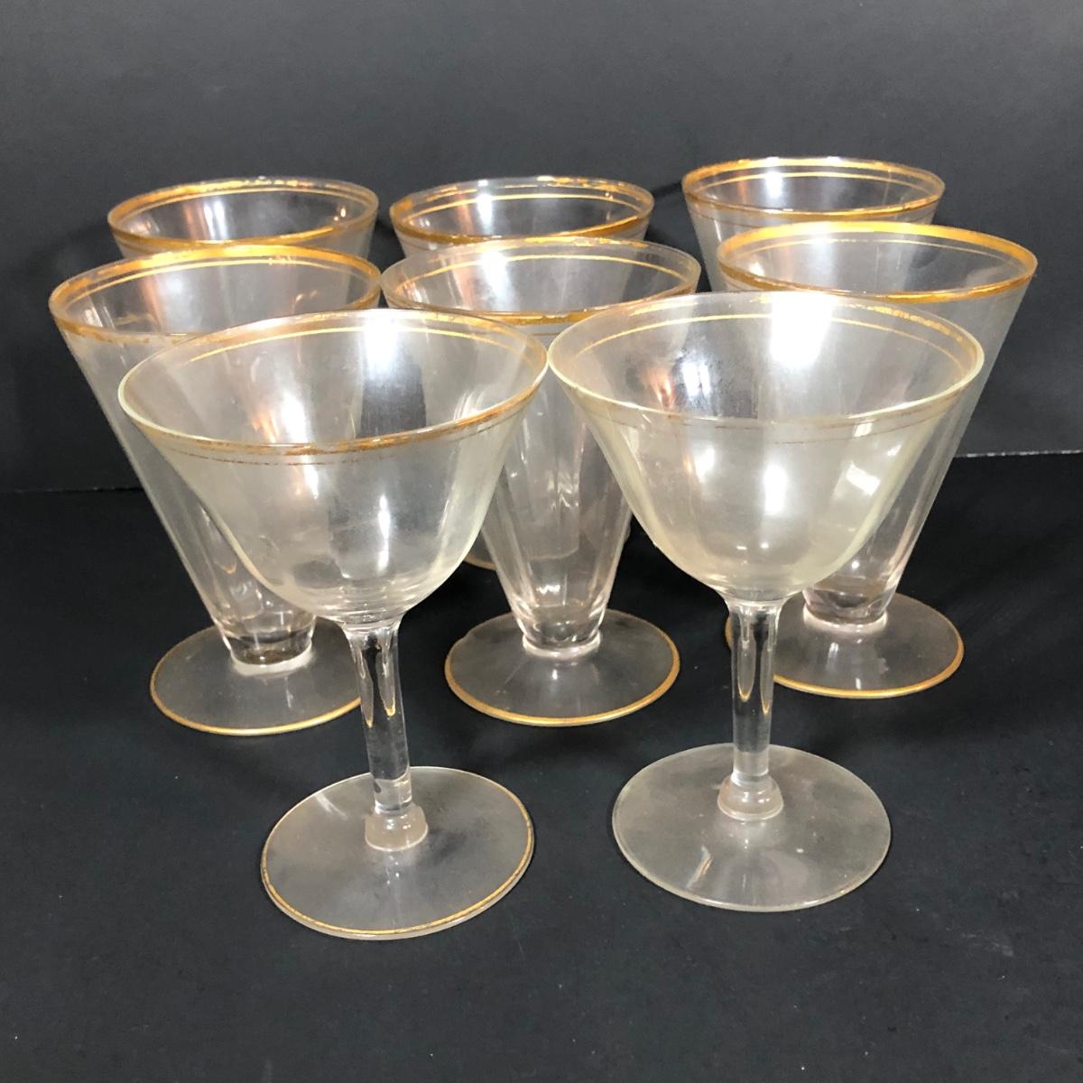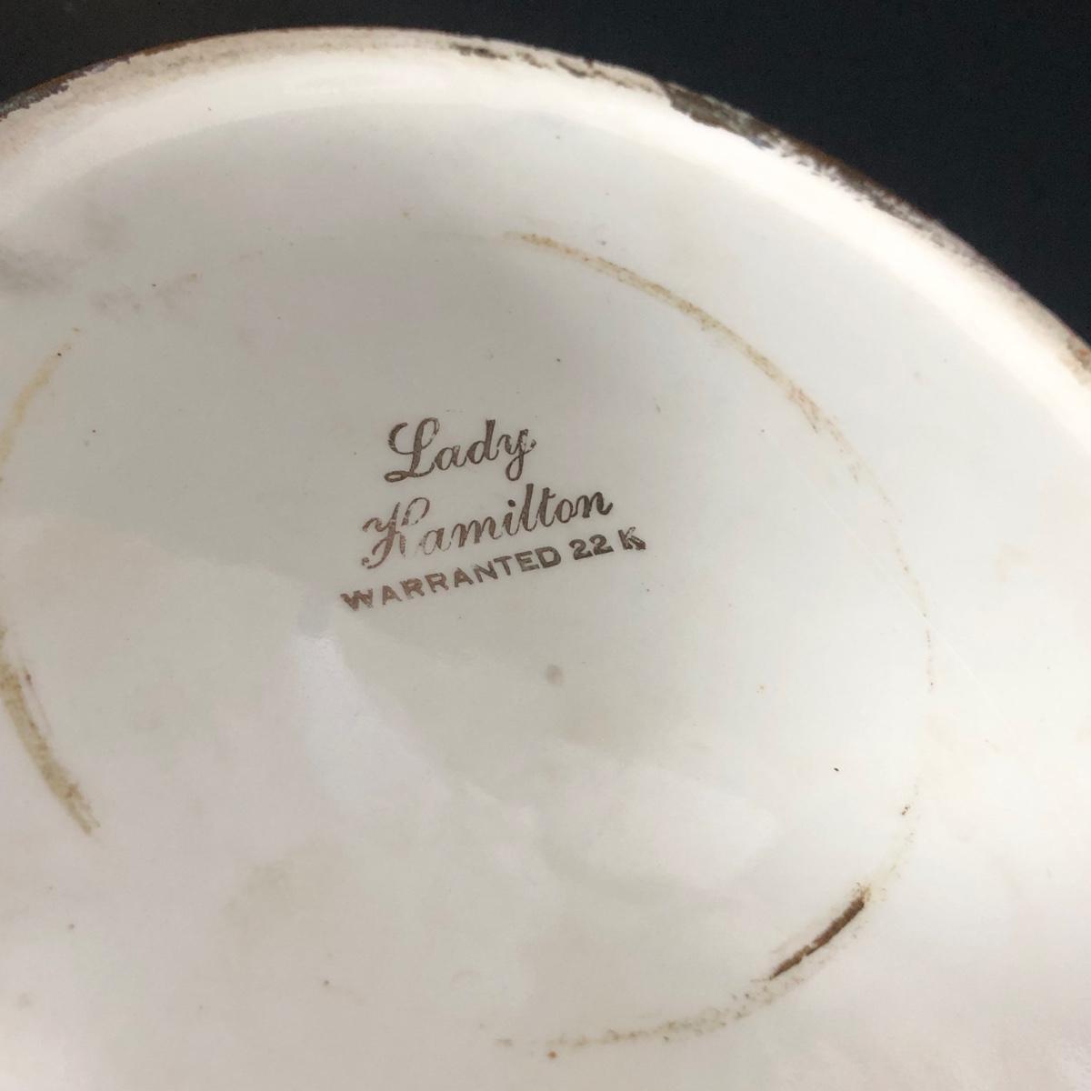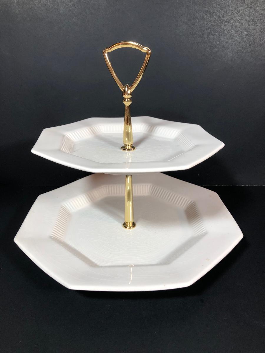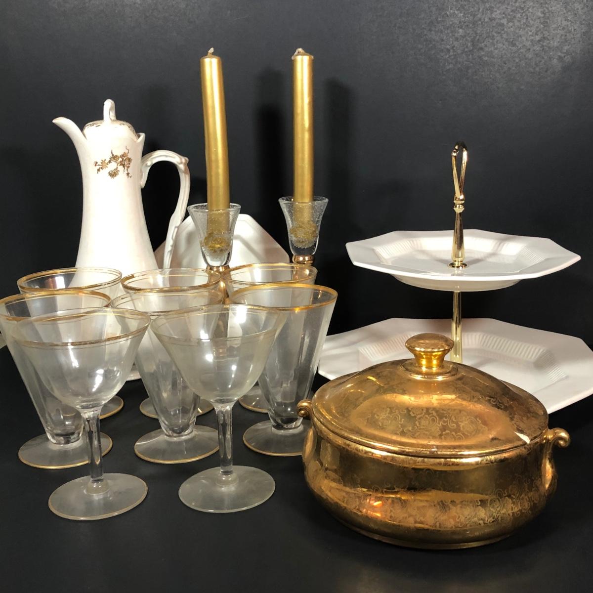 LOT 17L: Vintage Gold Rim Cocktail Glasses, Independence Ironstone Interpace Tiered Tray, Tall Teapot, Lady Hamilton 22kt Gold Painted Serving Dish & More