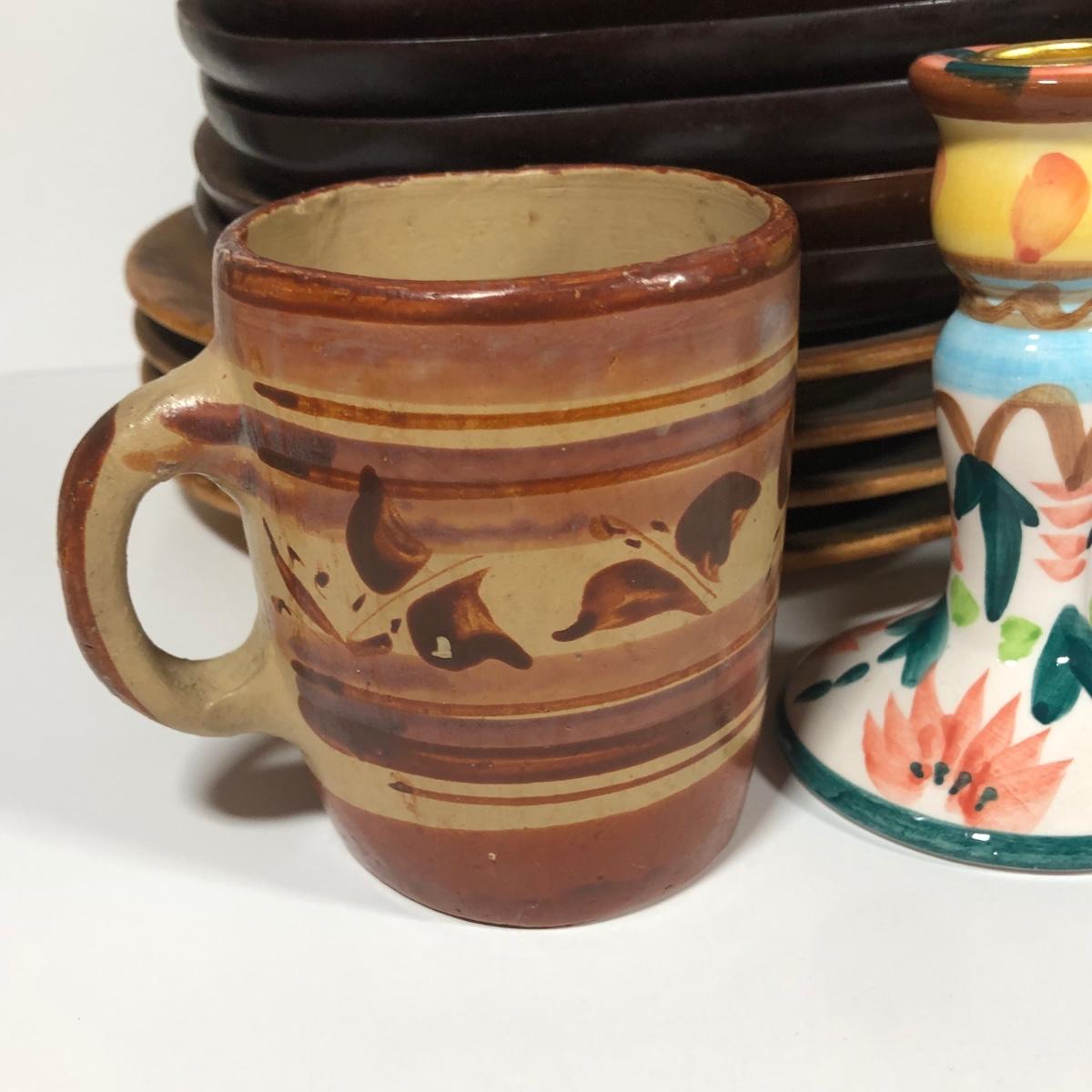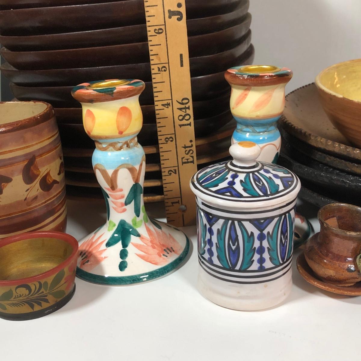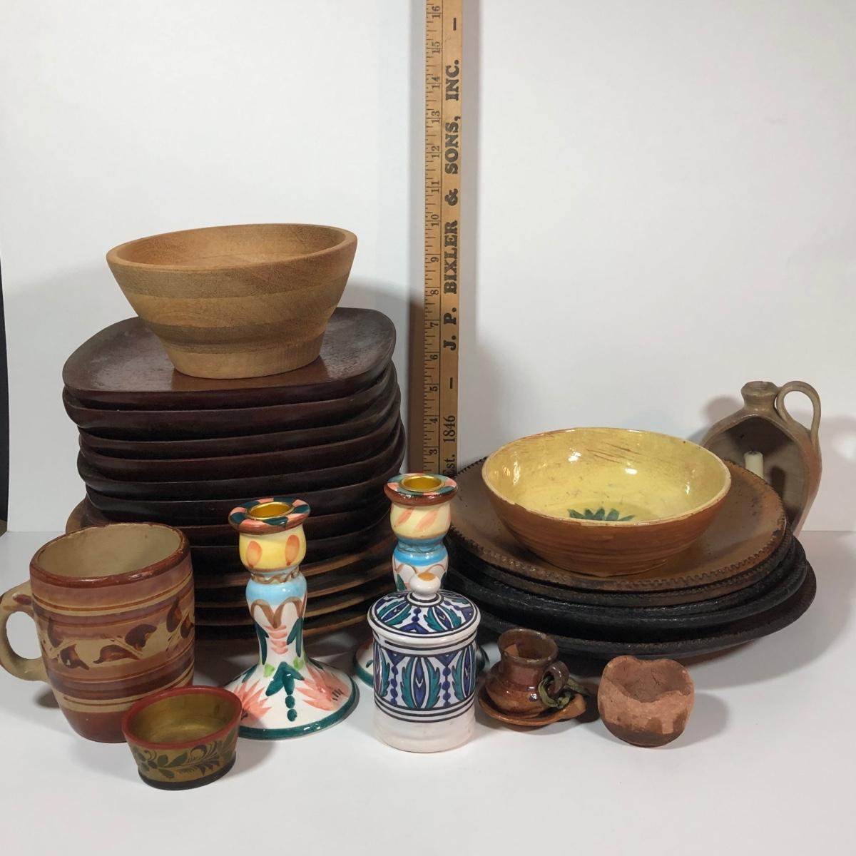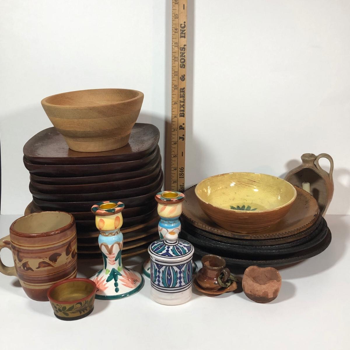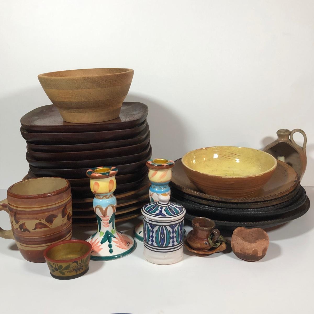 LOT 18L: Vintage Earthy Kitchen Collection - Stangl Pottery Mini Jug Candle Holder, Caribicraft Solid Mahogany Wooden Plates, Mini Pottery, Wooden Cup Made in USSR & More