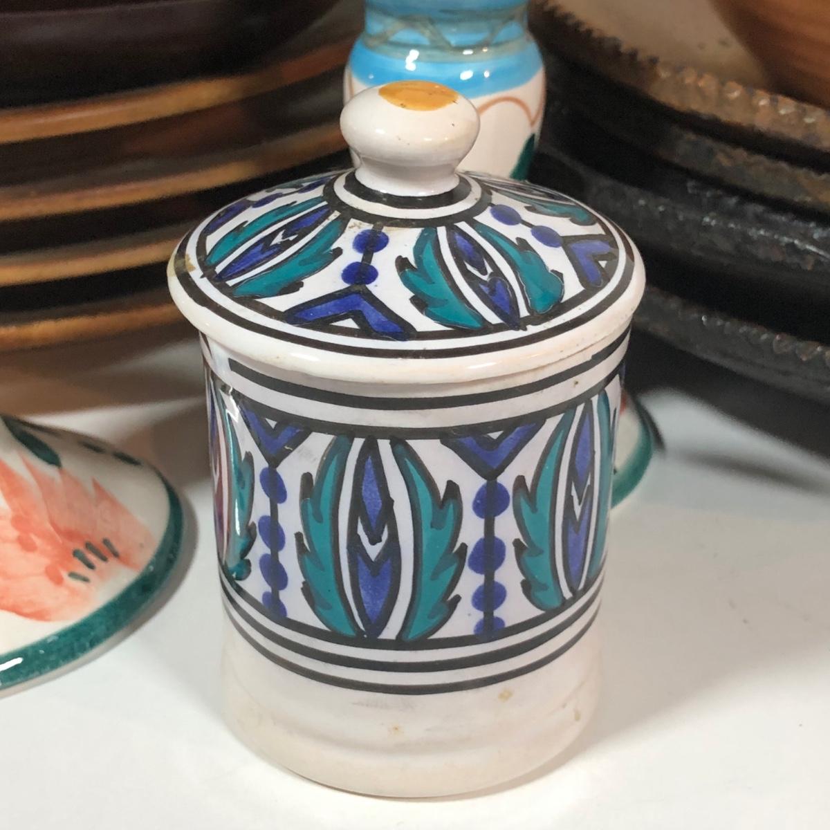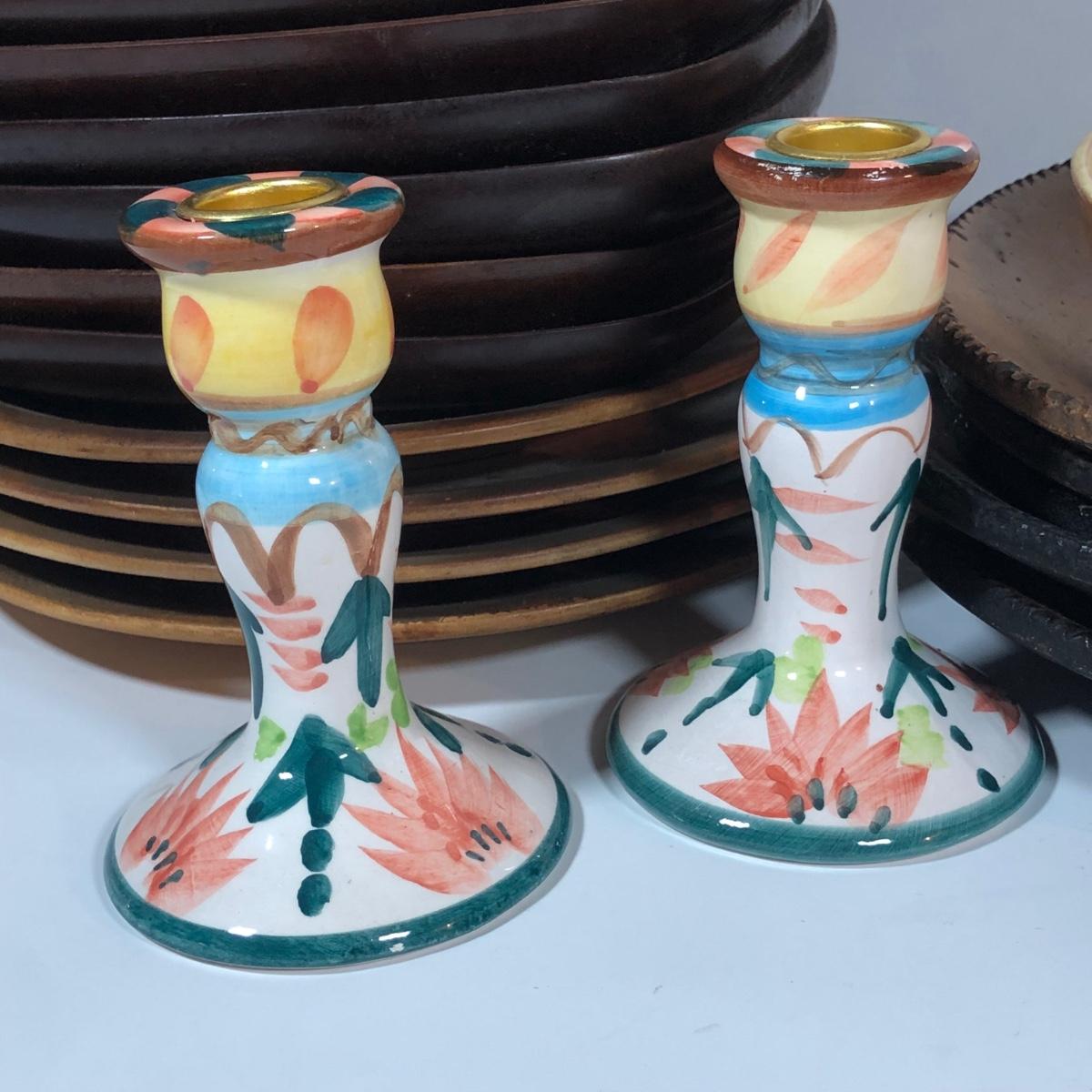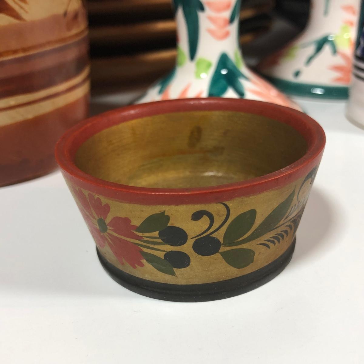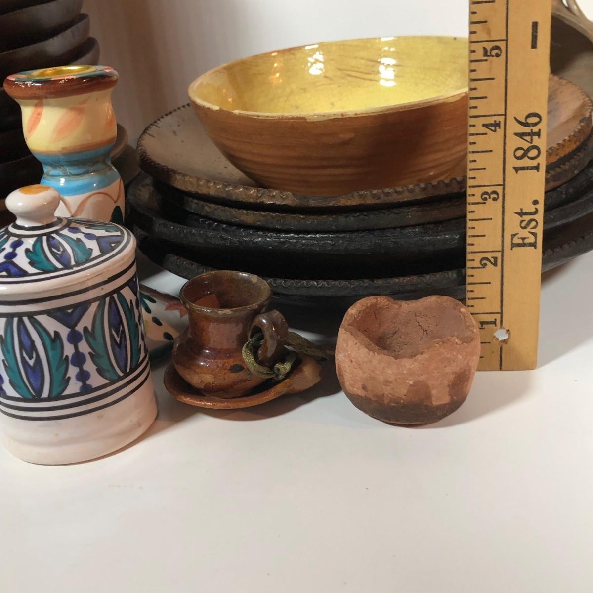 LOT 18L: Vintage Earthy Kitchen Collection - Stangl Pottery Mini Jug Candle Holder, Caribicraft Solid Mahogany Wooden Plates, Mini Pottery, Wooden Cup Made in USSR & More