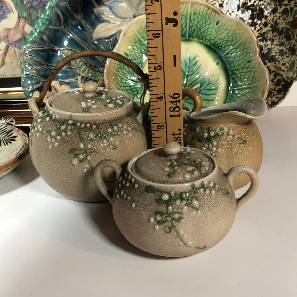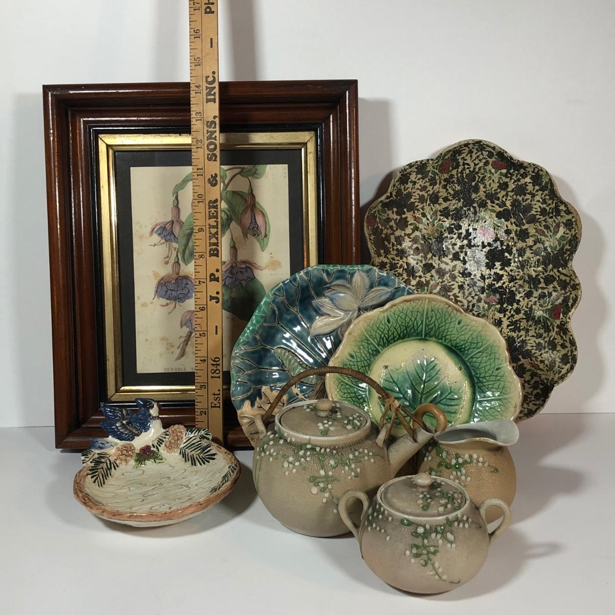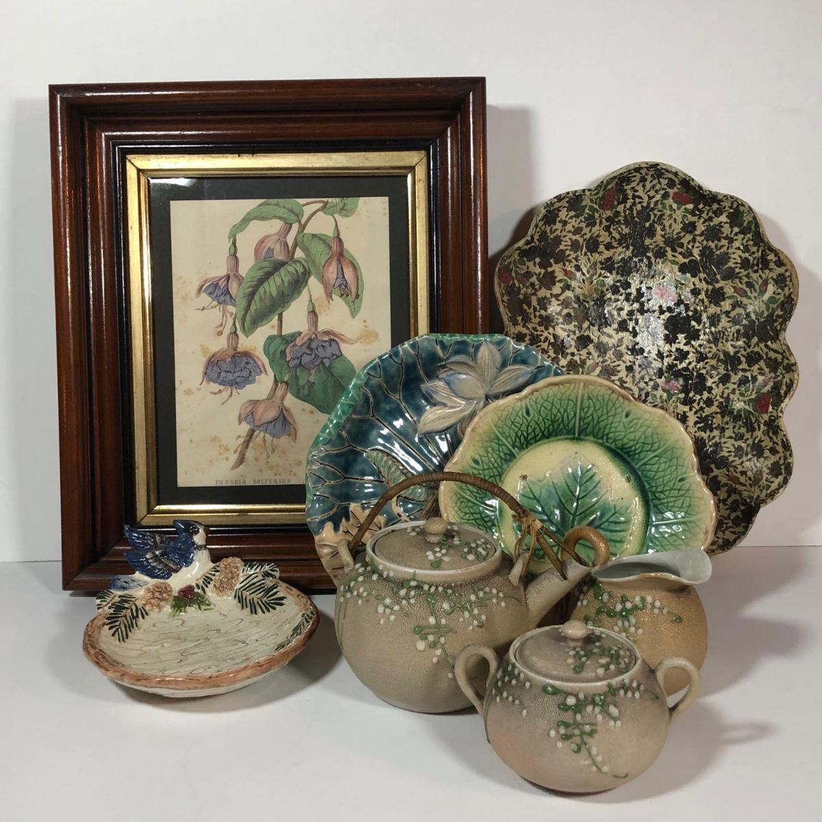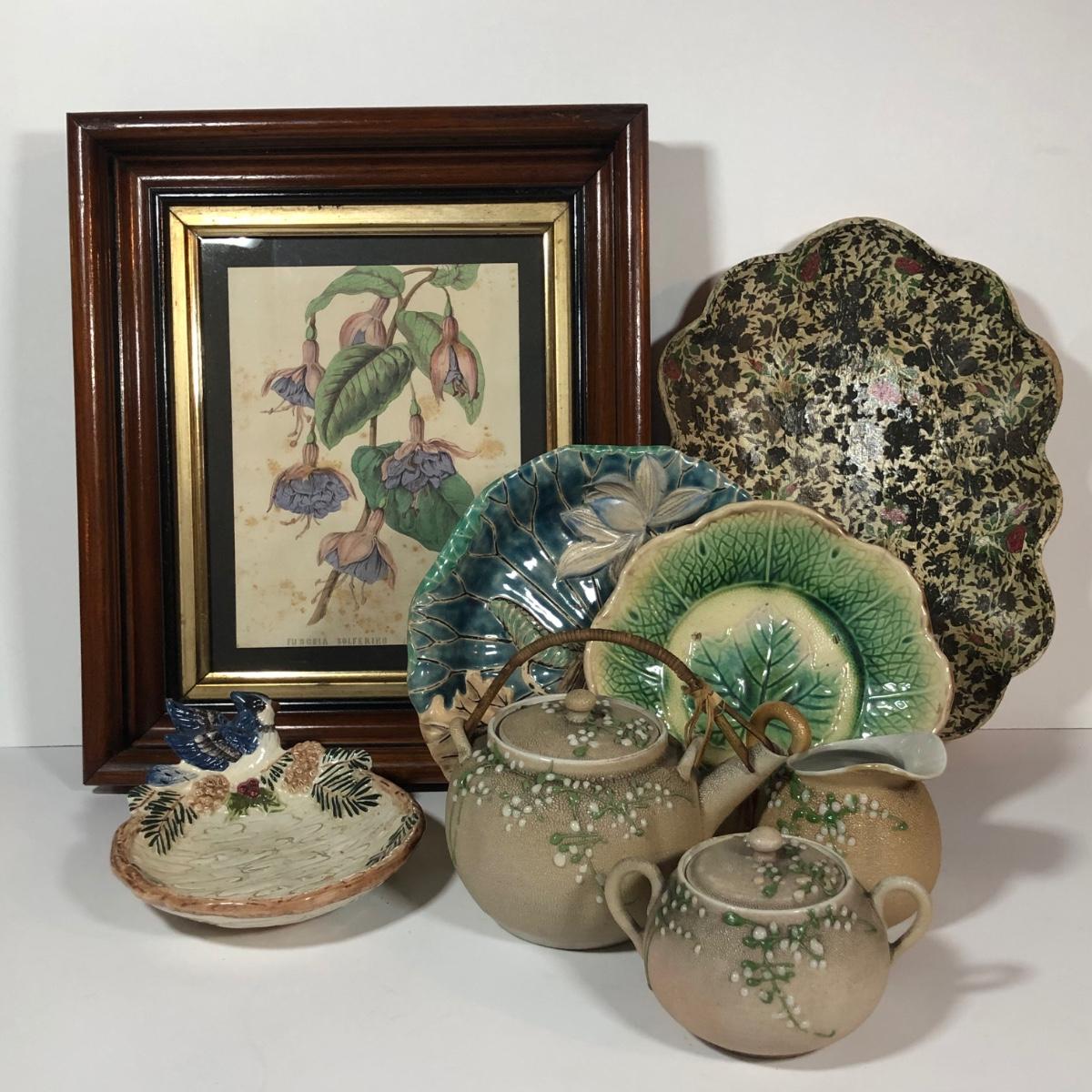 LOT 20L: Antique/Vintage Maple Leaf Majolica Plate, Vintage Japanese Majolica Plate, Japanese Moriage Meiji Teapot w/ Matching Sugar Bowl & Creamer, Framed Vintage Fuschia Solferino Print & More