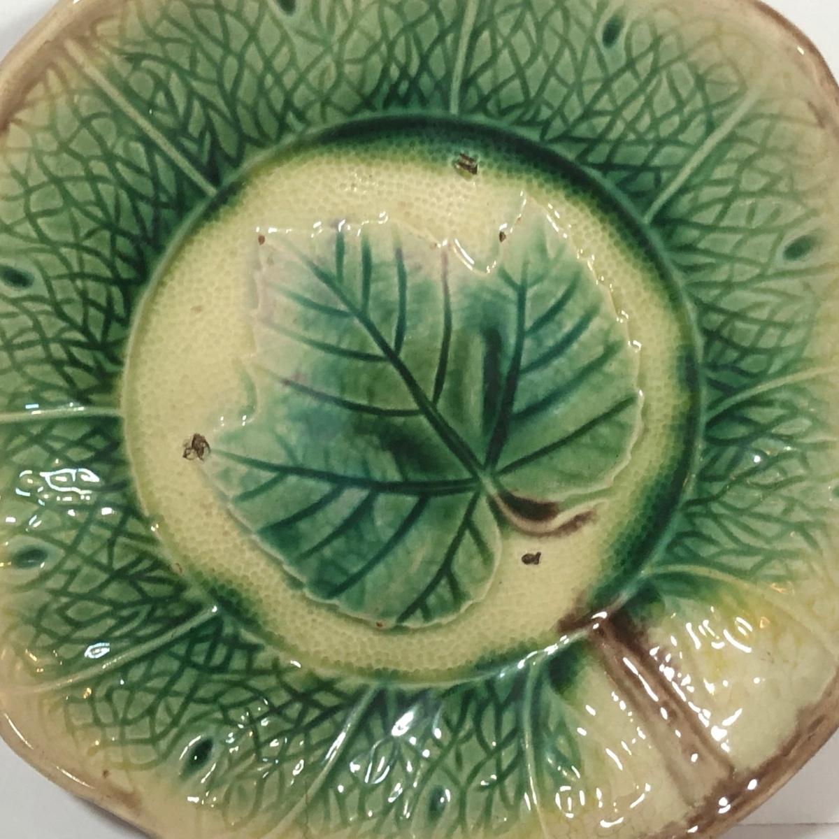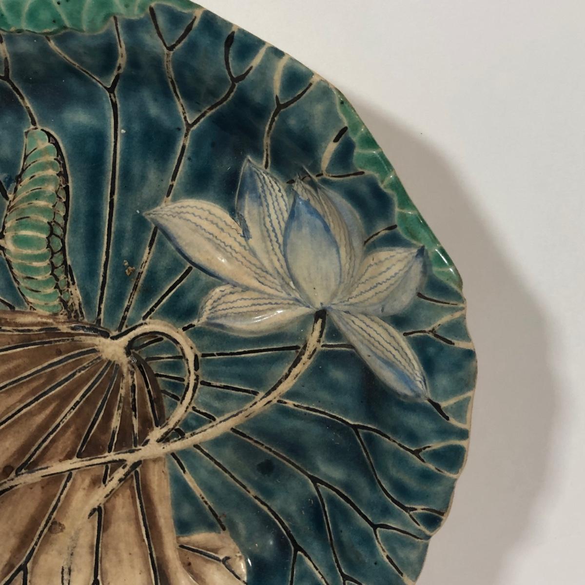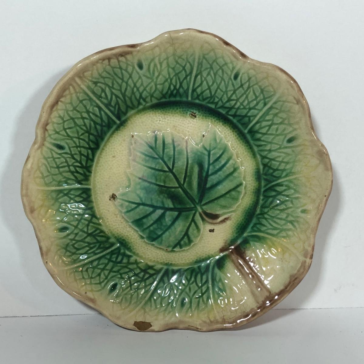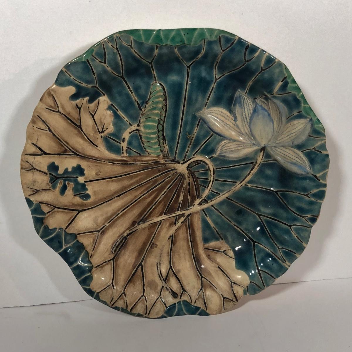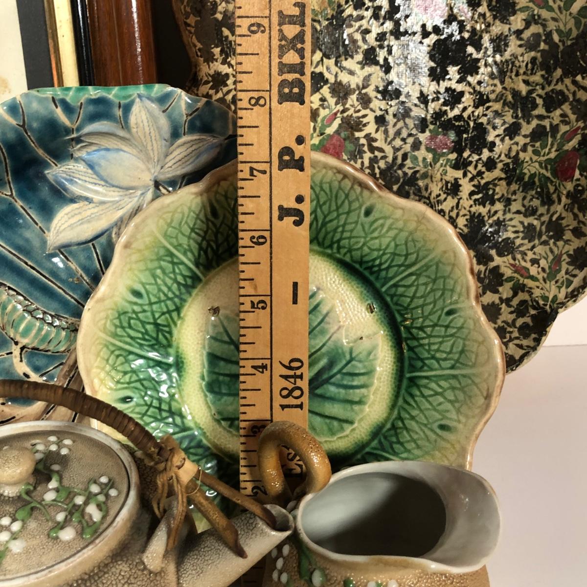 LOT 20L: Antique/Vintage Maple Leaf Majolica Plate, Vintage Japanese Majolica Plate, Japanese Moriage Meiji Teapot w/ Matching Sugar Bowl & Creamer, Framed Vintage Fuschia Solferino Print & More