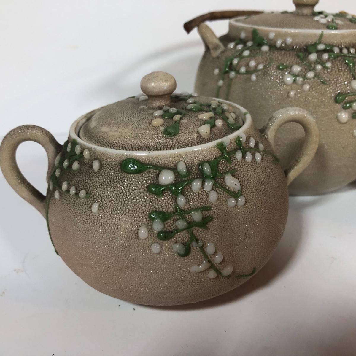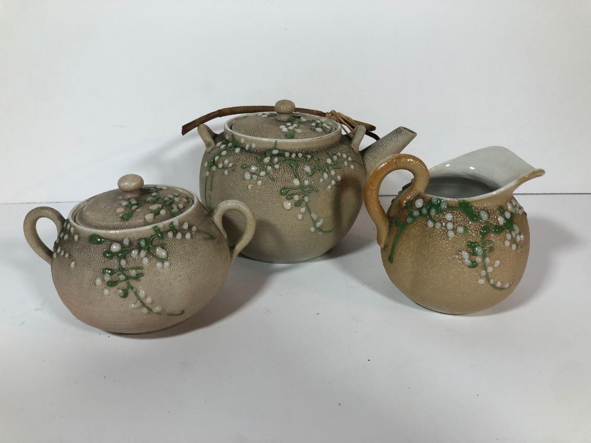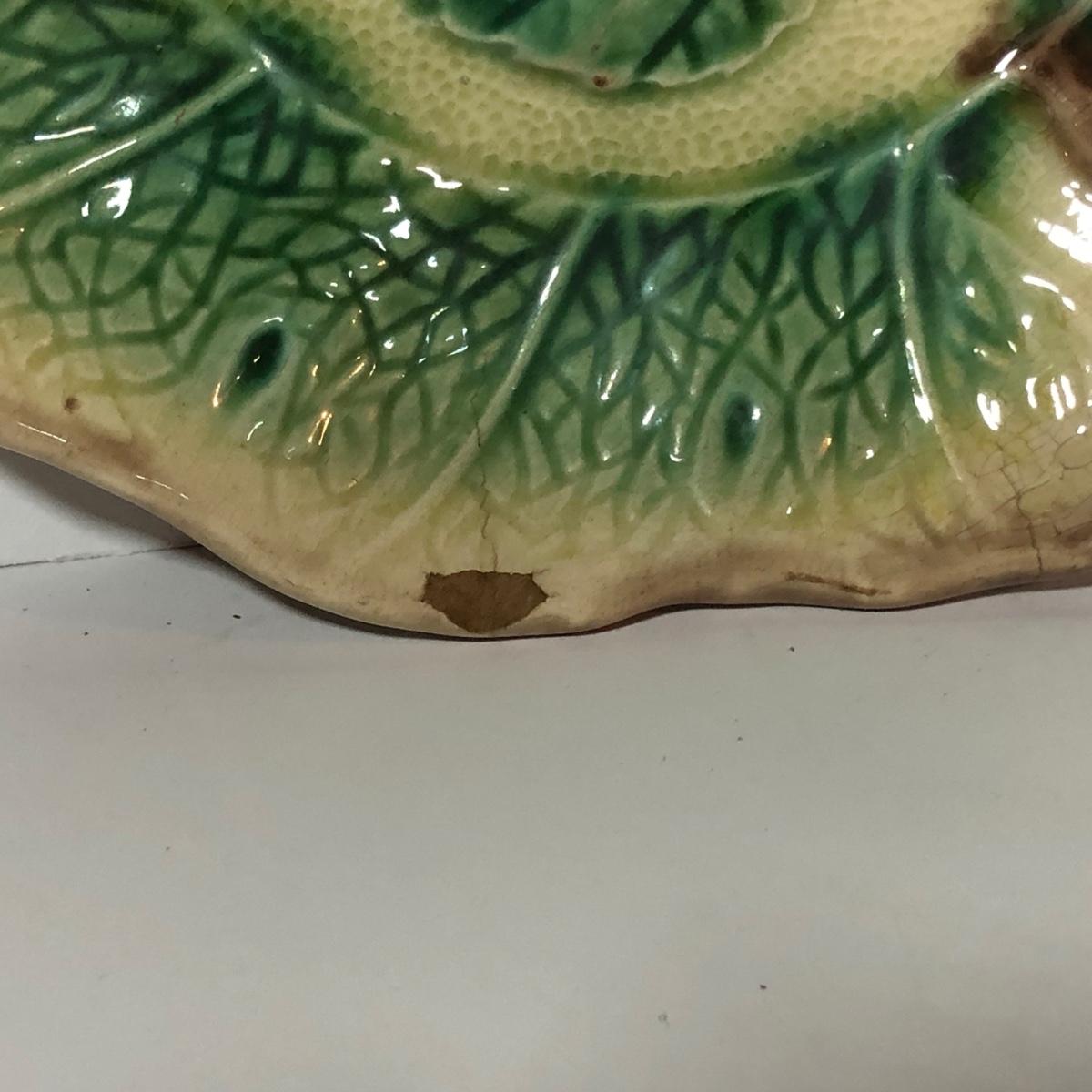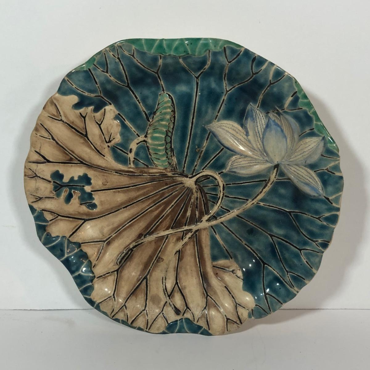 LOT 20L: Antique/Vintage Maple Leaf Majolica Plate, Vintage Japanese Majolica Plate, Japanese Moriage Meiji Teapot w/ Matching Sugar Bowl & Creamer, Framed Vintage Fuschia Solferino Print & More