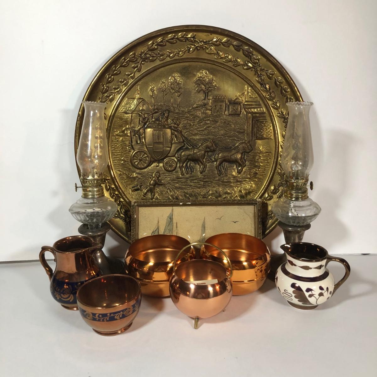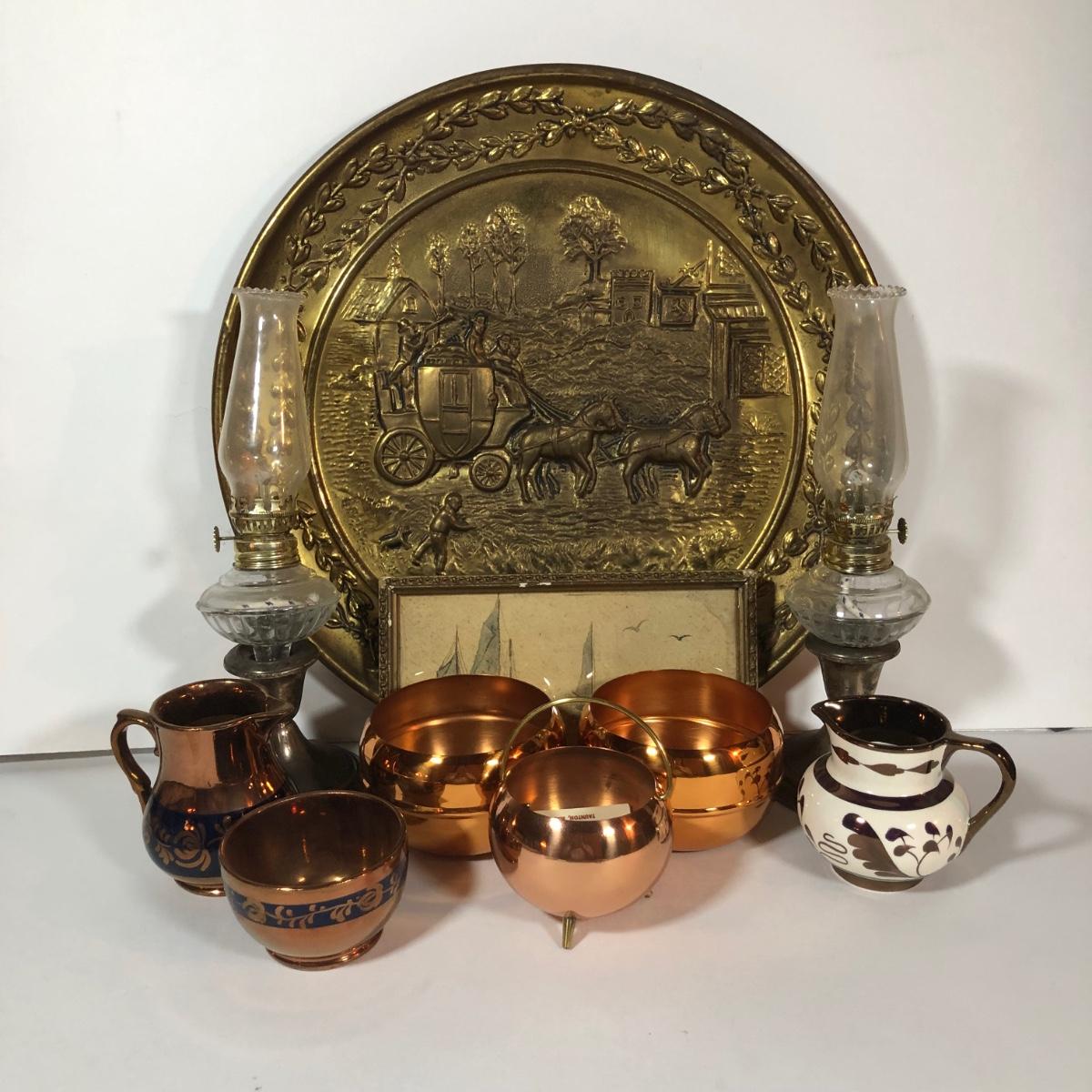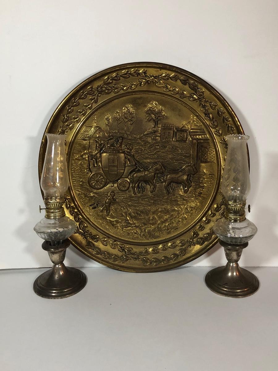 LOT 28L: Home Decor - Gorham Weighted/Reinforced Sterling Silver Candle Holders w/ Lamplight Farms Glass Oil Lamp Toppers, Coppercraft Mini Couldron, More Copper Pieces, Large Decorative Plate & More